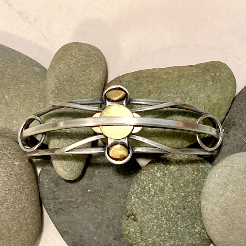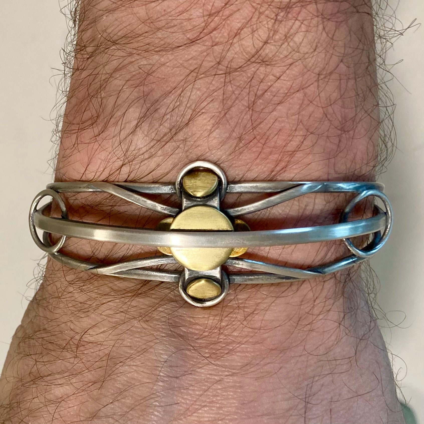 Lightly oxidized sterling silver wire is carefully hand shaped and wrapped around in three dimensions to create this one of a kind cuff, accented with a 5 brass disks.