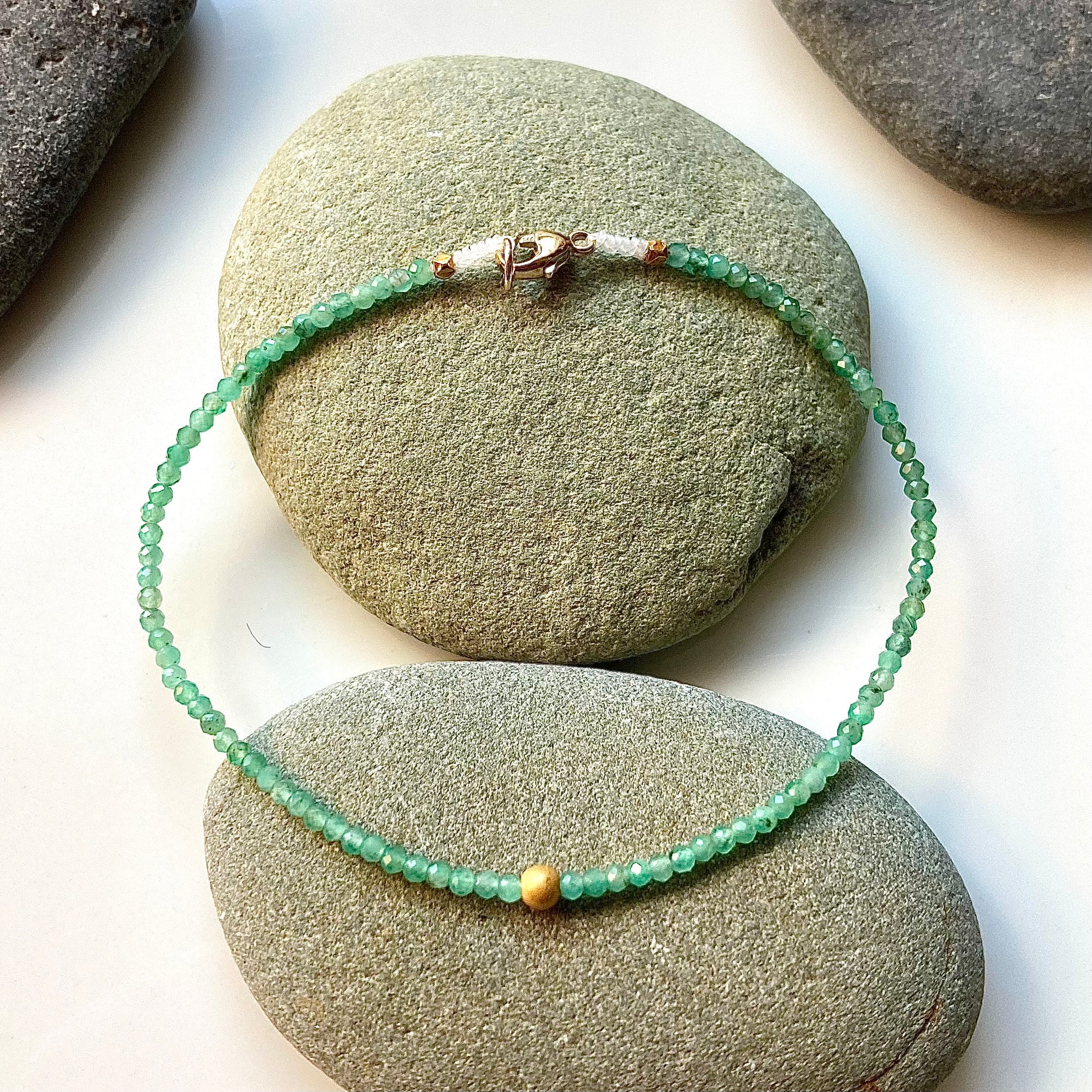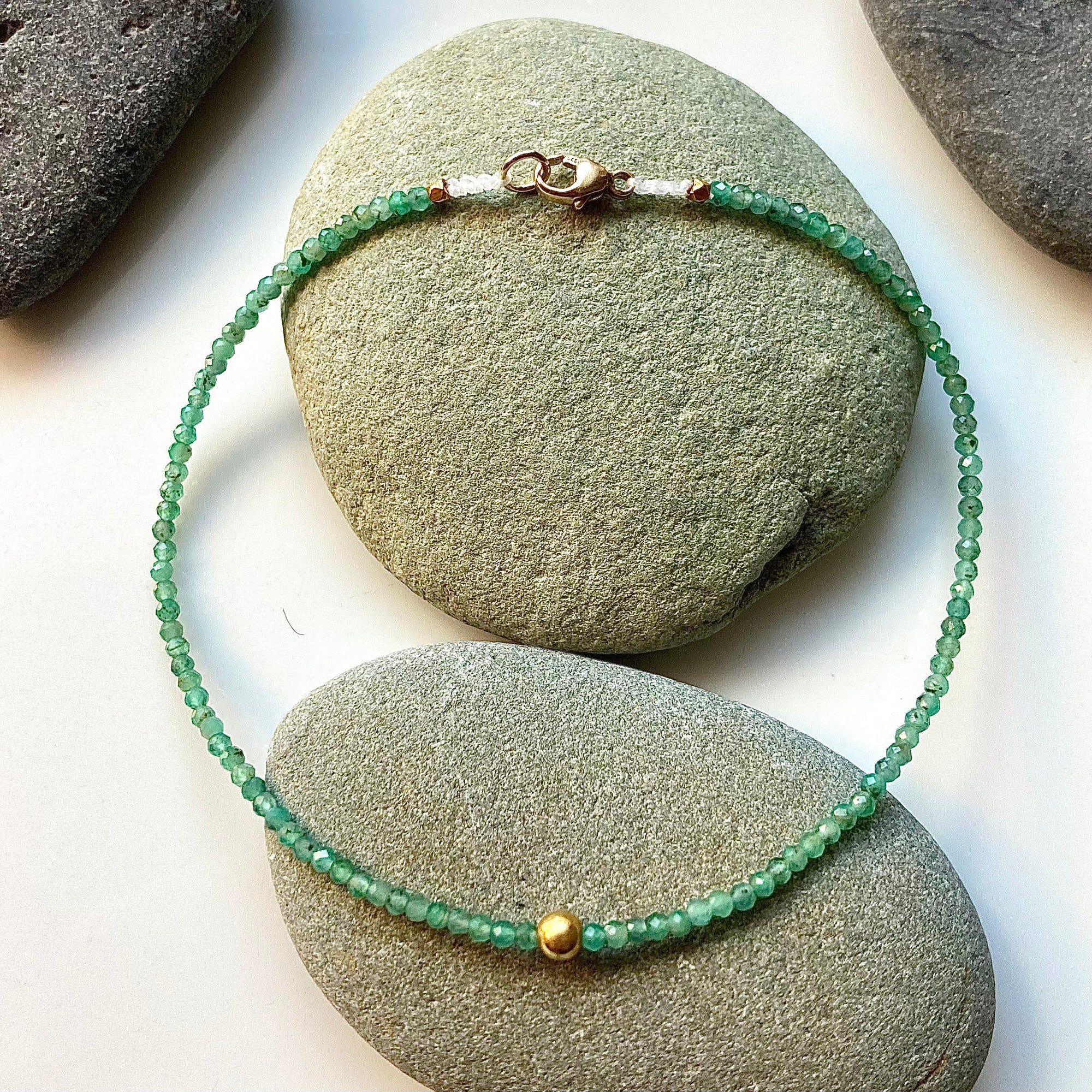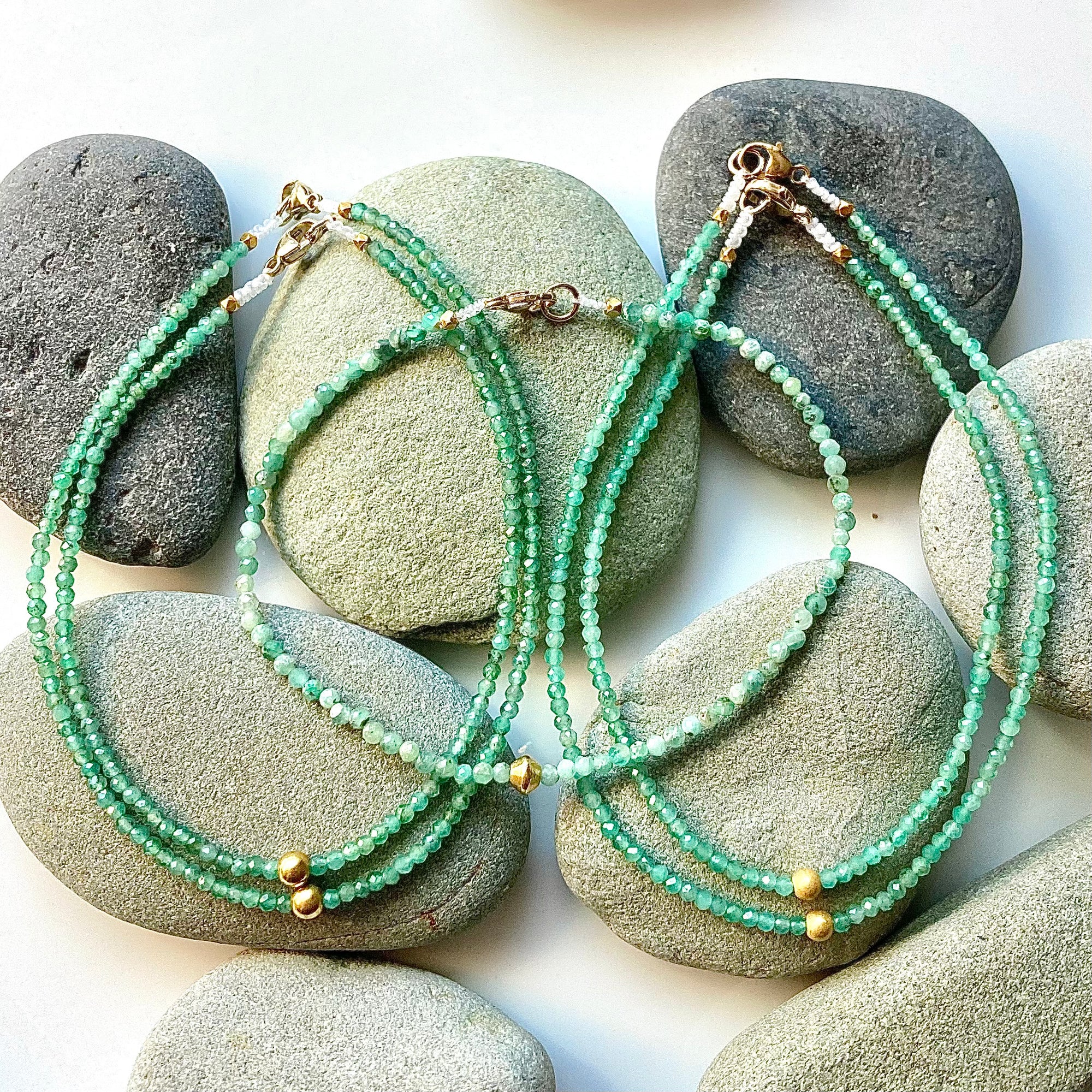 This designer collects uniquely beautiful 2mm faceted stones and allows the natural beauty of the stone to take center stage by stringing them simply on strong cording and accenting them with 18K gold faceted beads.