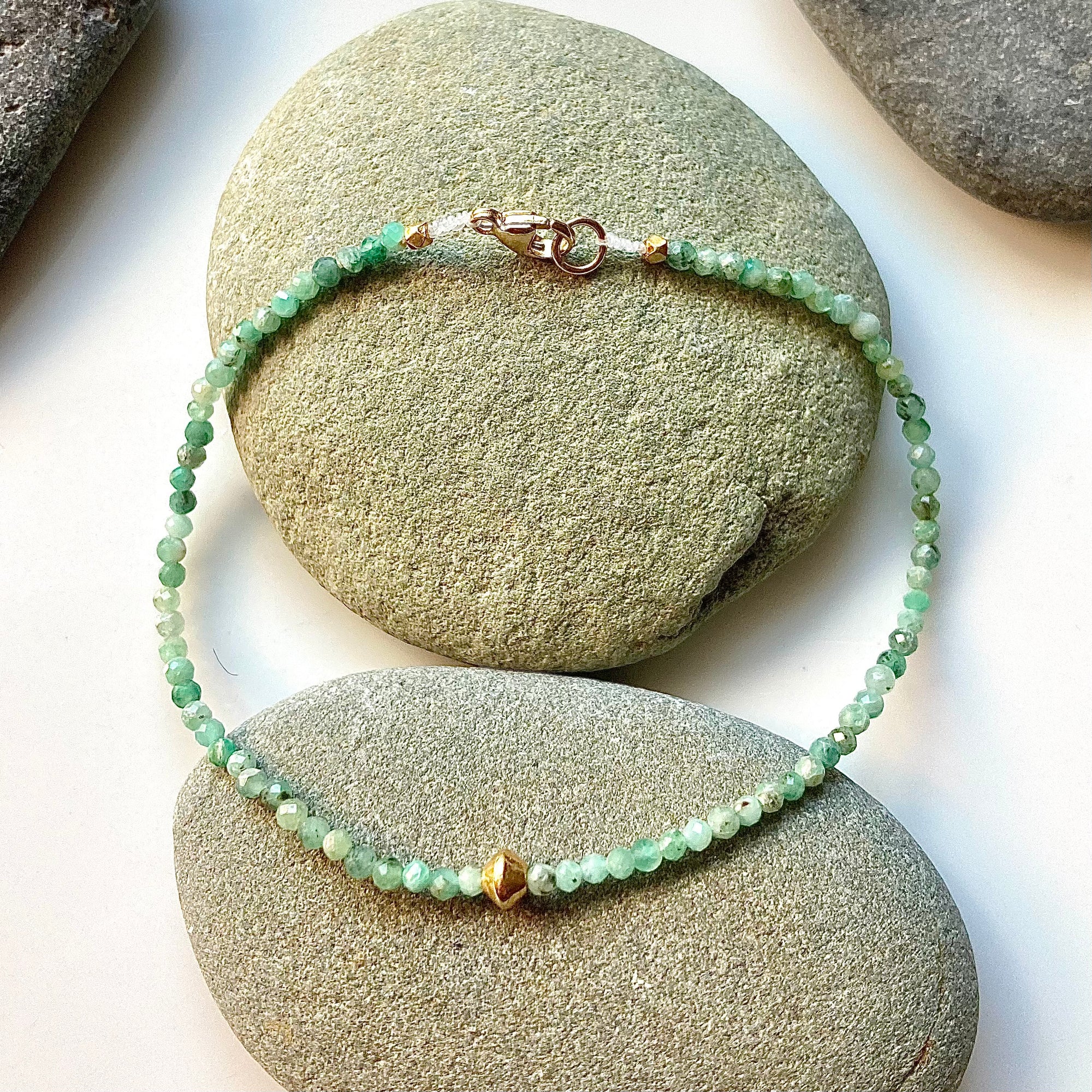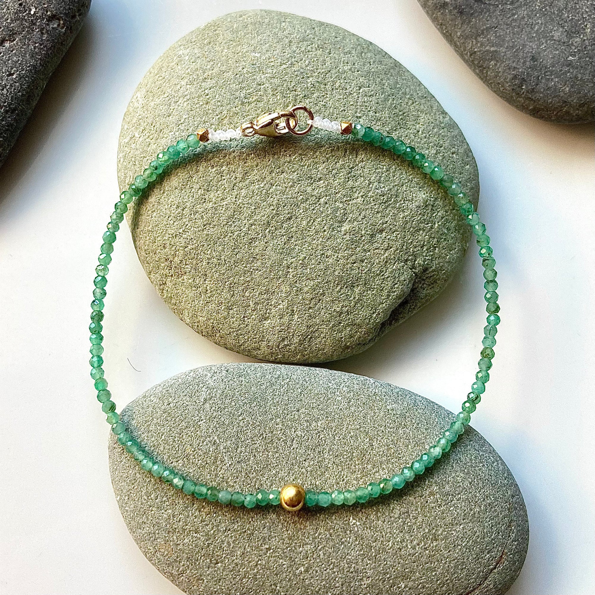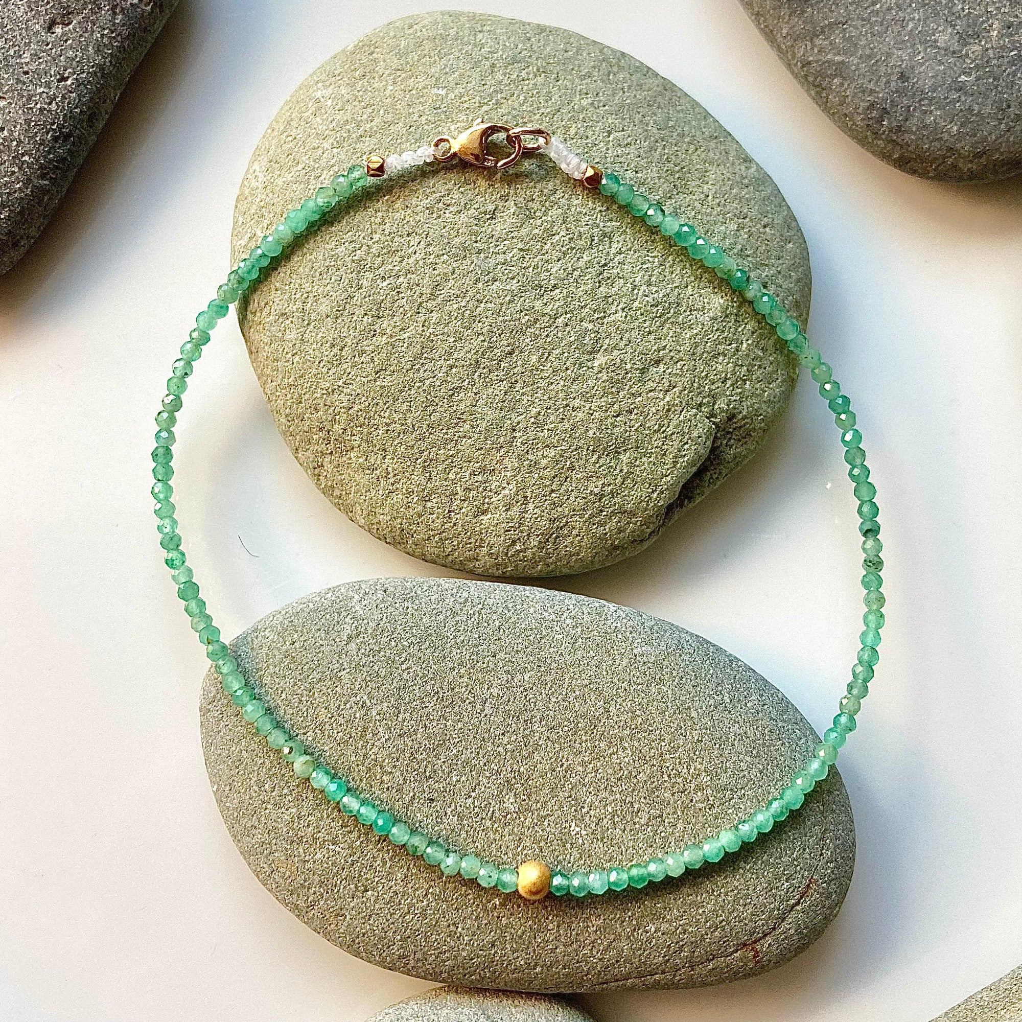 This designer collects uniquely beautiful 2mm faceted stones and allows the natural beauty of the stone to take center stage by stringing them simply on strong cording and accenting them with 18K gold faceted beads.