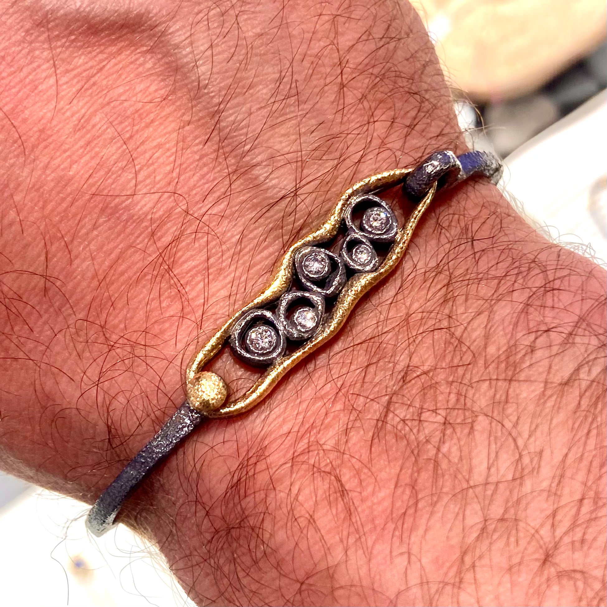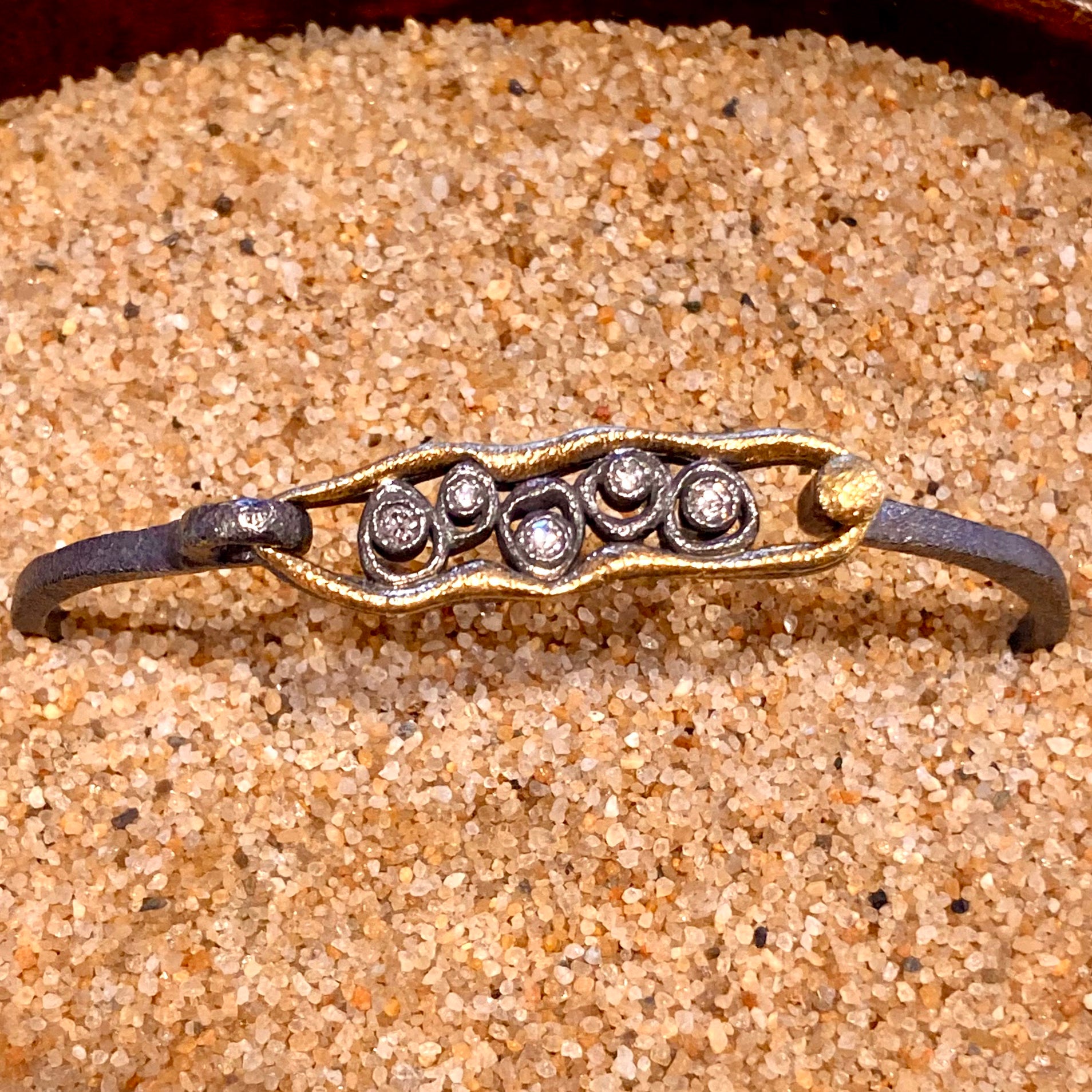Five diamonds (.23 total carats) float within oxidized, textured sterling silver pebbles, surrounded by an 18 karat gold "pond". With a wonderfully easy and very secure loop clasp at the top, accented with gold, on a beautifully organically shaped oxidized, textured sterling silver bracelet, this piece could be an every day piece or a very special occasion piece, your choice.