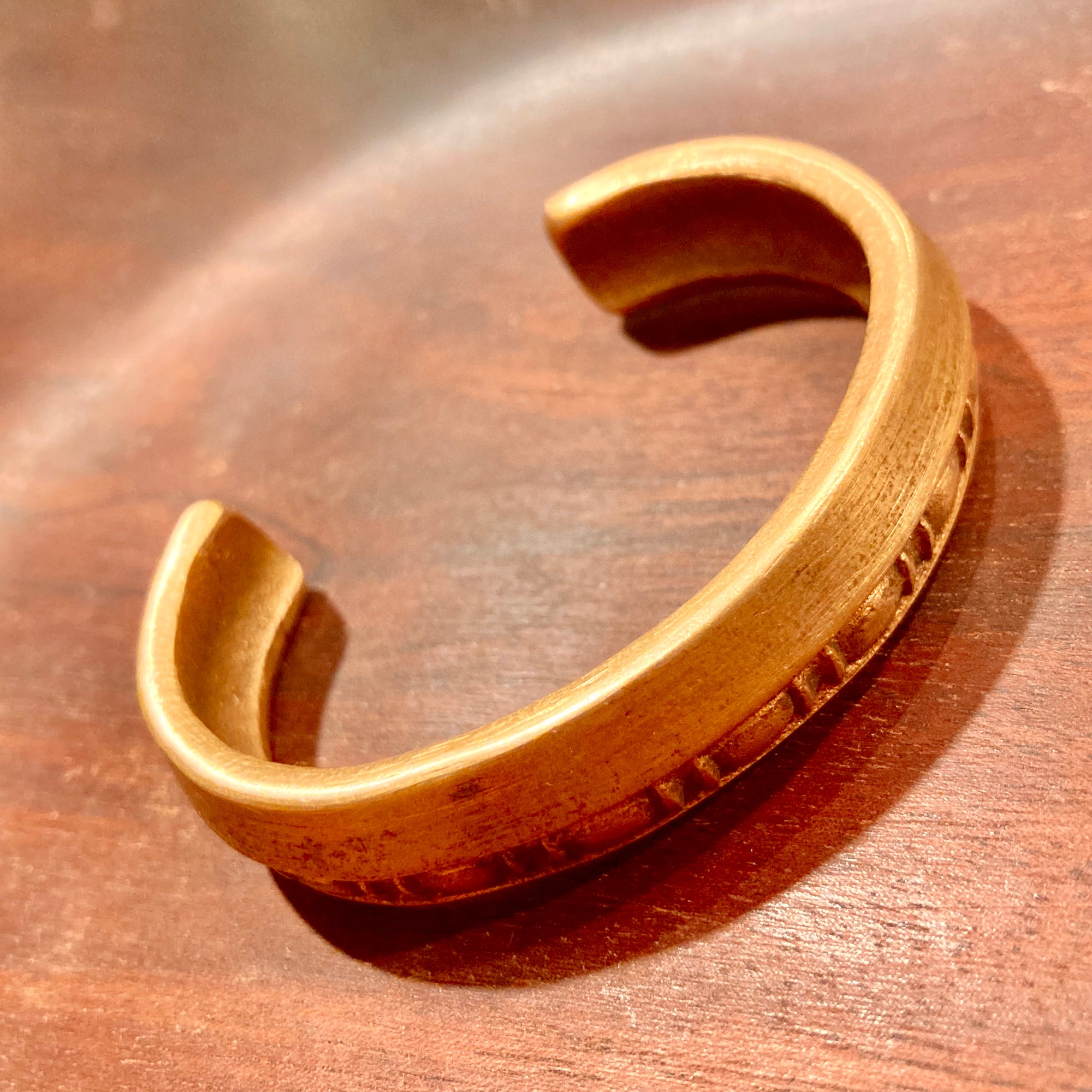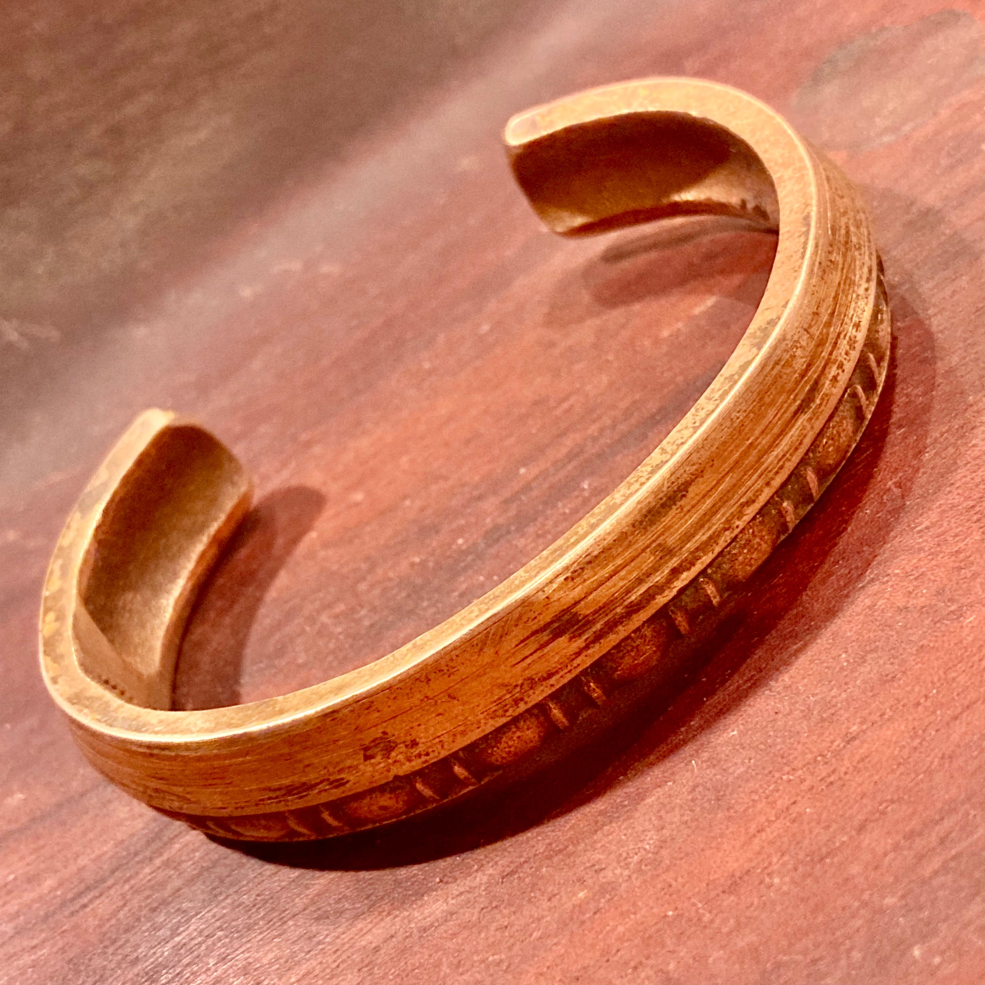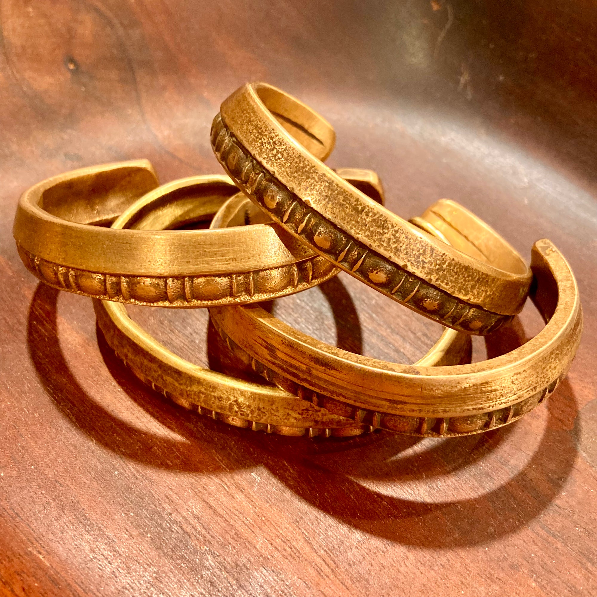 Cuffs measure 1/2" in width, weigh approximately 2 ounces, and are not easily adjusted as they are made from solid bronze. The medium size fits my wrist perfectly; the small should fit most smaller wrists comfortably.