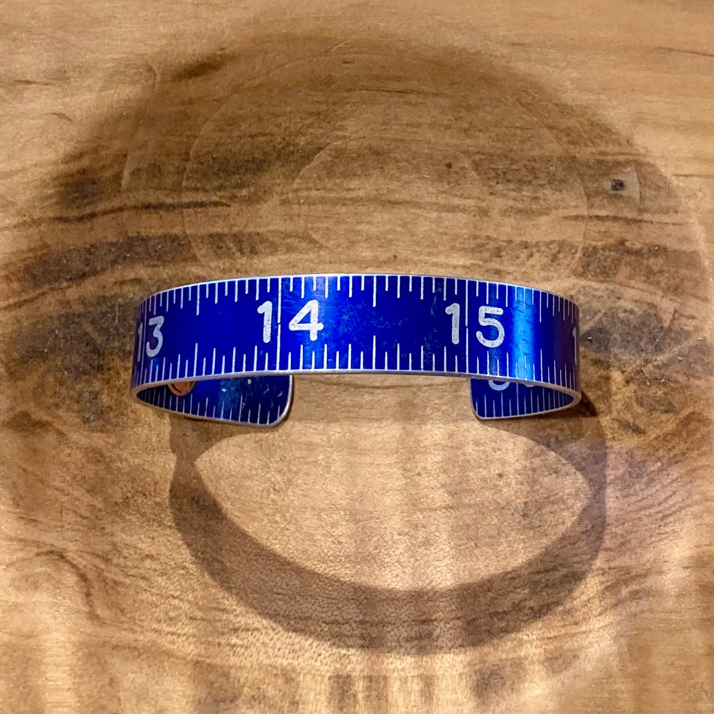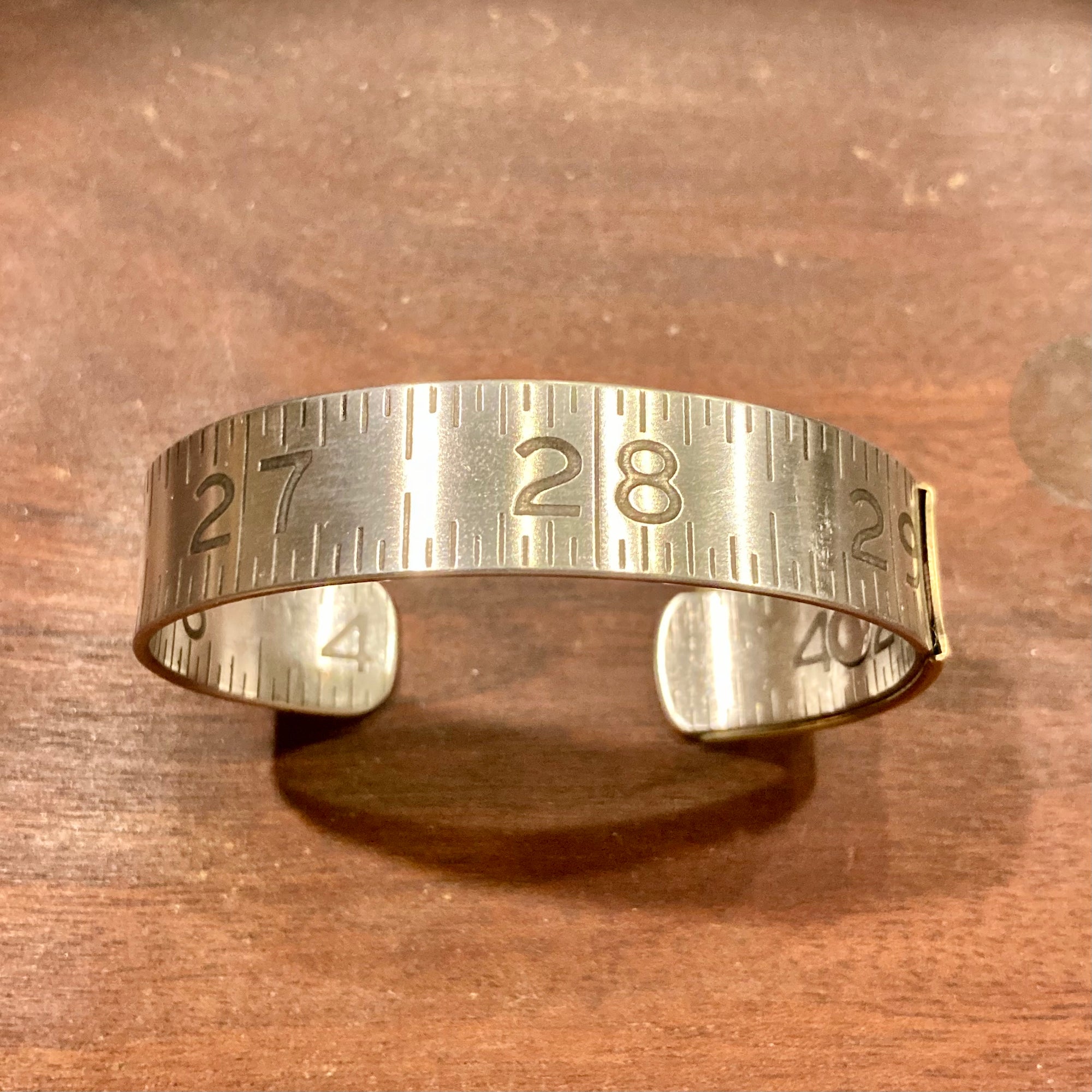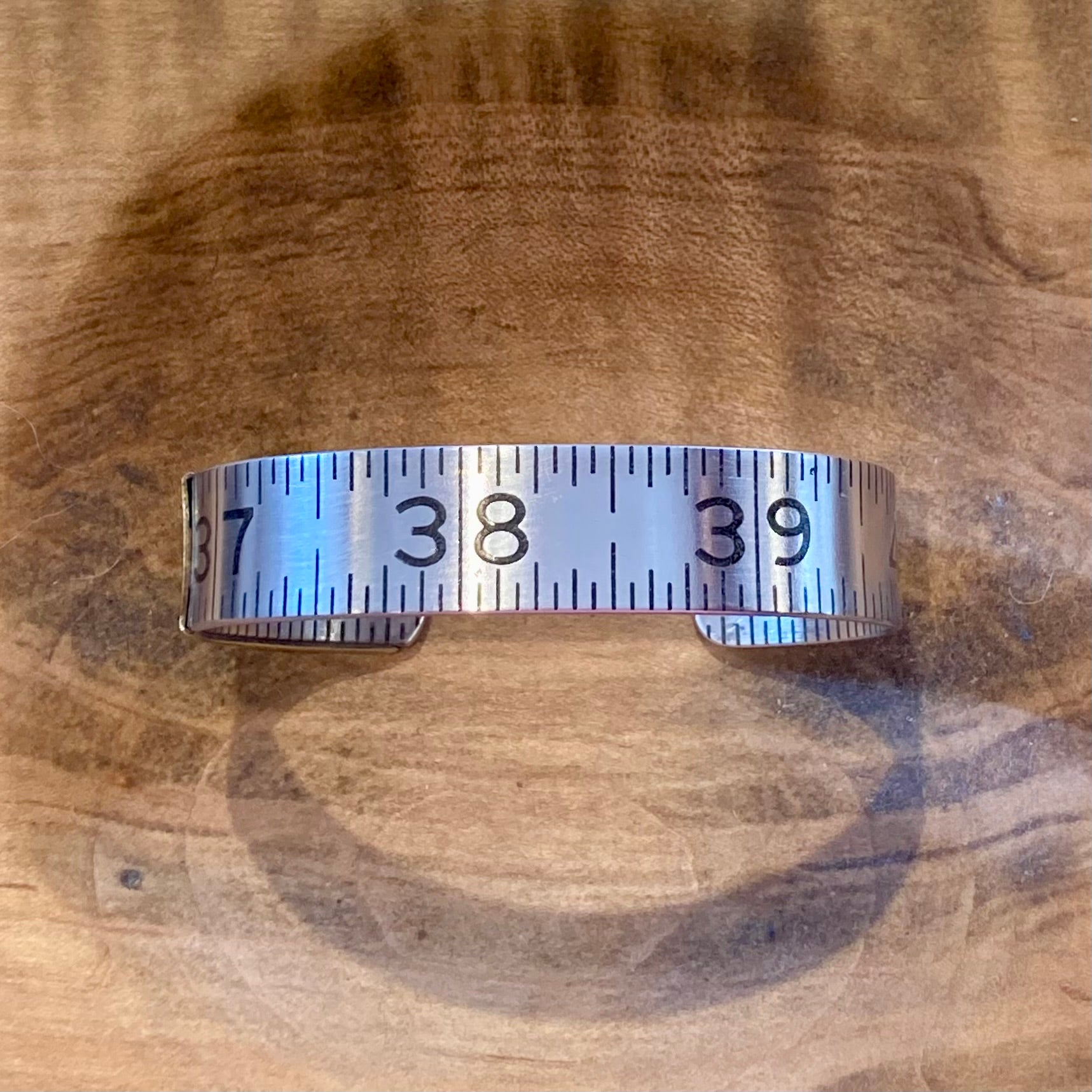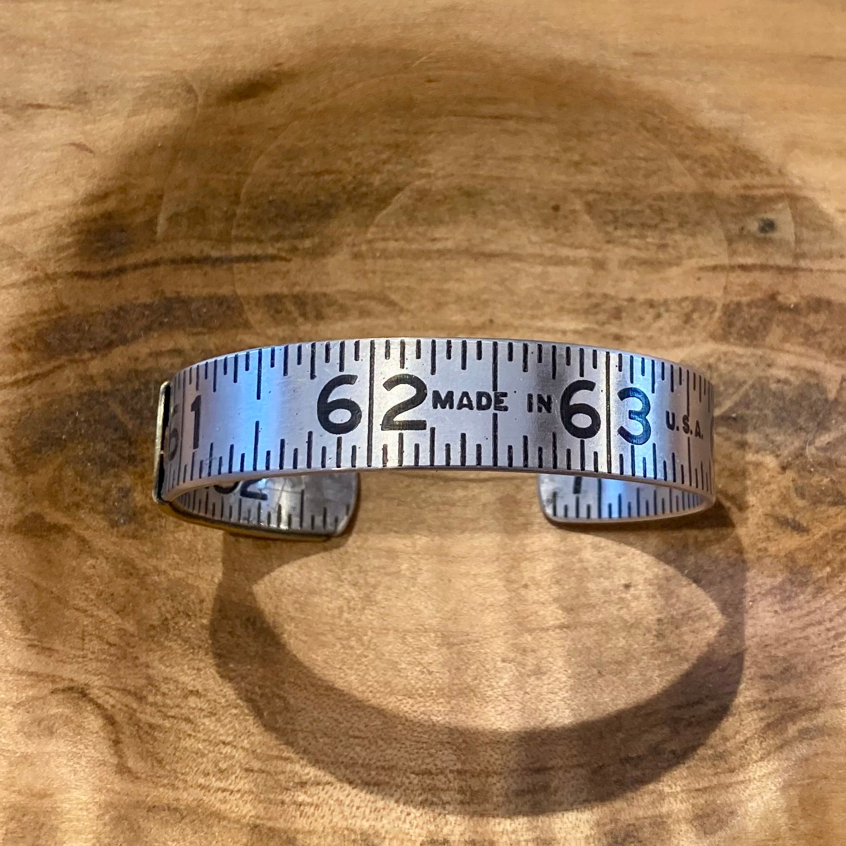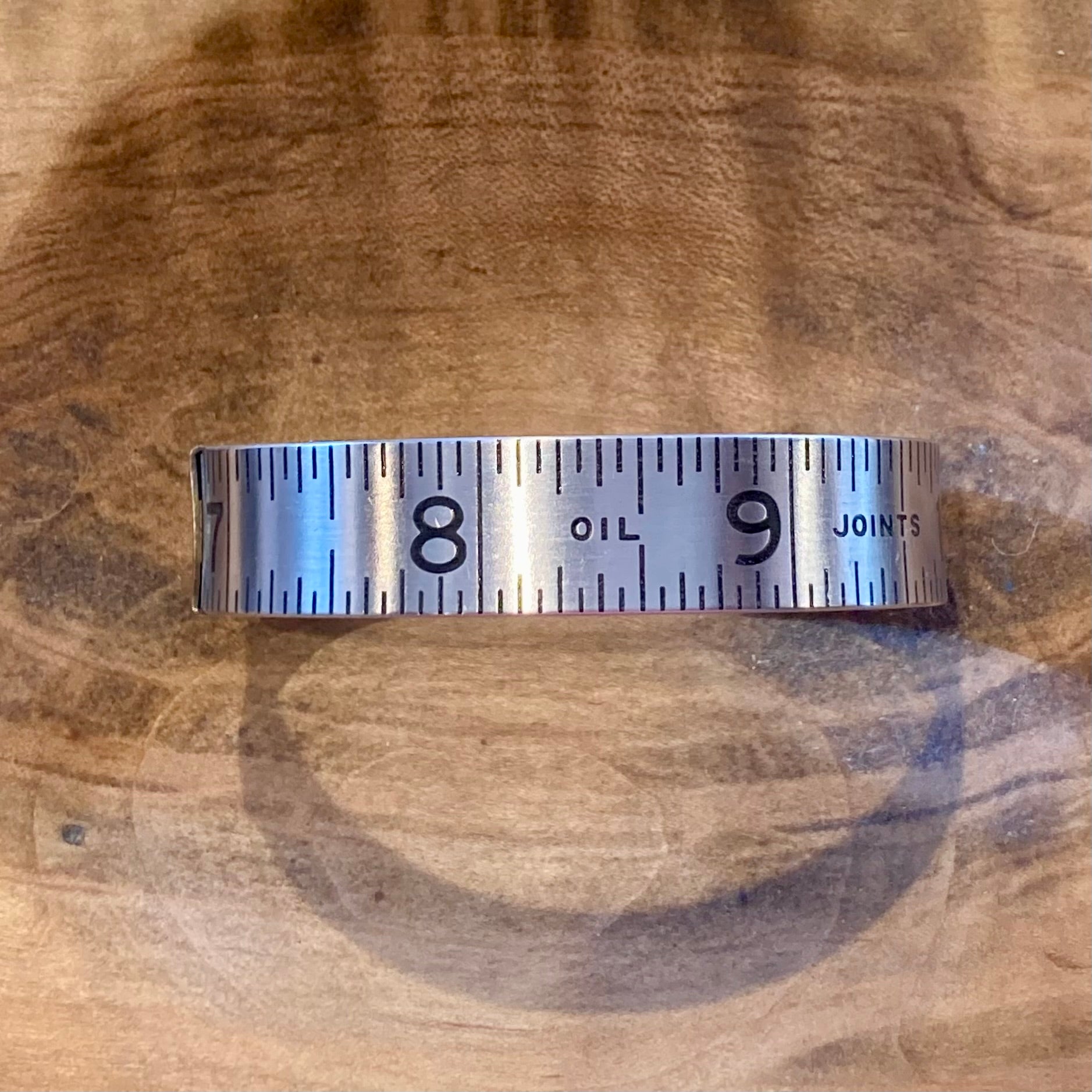 Old (pre-WWII) aluminum carpenters rulers are carefully cleaned, cut, forged and given new life as a fun and functional cuff.