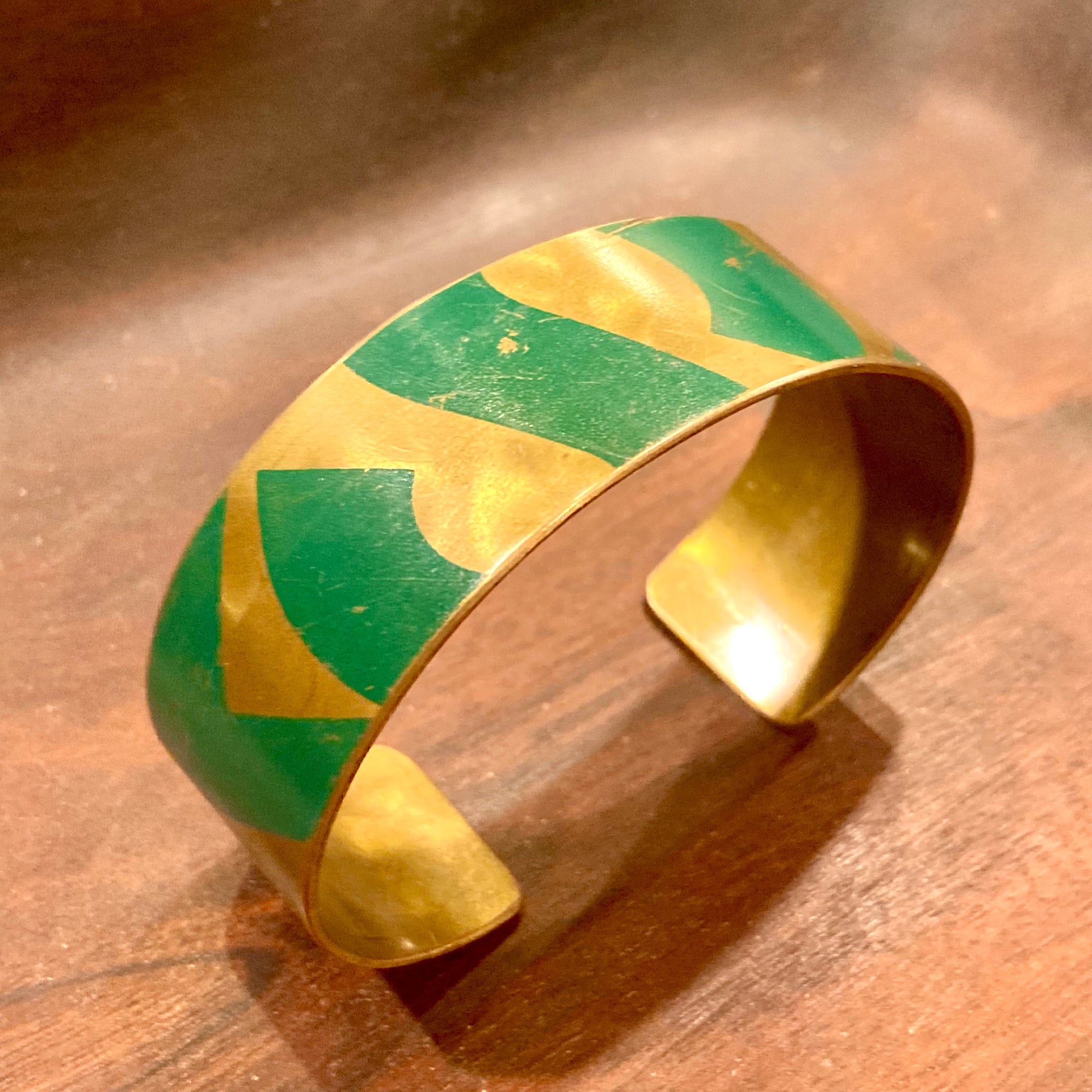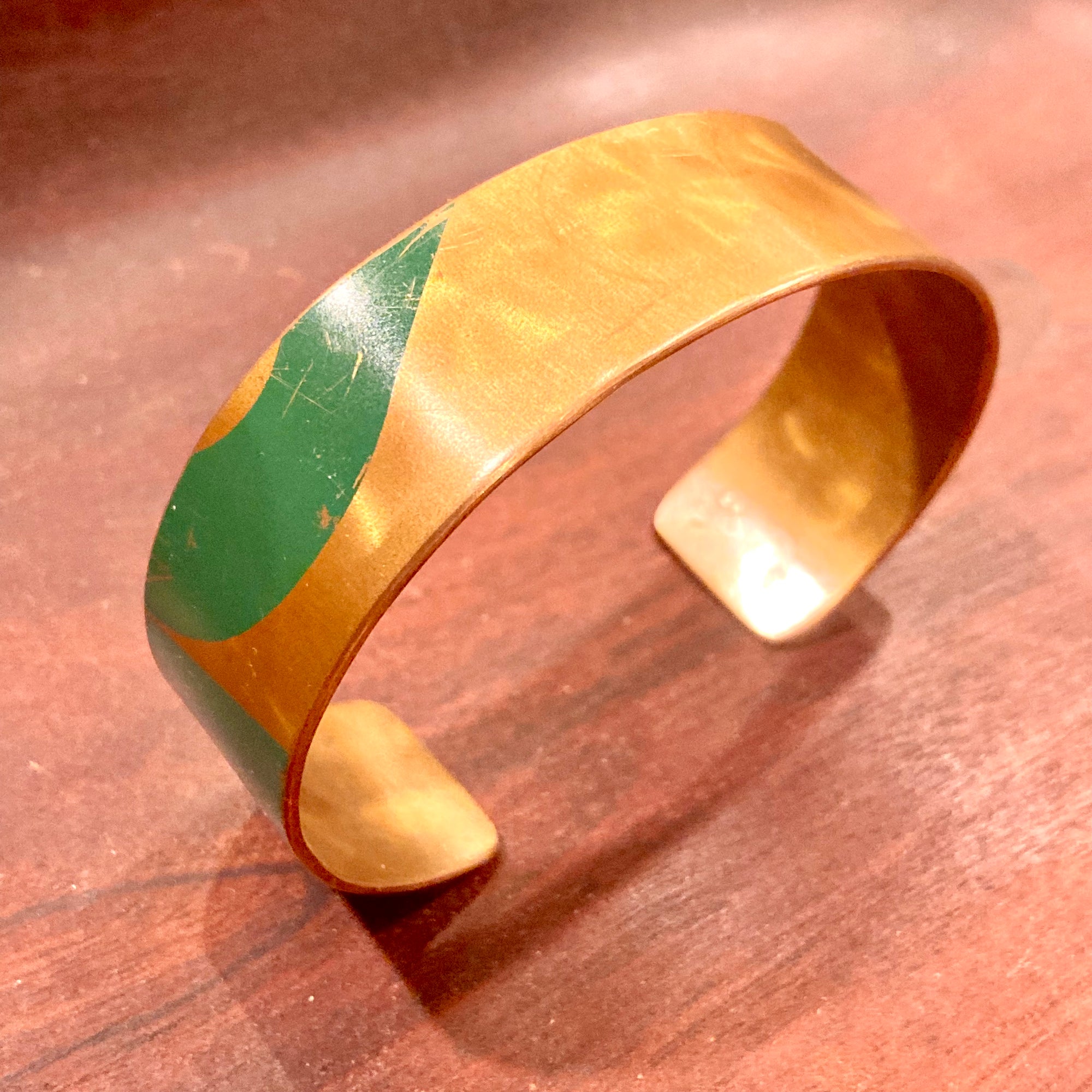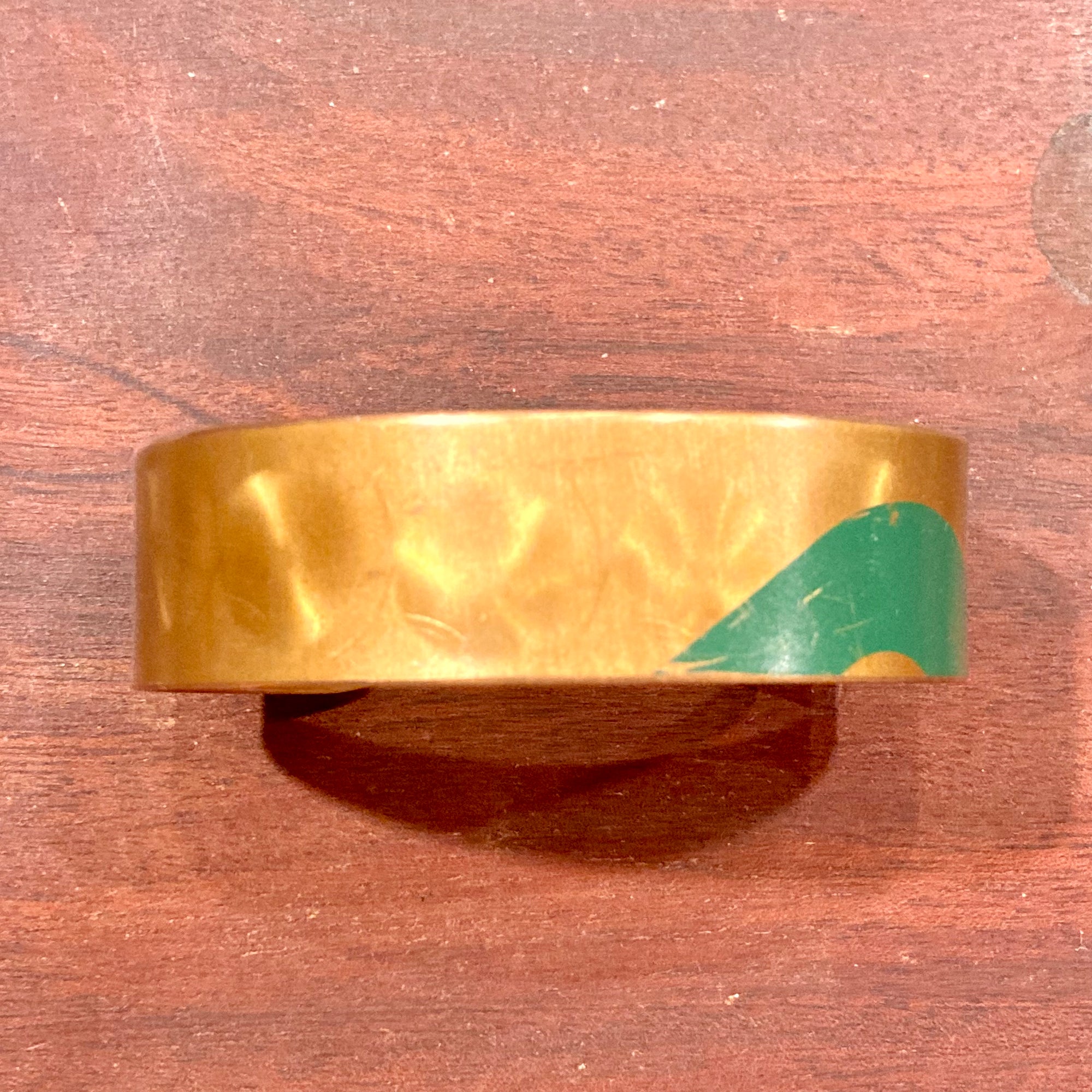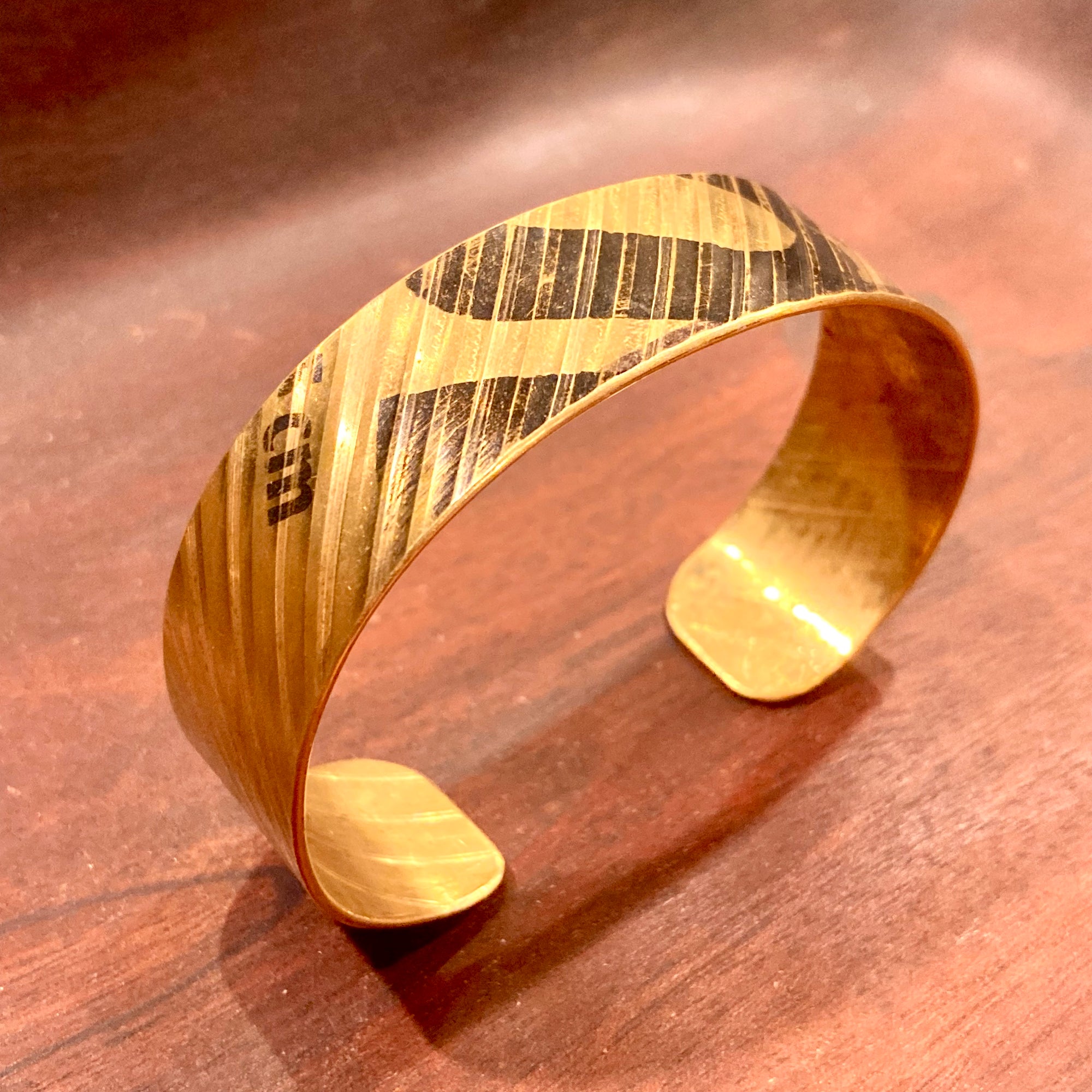 Old musical cymbals are rescued from the dump, carefully cleaned, cut, forged and given new life as a fun and functional cuff. Original scorings and printing is still visible.