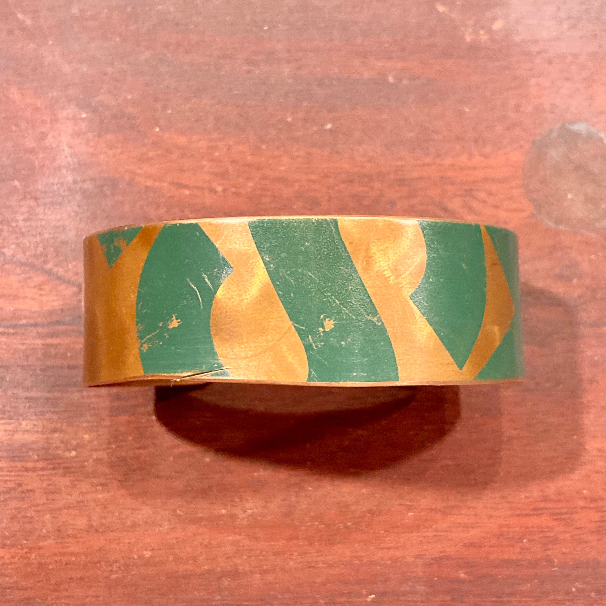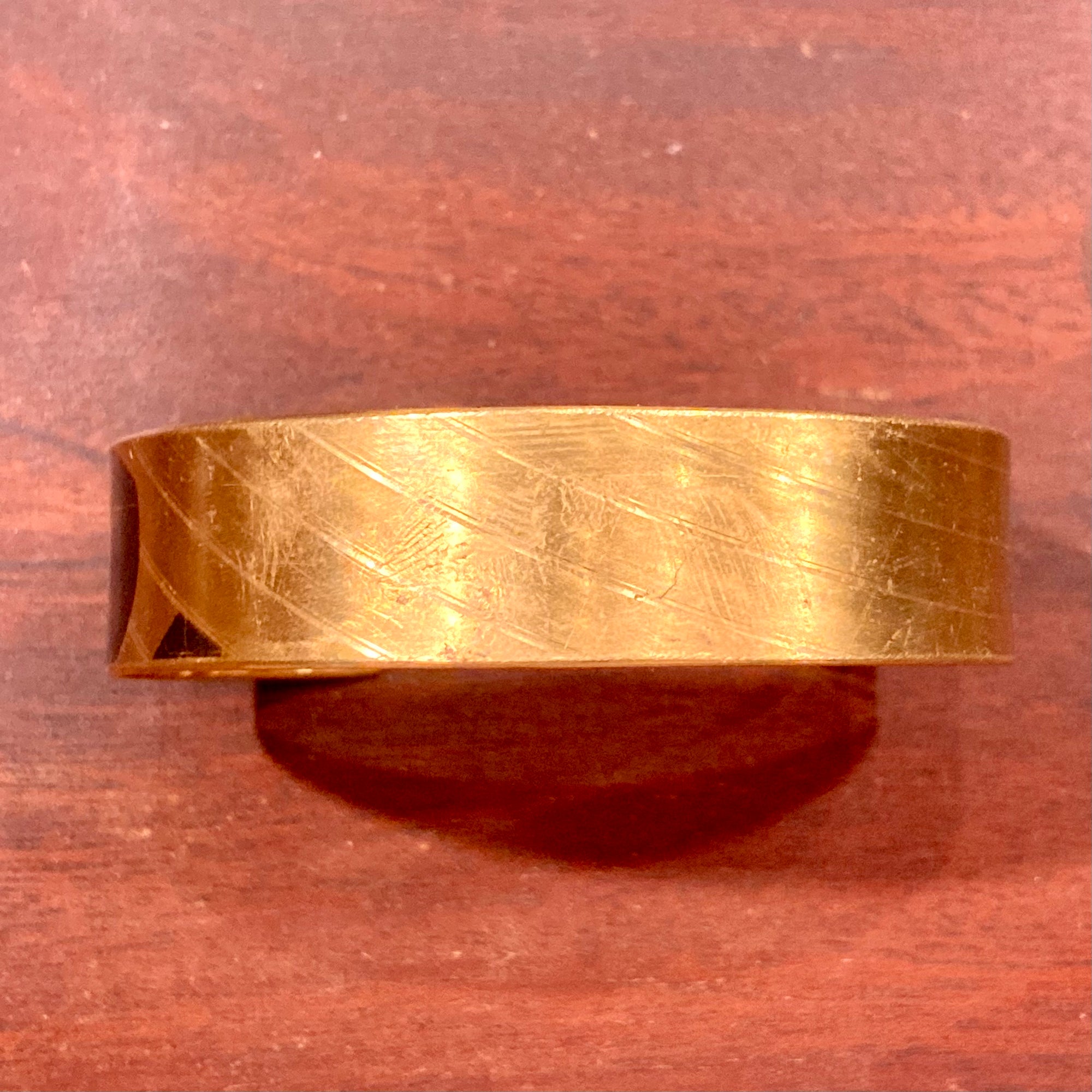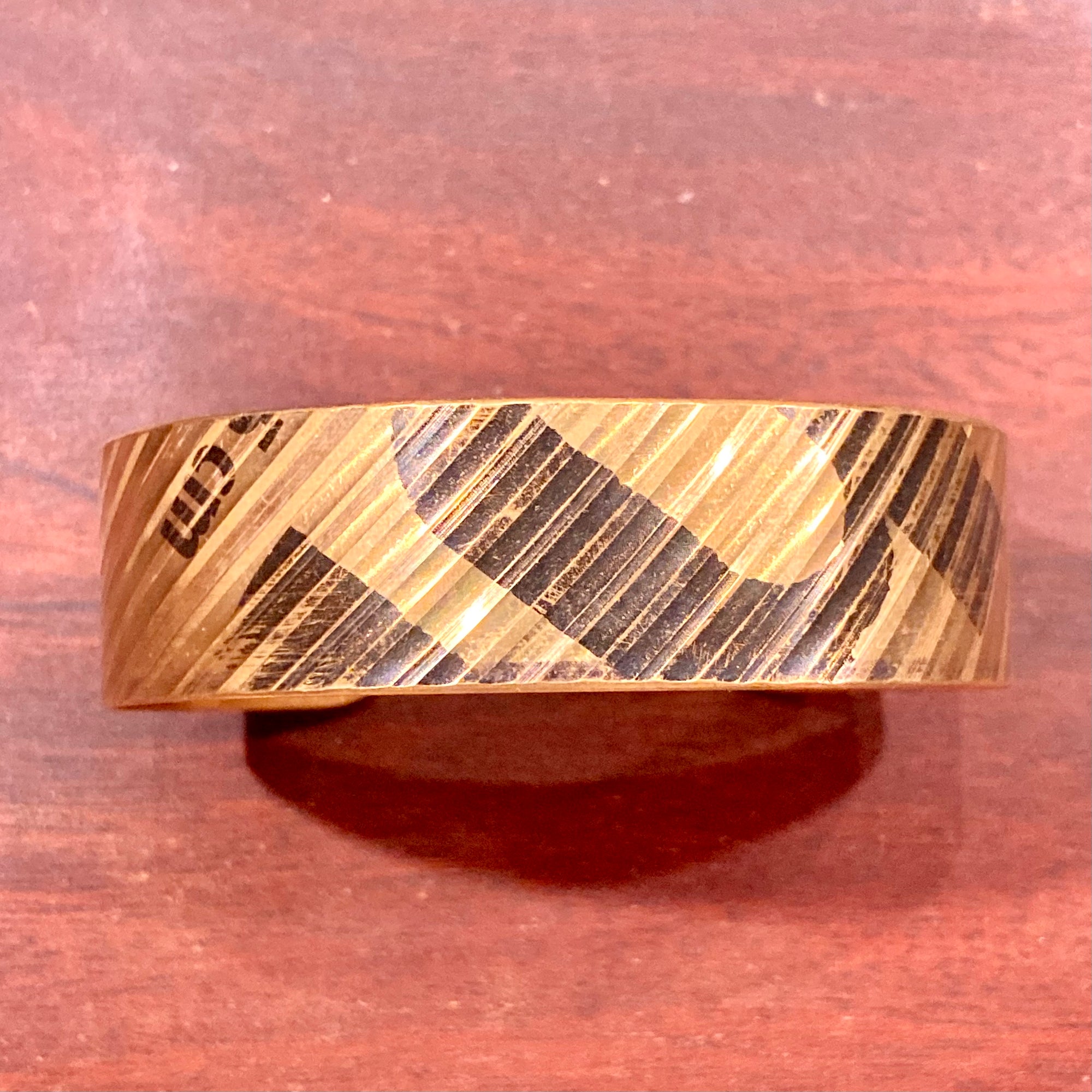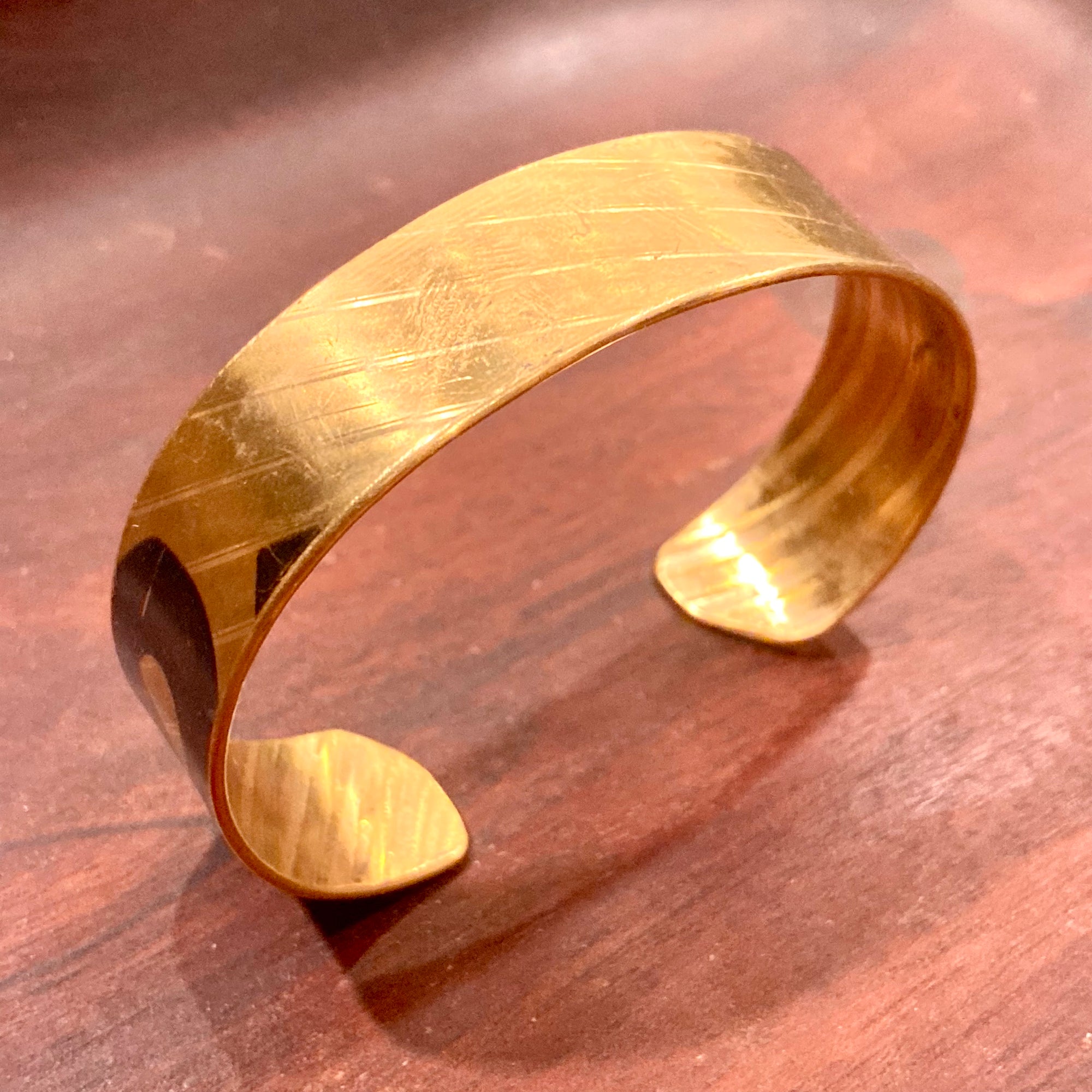 Old musical cymbals are rescued from the dump, carefully cleaned, cut, forged and given new life as a fun and functional cuff. Original scorings and printing is still visible.