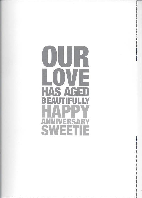 Cover reads, "From wine coolers and beer to scotch and cabernet". Inside reads, "Our love has aged beautifully. Happy anniversary sweetie".