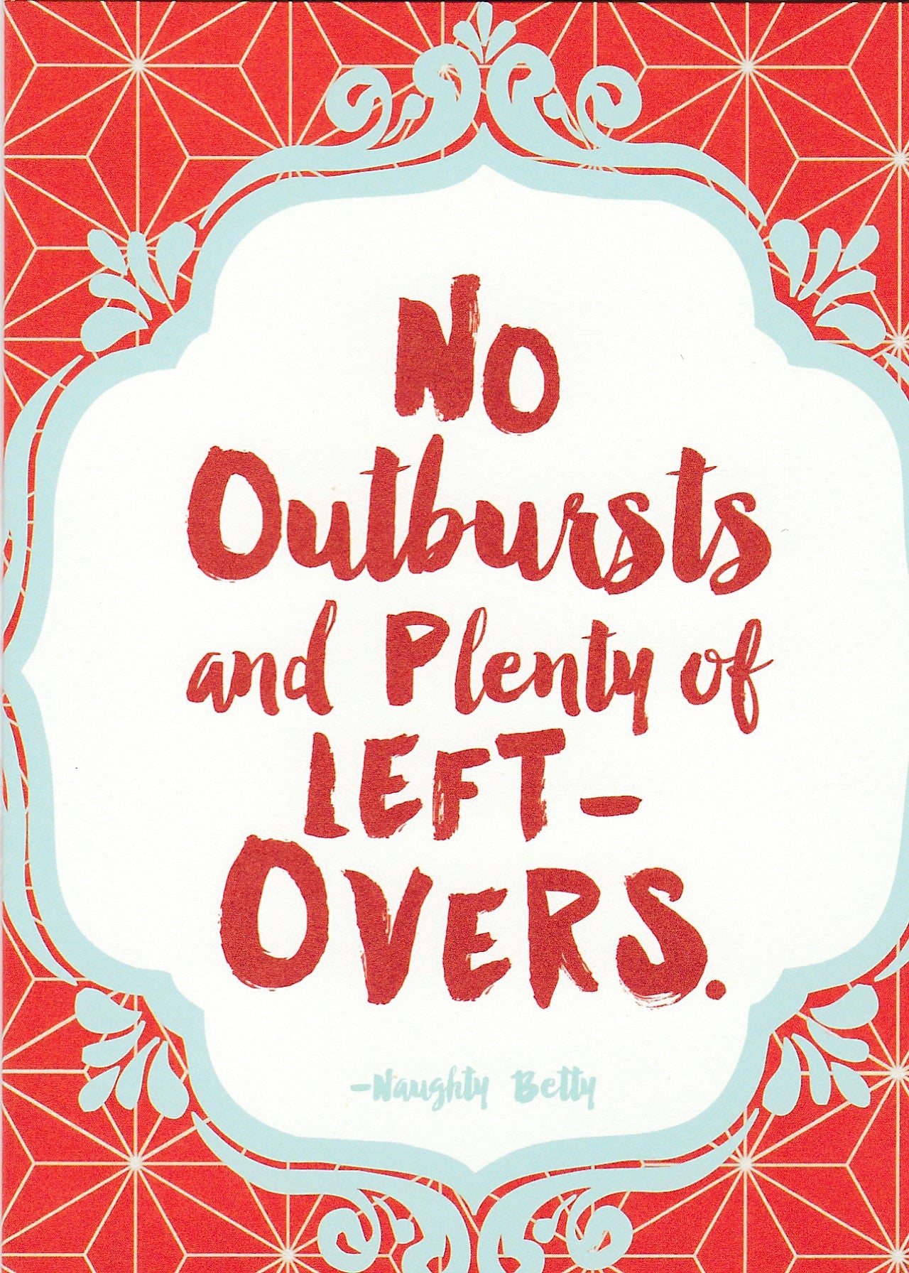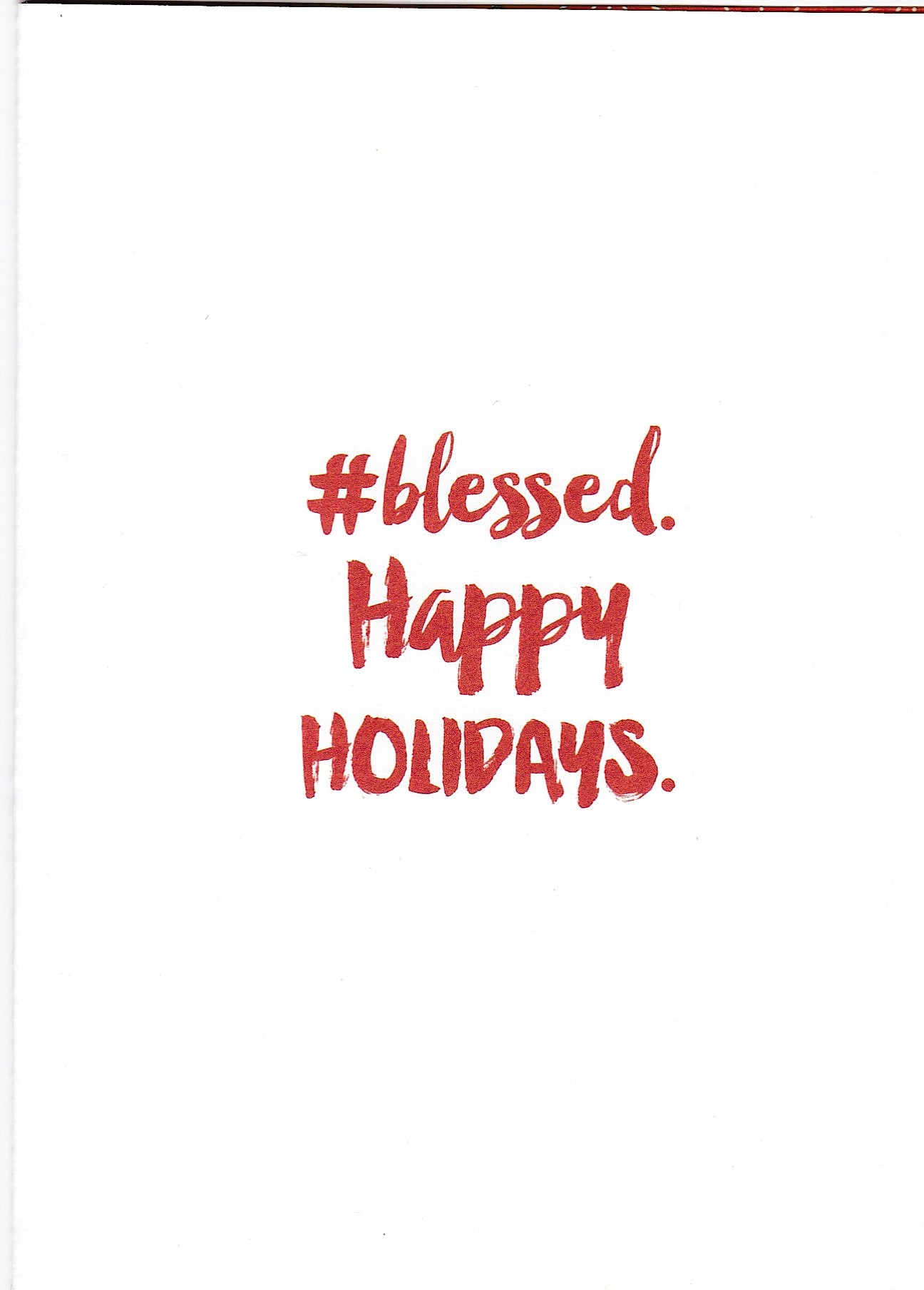 Cover reads, "No outbursts and plenty of leftovers". Inside reads, "#blessed. Happy Holidays". Includes a white envelope.
