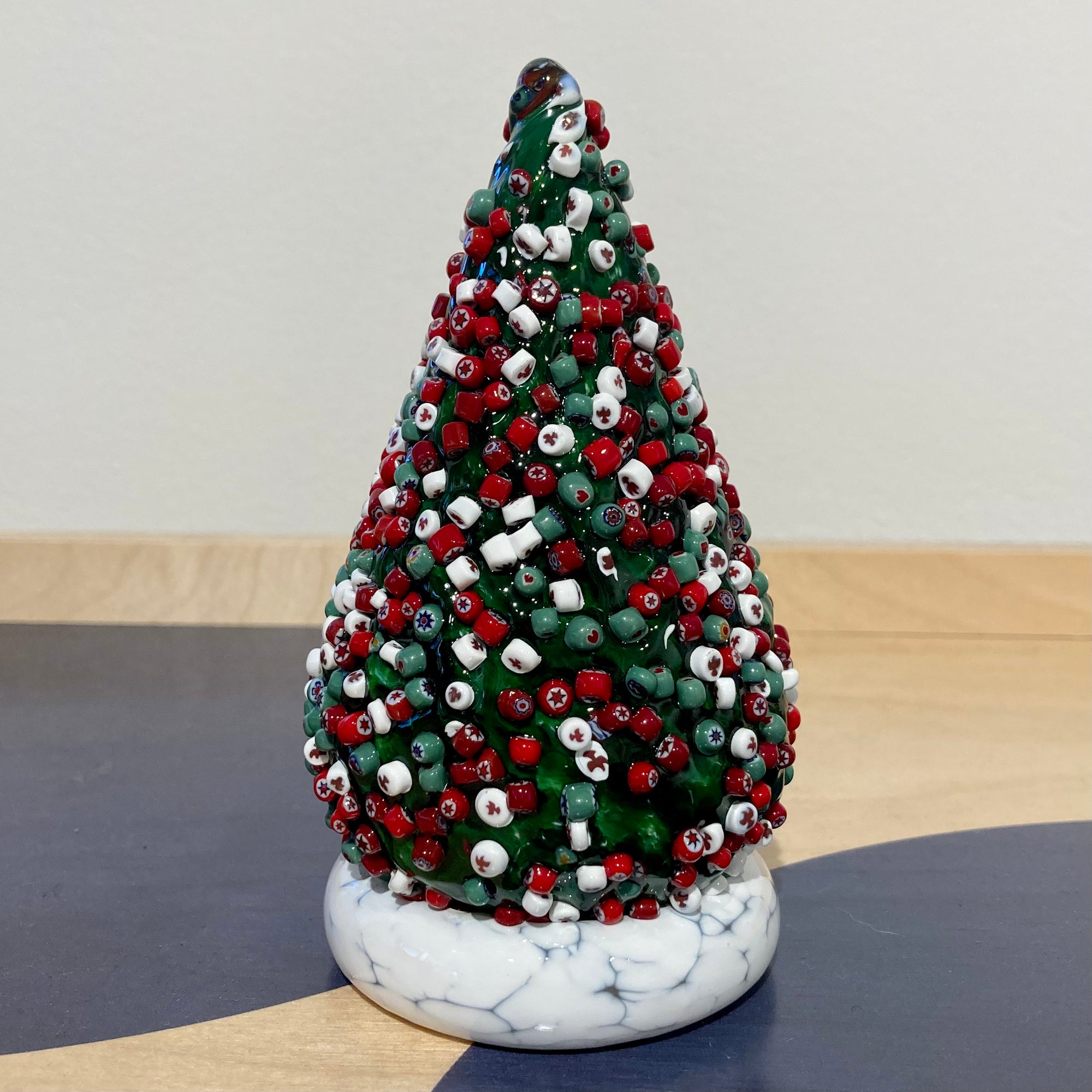 A forest green blown glass Christmas tree stands tall on a swirling white blown glass base, then encrusted with dozens of classic millefiori glass beads - the traditional glassblowing technique invented in Murano, Italy in the Medieval Age.