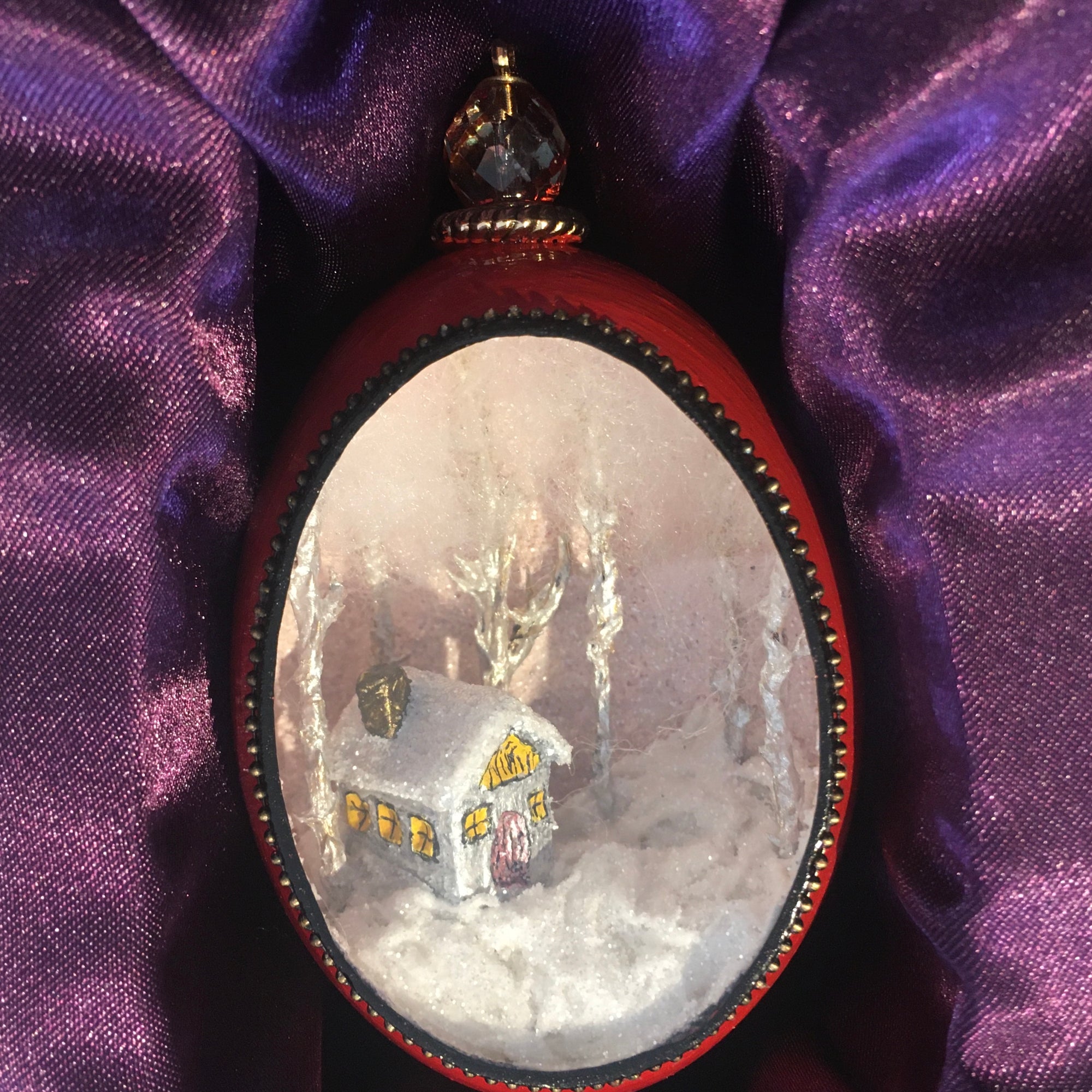 The egg itself is coated with many layers of paint and gesso to stiffen and protect the shell. The dioramas are created using found objects from the artist's garden, ceramics, resin, wood, metal and even dryer lint and seeds. The diorama is sealed into the egg with a pane of custom cut glass, and each egg comes with a secure loop and an ornamental hook for proper display.