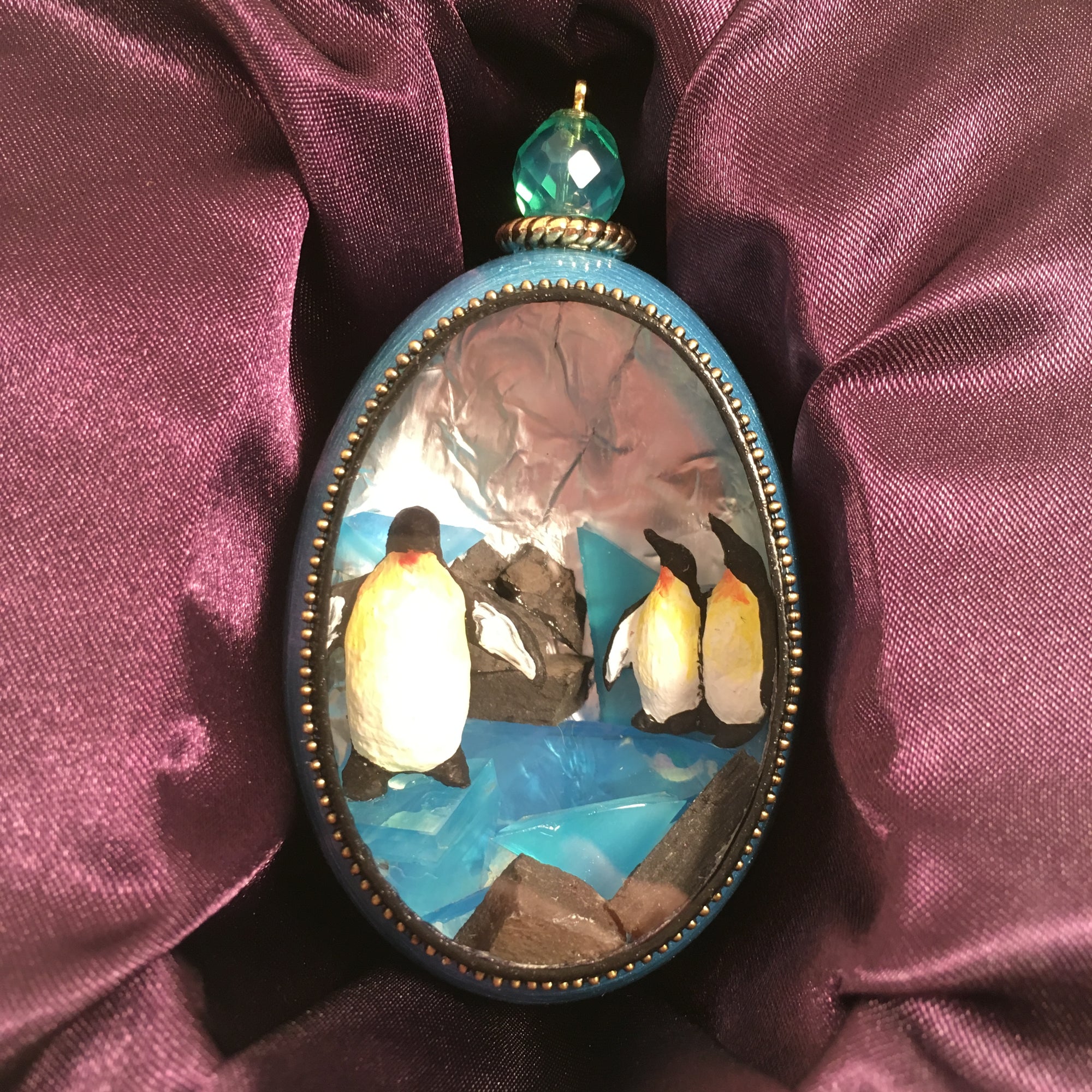 The egg itself is coated with many layers of paint and gesso to stiffen and protect the shell. The dioramas are created using found objects from the artist's garden, ceramics, resin, wood, metal and even dryer lint and seeds. The diorama is sealed into the egg with a pane of custom cut glass, and each egg comes with a secure loop and an ornamental hook for proper display.