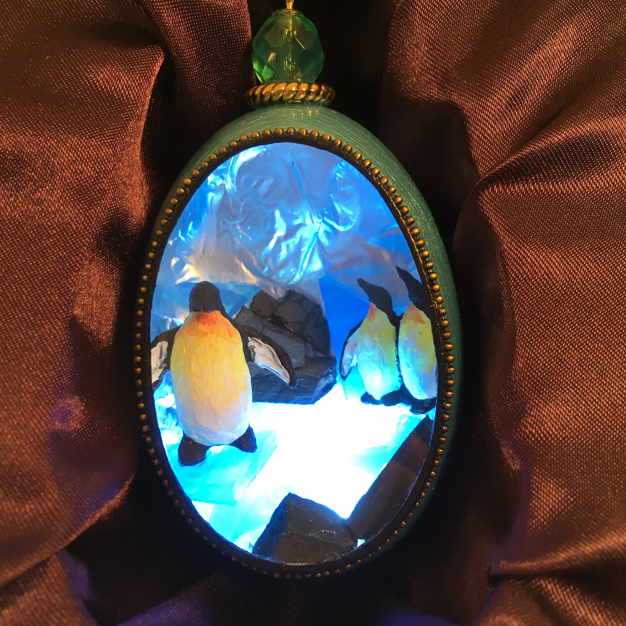 A real duck egg is carefully sliced lengthwise, a detailed diorama constructed within and lit with an LED light controlled with a switch on the back, with access for changing the watch batteries as needed.