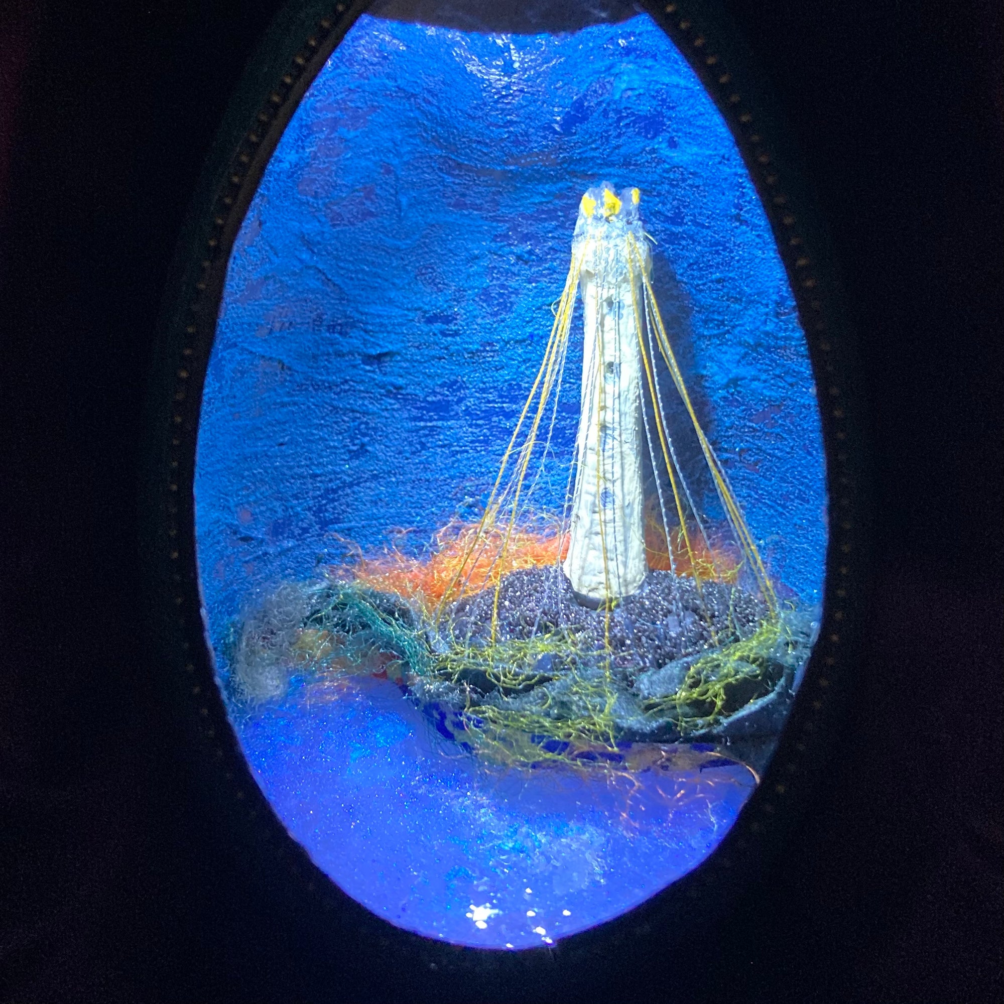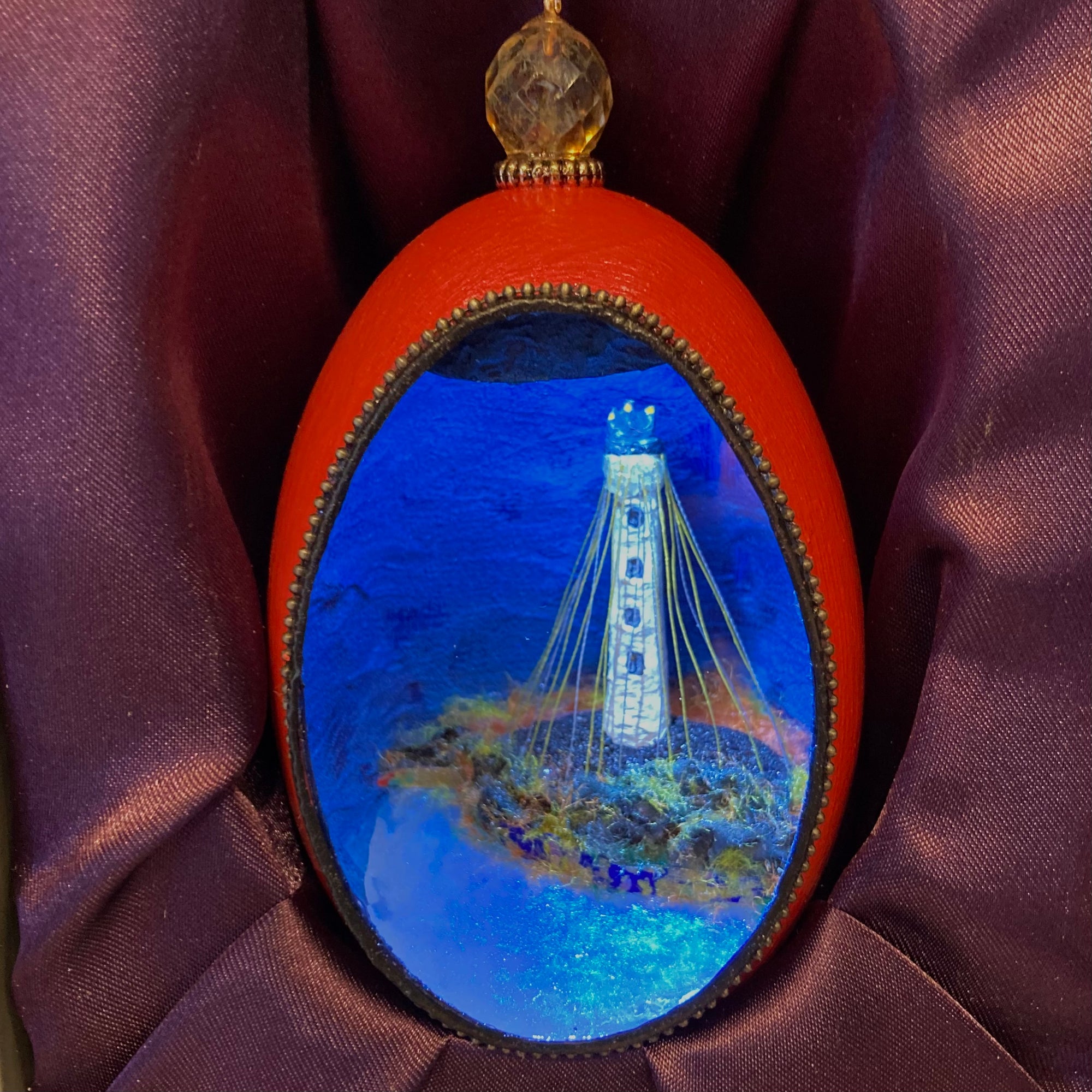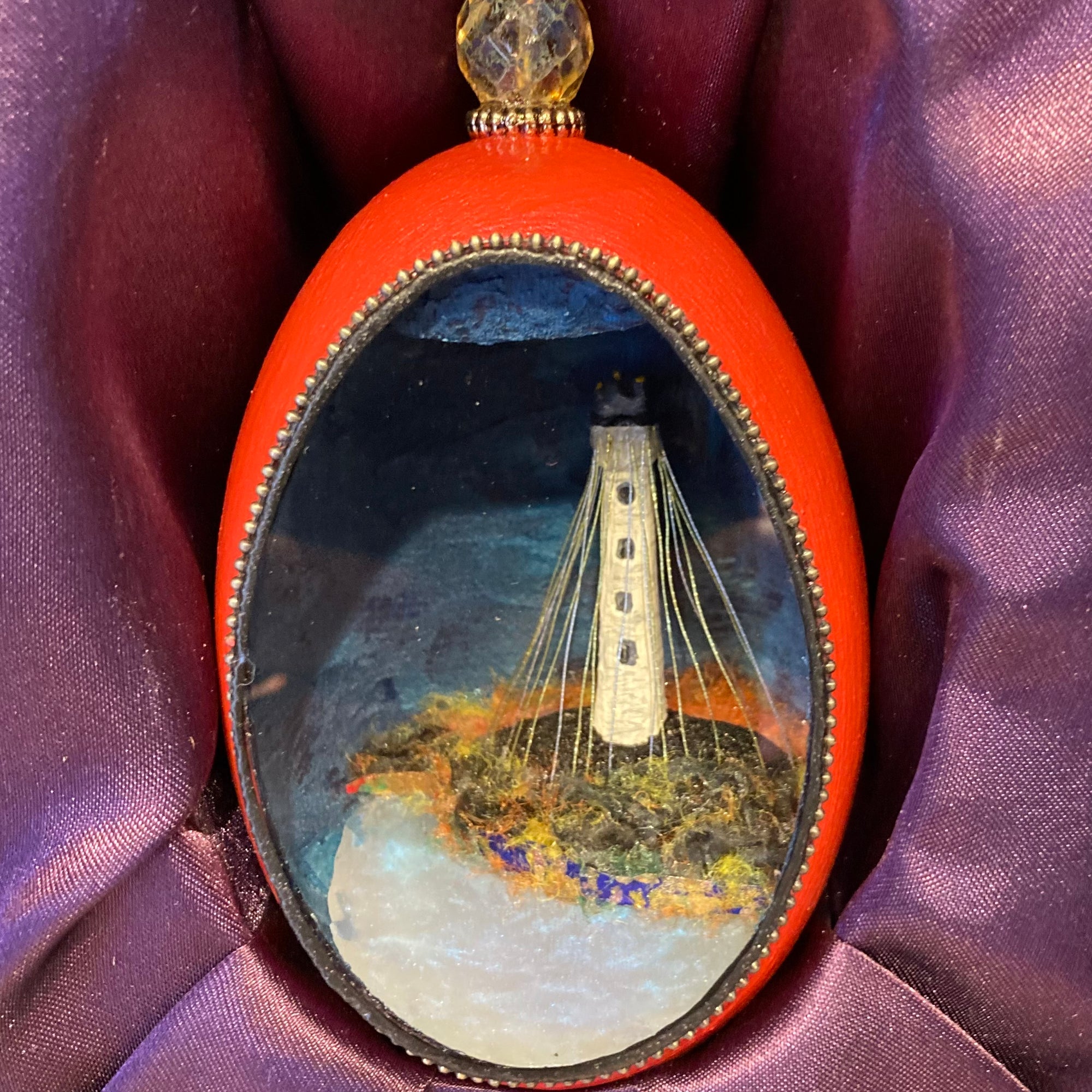 The egg itself is coated with many layers of paint and gesso to stiffen and protect the shell and make this a truly functional ornament, safe to hang on your tree year after year. The diorama within is created using found objects from the artist's garden, ceramics, resin, wood, metal and even dryer lint and seeds. The diorama is sealed into the egg with a pane of custom cut glass, and each egg comes with a secure loop and an ornamental hook for proper display. Eggs come in a decorative and protective gift box with artist information on the inside cover.