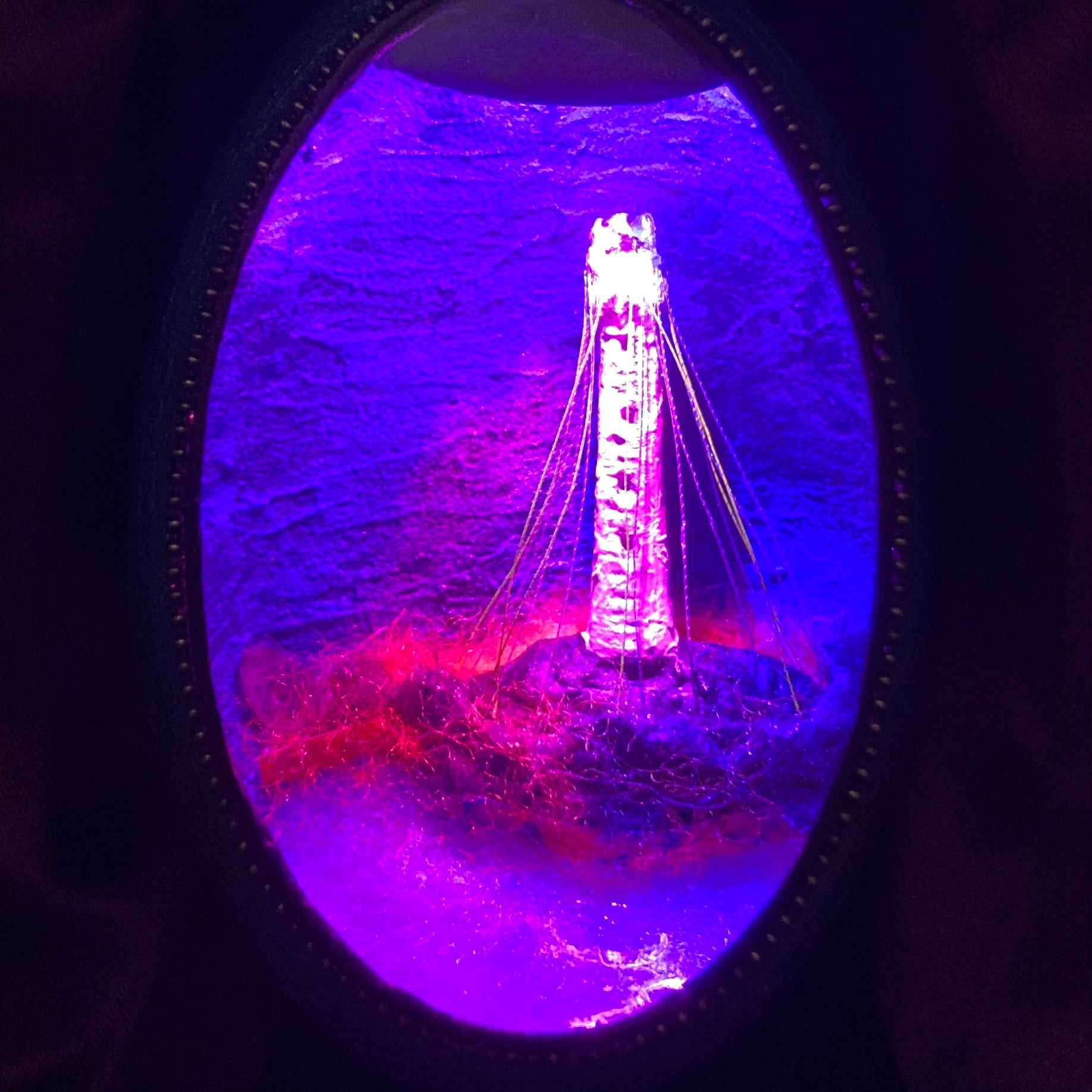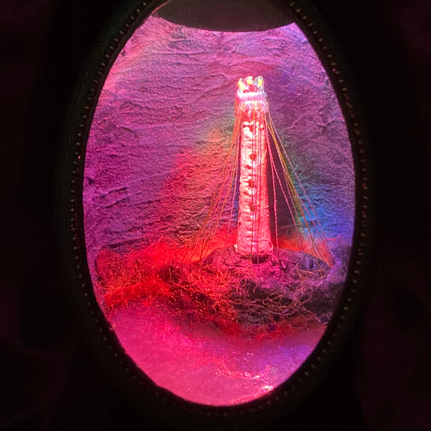 Made exclusively for Arcadia, our Pilgrim Monument in it's holiday glory with Christmas lights draped down it's sides, with two options for lighting; the classic white "moon" lighting, or rainbow lighting that advances through the rainbow every 30 seconds. Gorgeous and unique, either way.