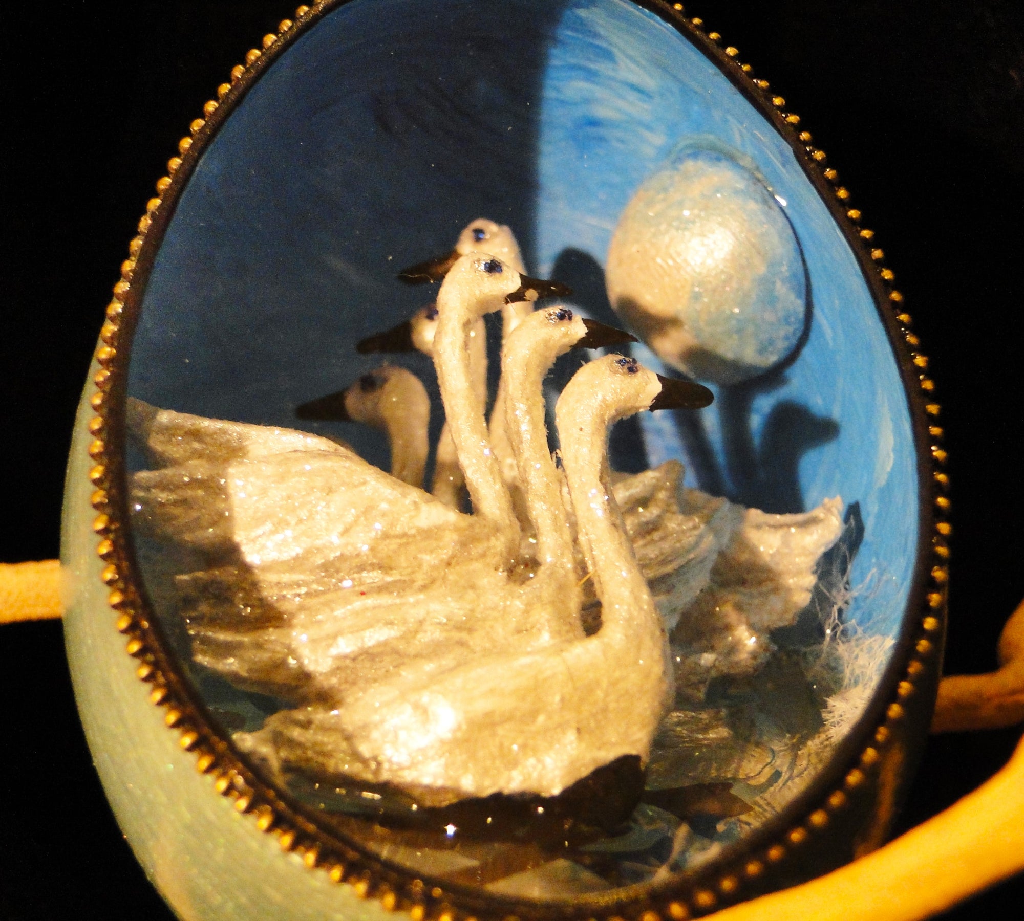 A real duck egg is carefully sliced lengthwise, a detailed diorama constructed within, to create this amazing functional work of art.