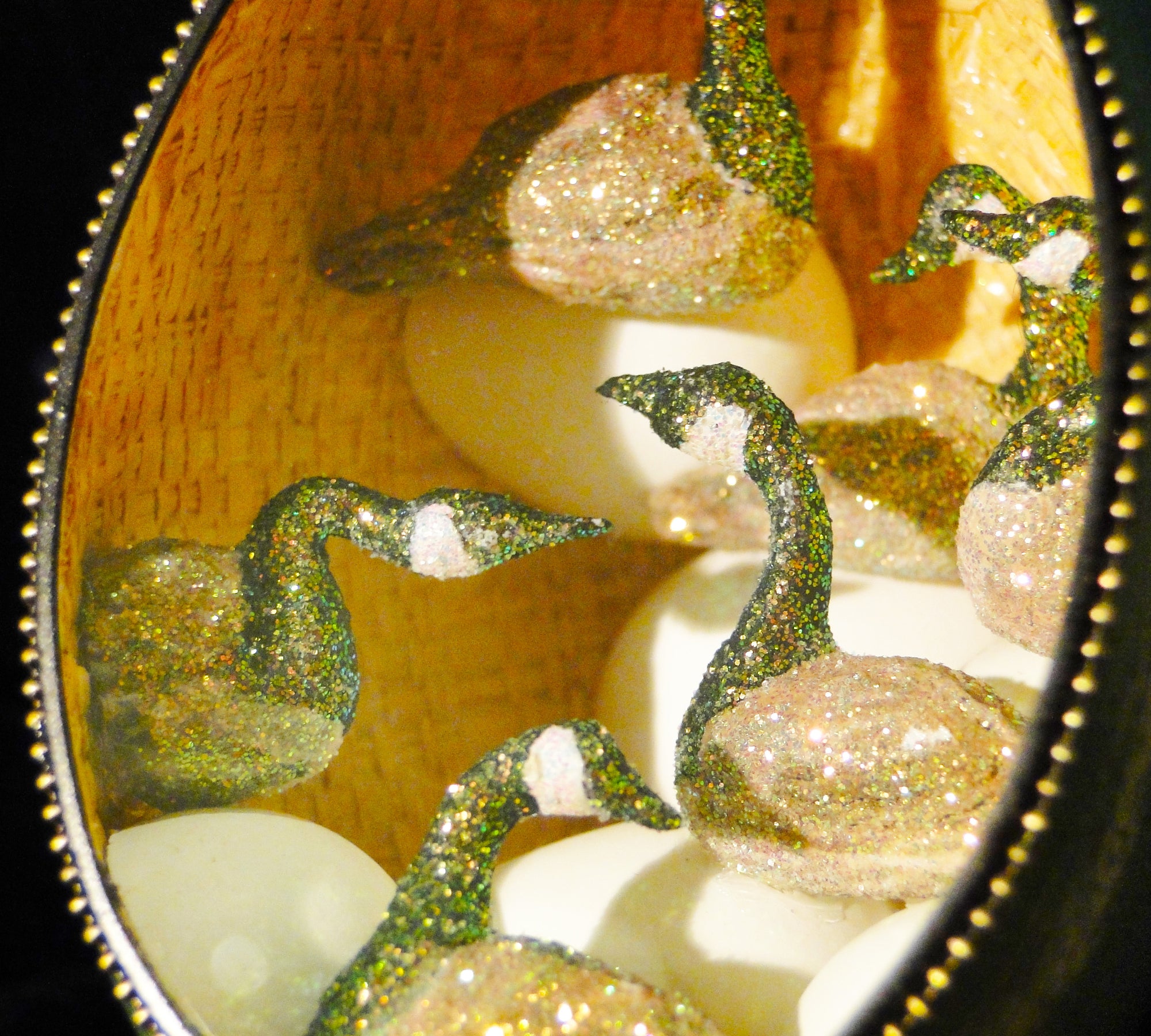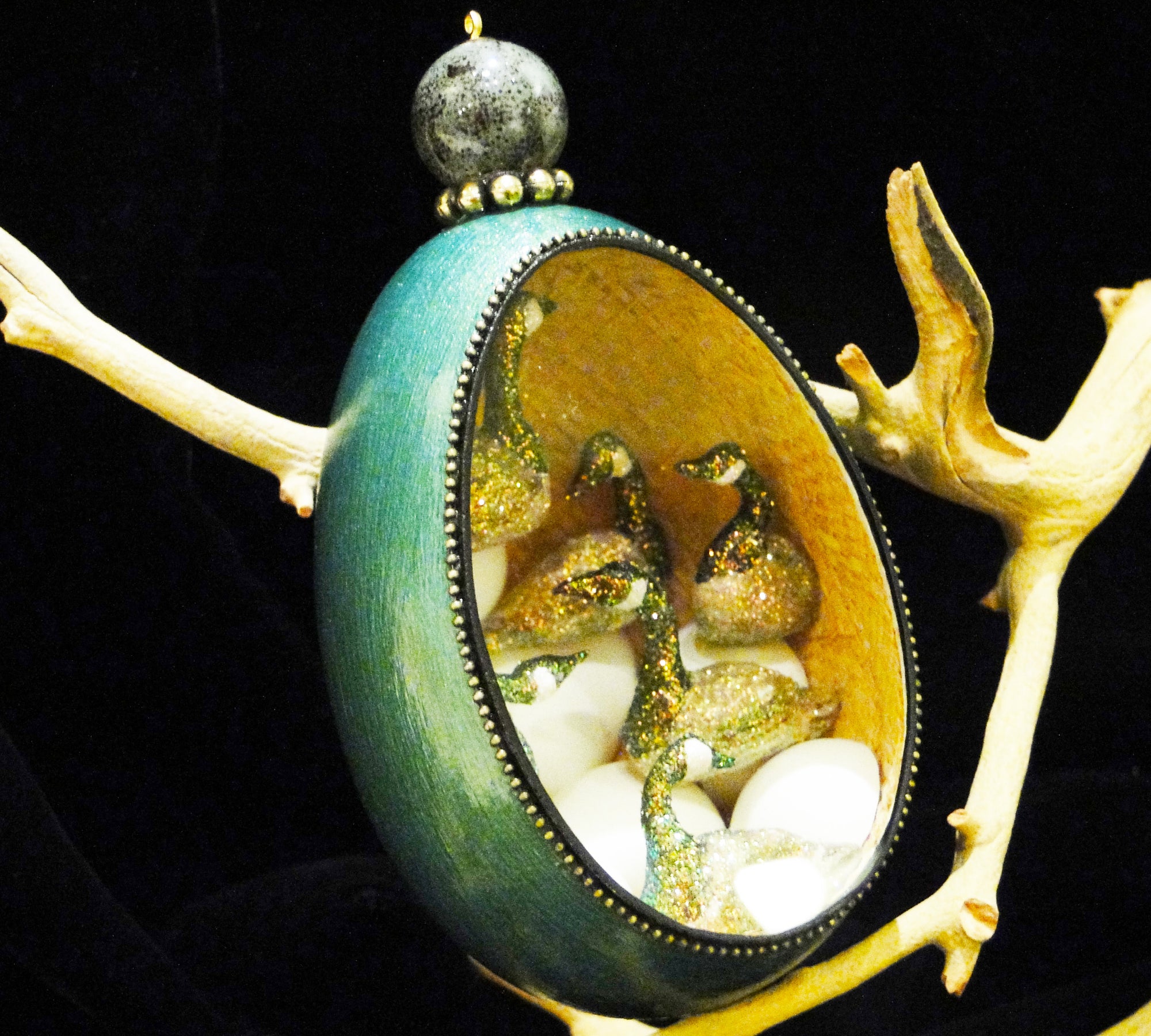 The egg itself is coated with many layers of paint and gesso to stiffen and protect the shell. The dioramas are created using found objects from the artist's garden, ceramics, resin, wood, fabrics, metal and even dryer lint and seeds. The diorama is sealed into the egg with a pane of custom cut glass, and each egg comes with a secure loop and an ornamental hook for proper display.