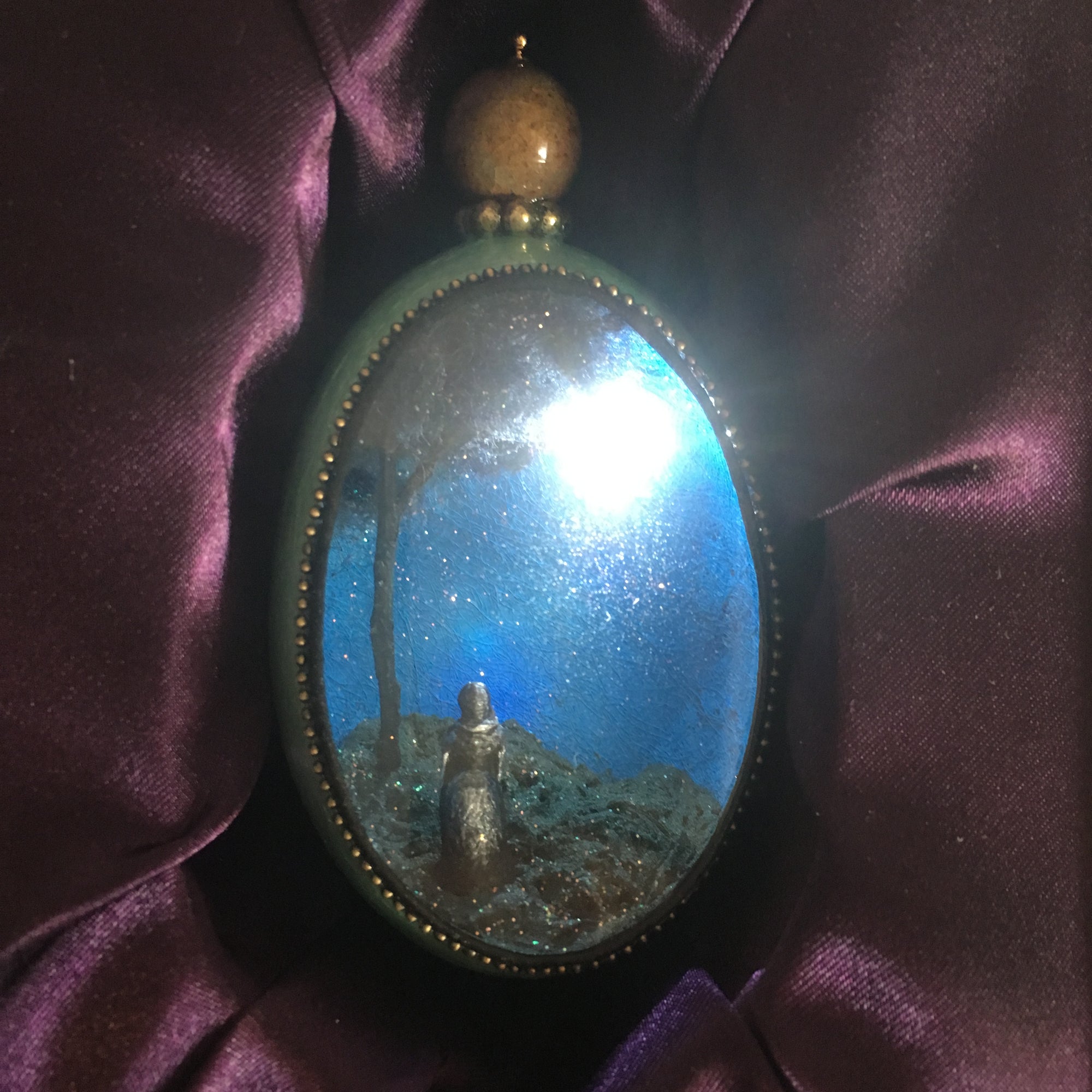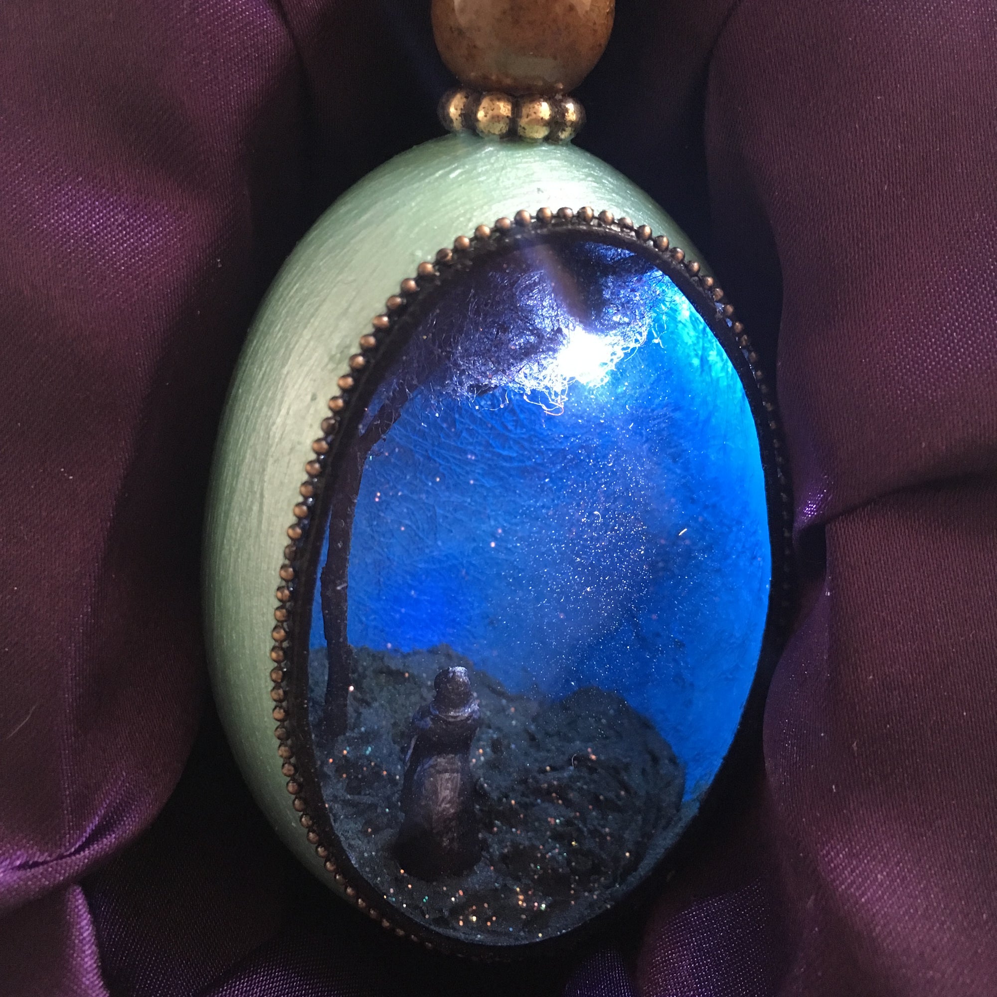 The egg itself is coated with many layers of paint and gesso to stiffen and protect the shell. The dioramas are created using found objects from the artist's garden, ceramics, resin, wood, metal and even dryer lint and seeds. The diorama is sealed into the egg with a pane of custom cut glass, and each egg comes with a secure loop and an ornamental hook for proper display.
