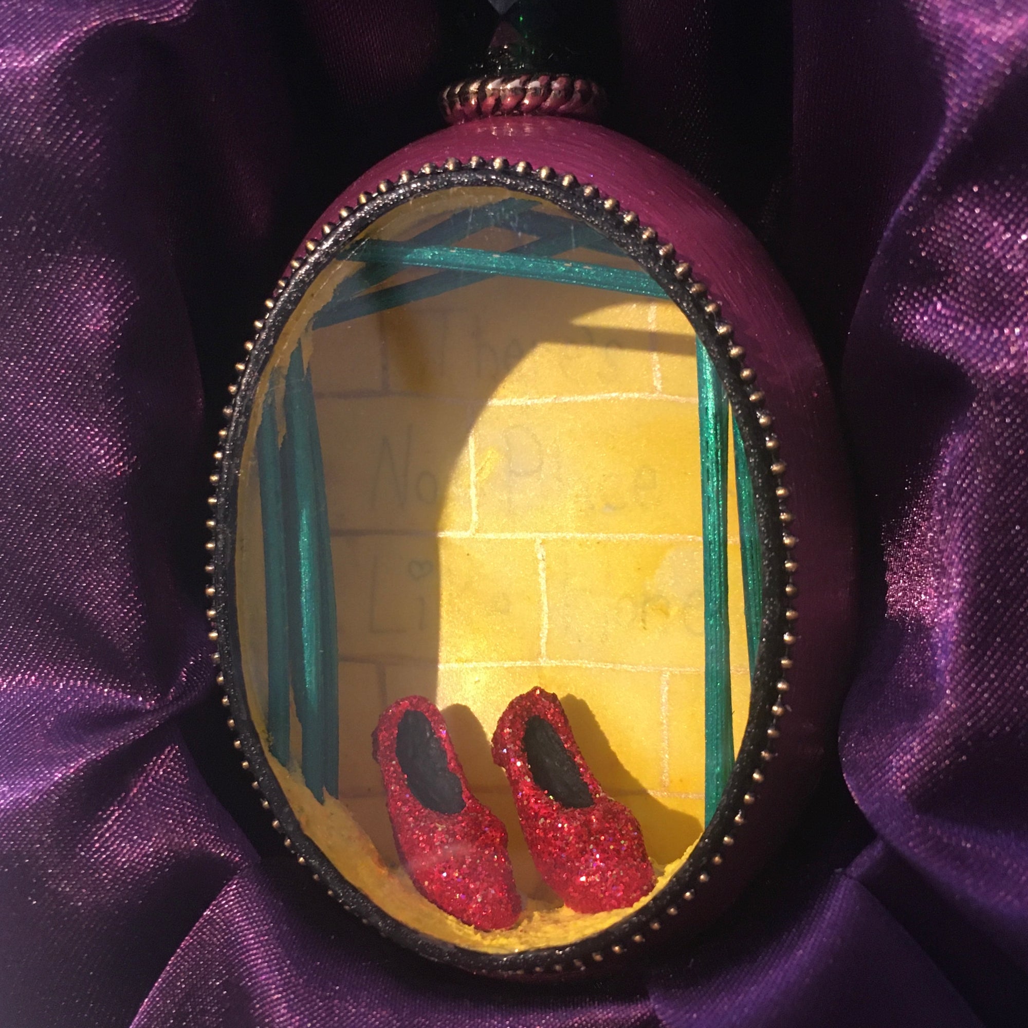 The egg itself is coated with many layers of paint and gesso to stiffen and protect the shell. The dioramas are created using found objects from the artist's garden, ceramics, resin, wood, metal and even dryer lint and seeds. The diorama is sealed into the egg with a pane of custom cut glass, and each egg comes with a secure loop and an ornamental hook for proper display.