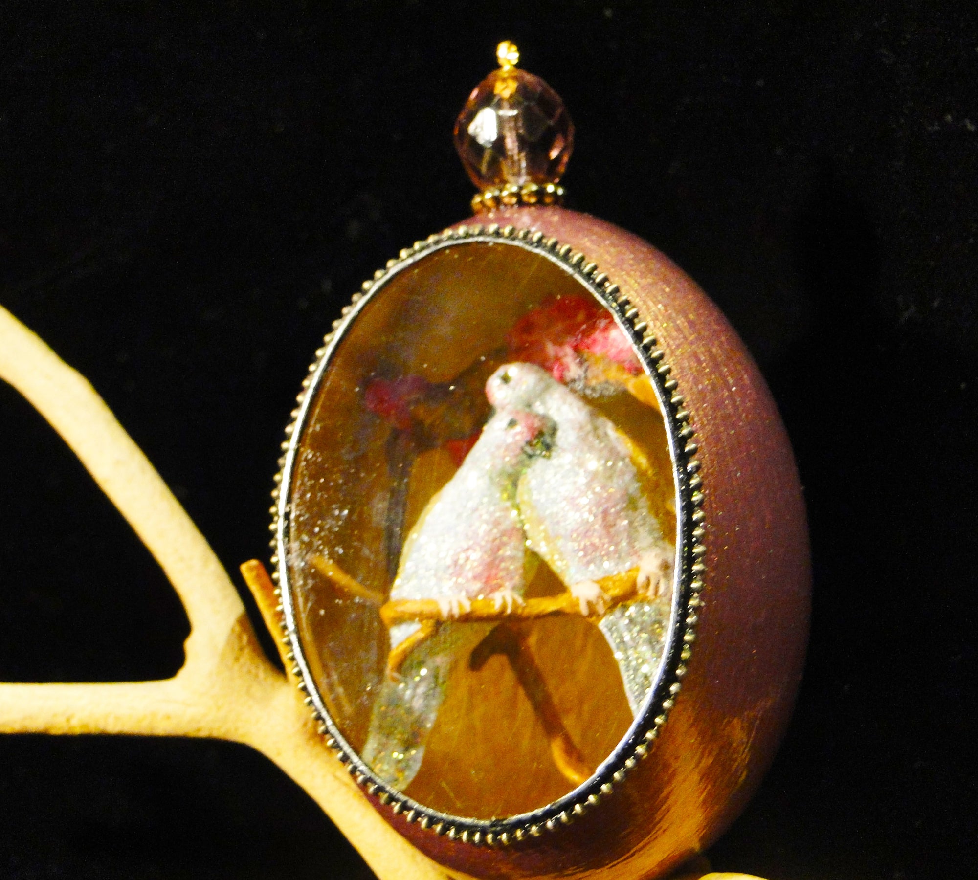 The egg itself is coated with many layers of paint and gesso to stiffen and protect the shell. The dioramas are created using found objects from the artist's garden, ceramics, resin, wood, fabrics, metal and even dryer lint and seeds. The diorama is sealed into the egg with a pane of custom cut glass, and each egg comes with a secure loop and an ornamental hook for proper display.