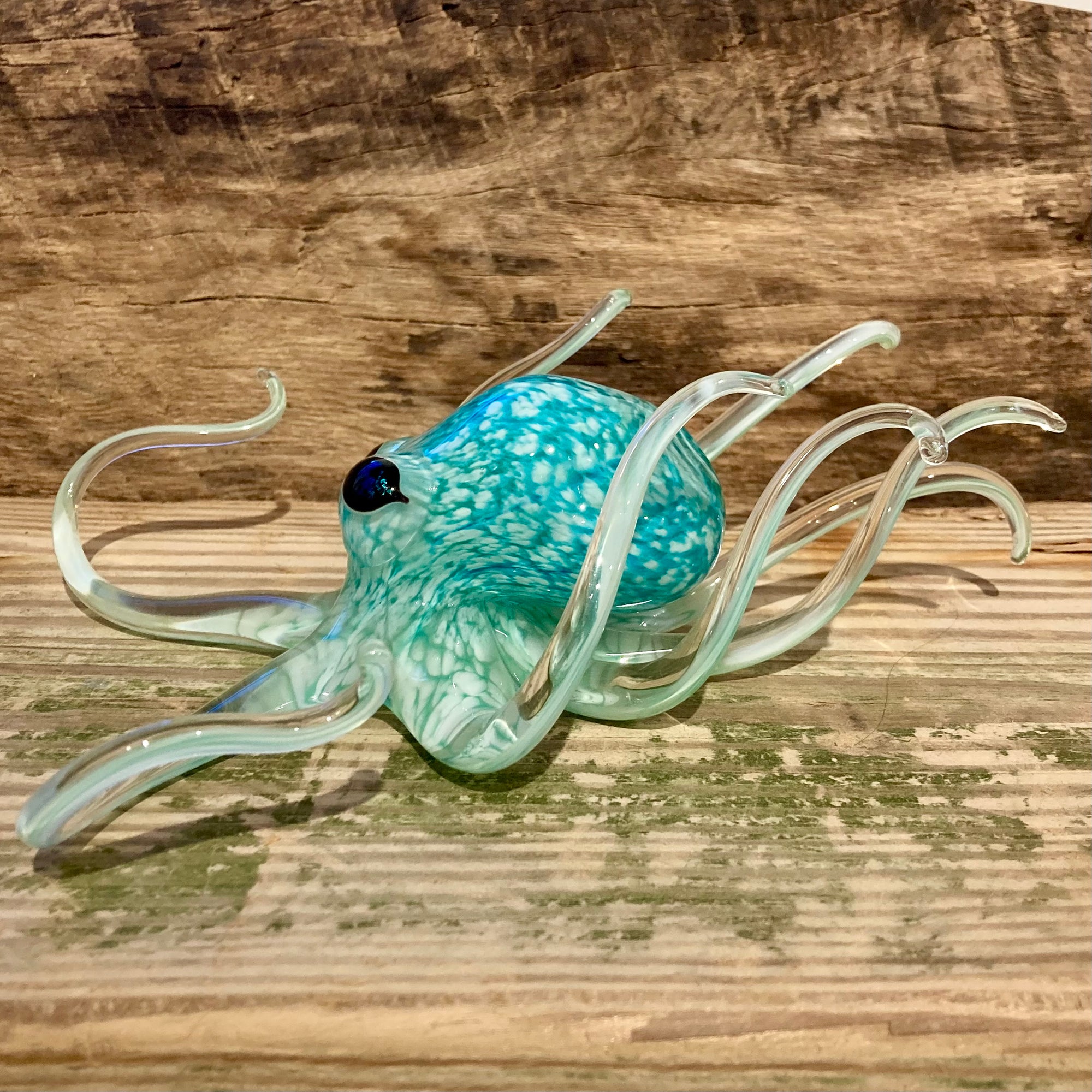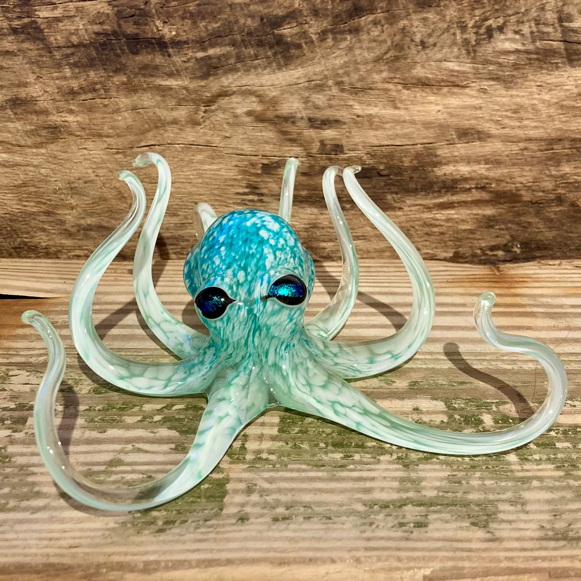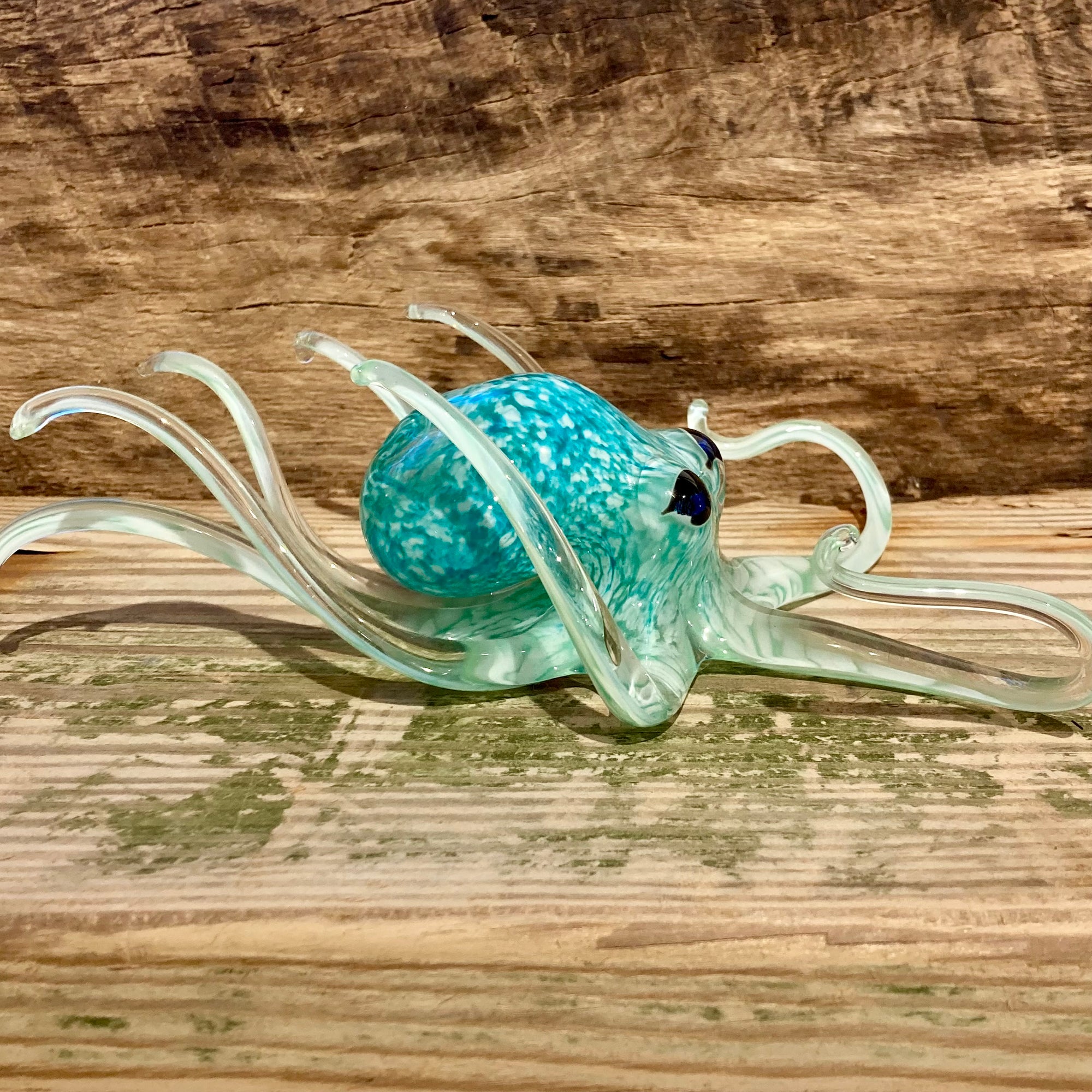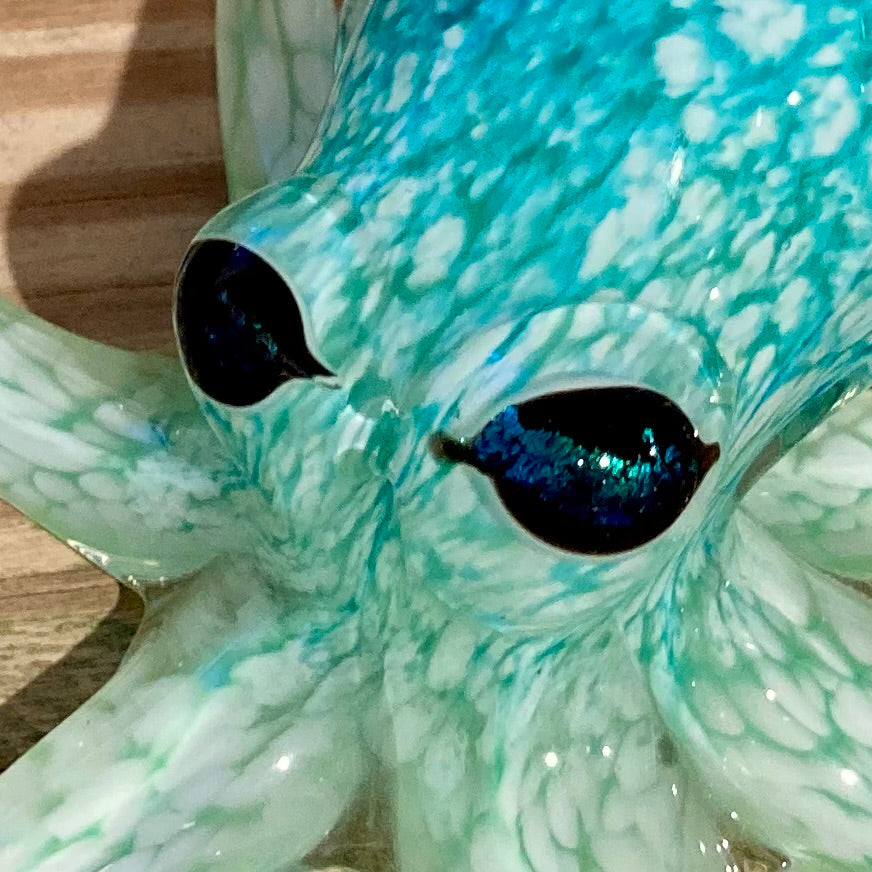 Gorgeously speckled with shades of Caribbean aqua with glittering dichroic glass eyes, this blown glass octopus would vanish instantly into the warm waters of St. Barth's and is so lifelike it seems like it might slip right off your table.