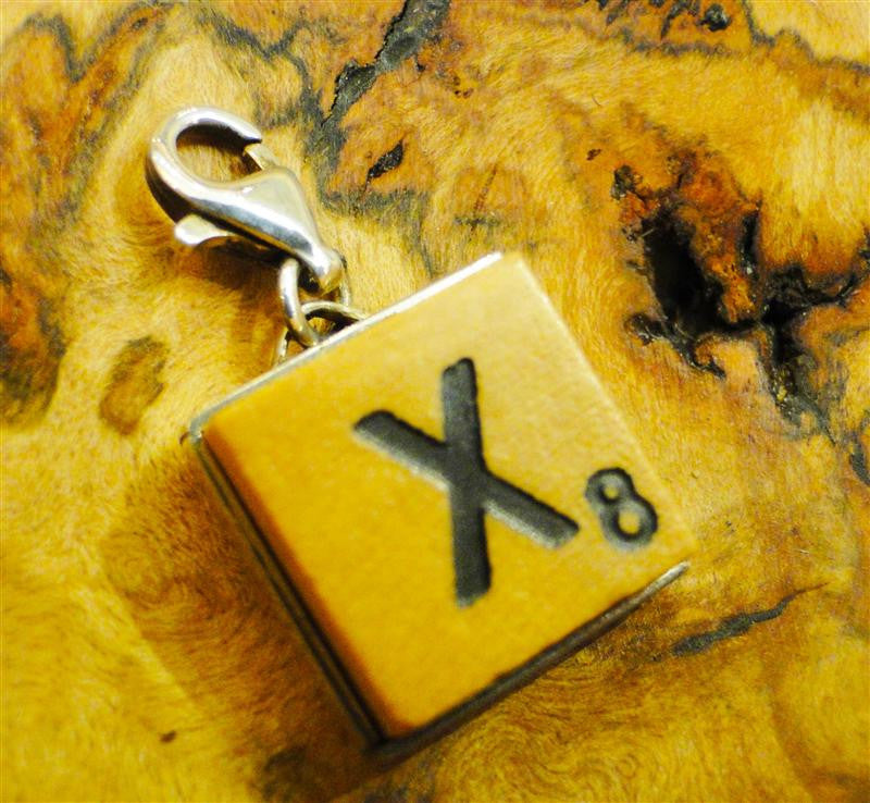 An authentic wooden Scrabble piece (travel size) is set into solid sterling silver with a sterling silver lobster claw clasp for attaching to a necklace, charm bracelet, or other accessories.