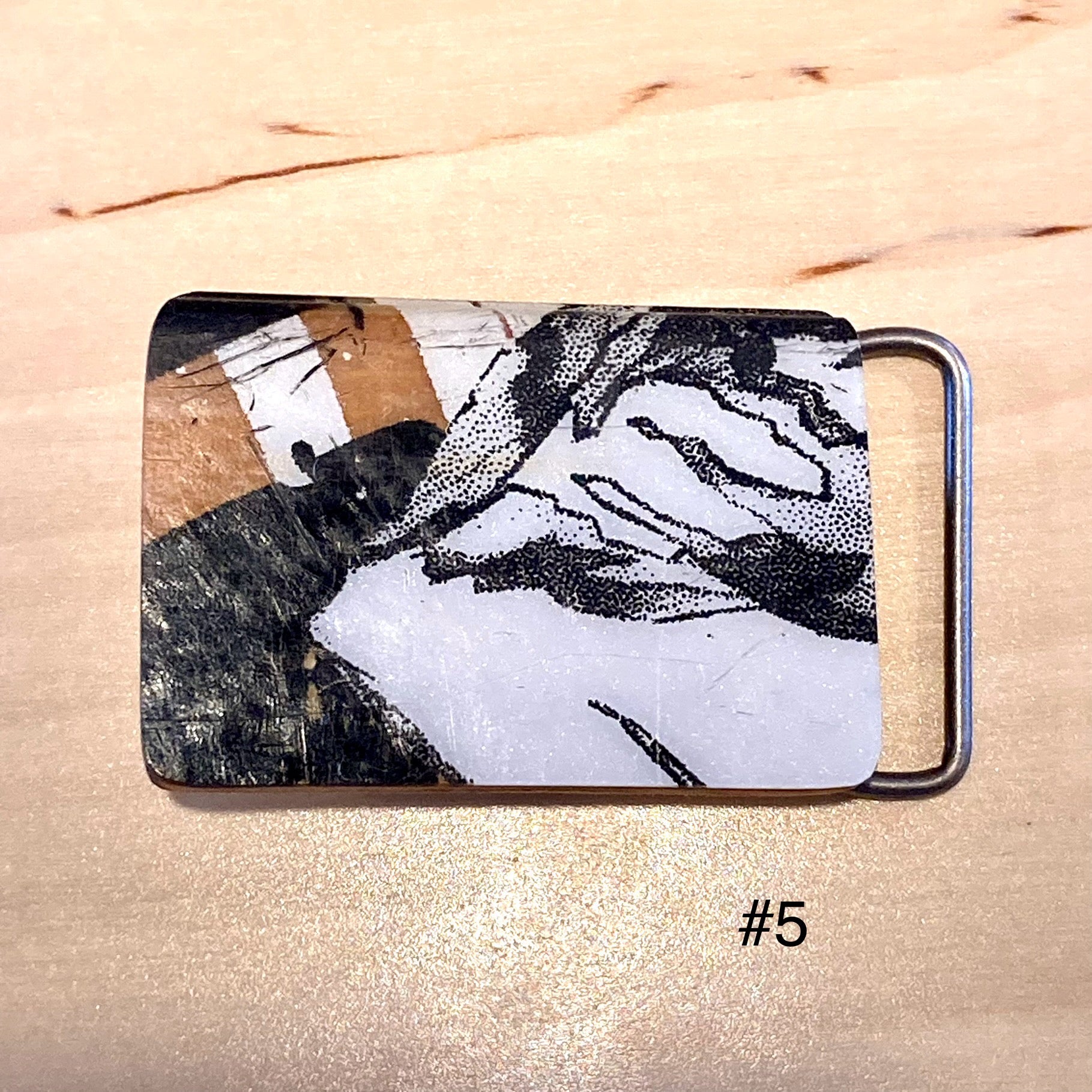 Buckles measure 2.5" long by 1.75" high by 1/4 to 1/2" thick (each one varies; some are flat, some have a curve to the face - all are cool) and weighs approximately 2 ounces.
