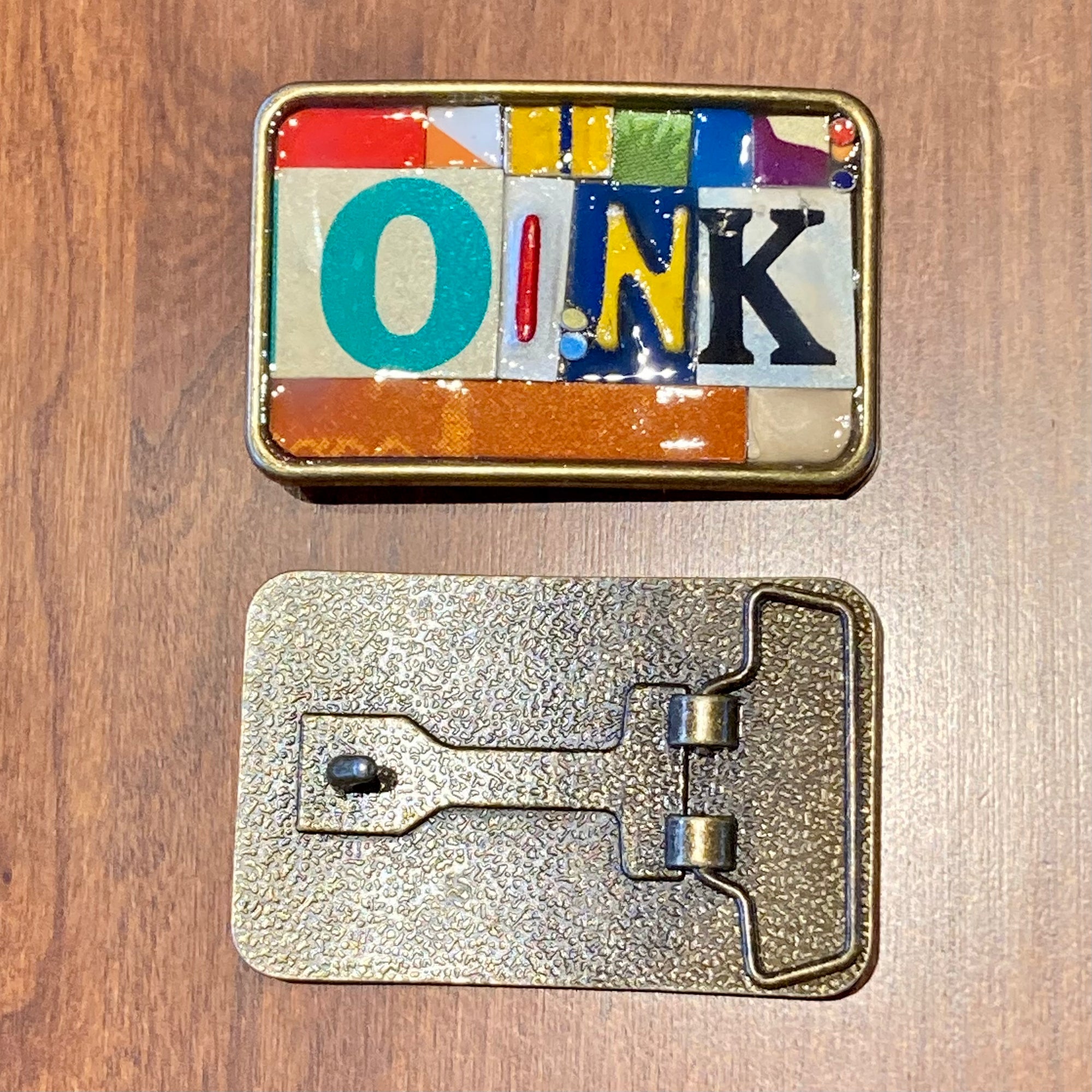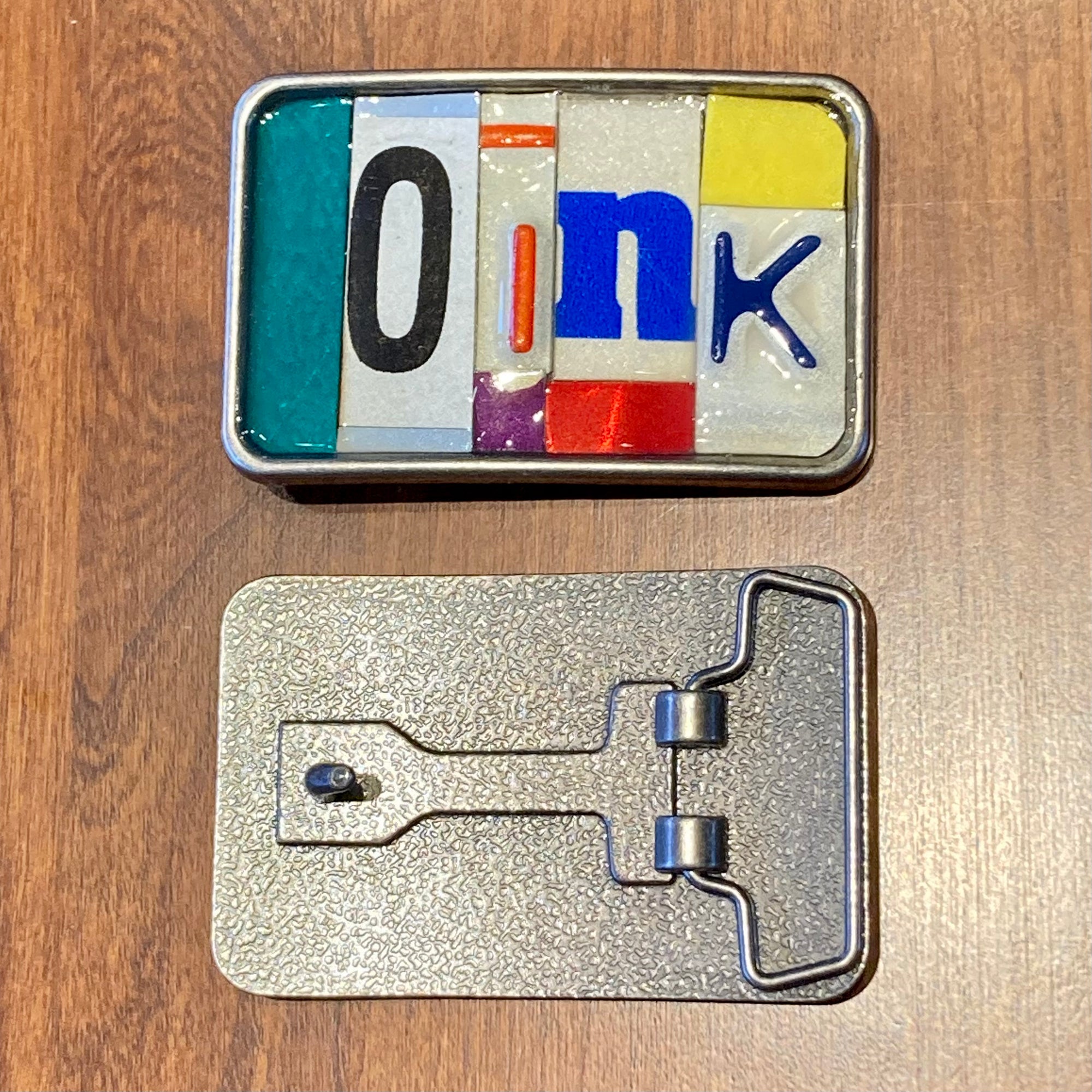 Buckle measures 2" high by 3" long, with a loop for belts up to 1.5" in width and weighs just a few ounces. The metal is from old license plates, so it may contain chemicals and components not intended for human consumption and could cause cancer if consumed. Love the buckle, don't lick it!