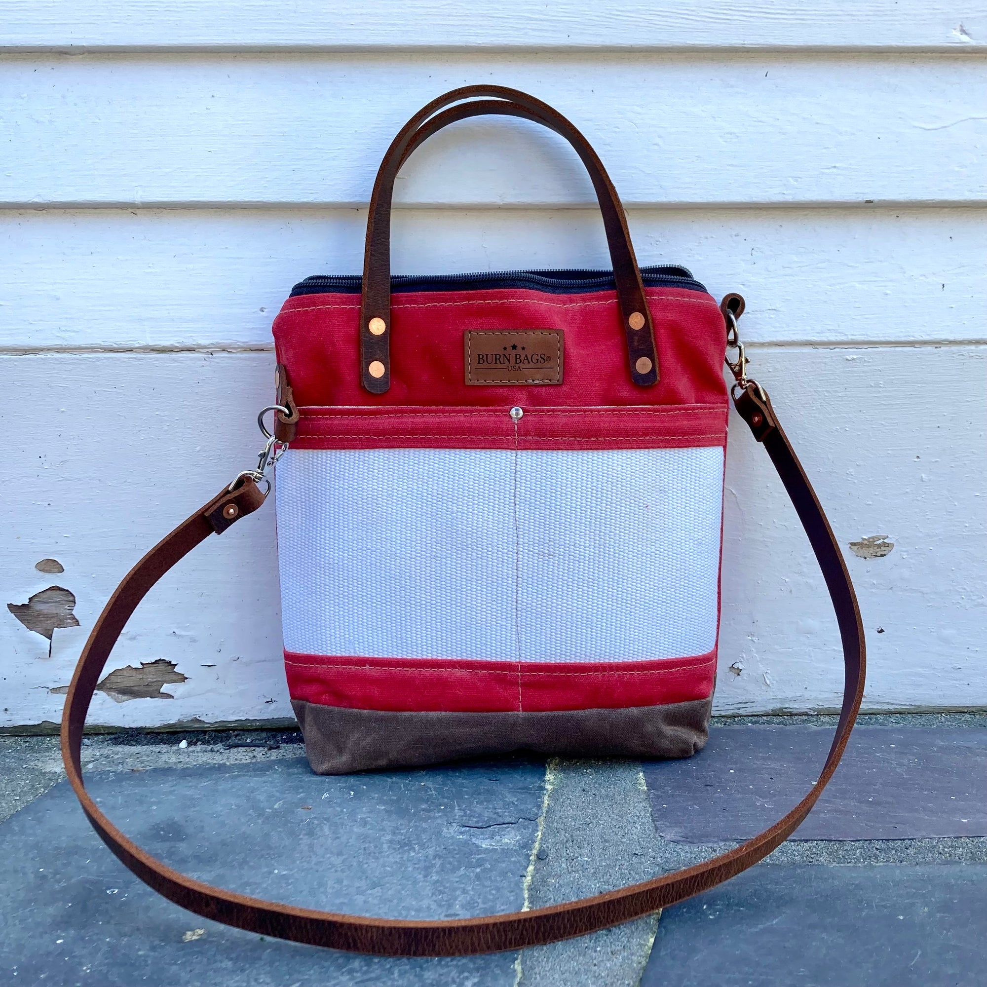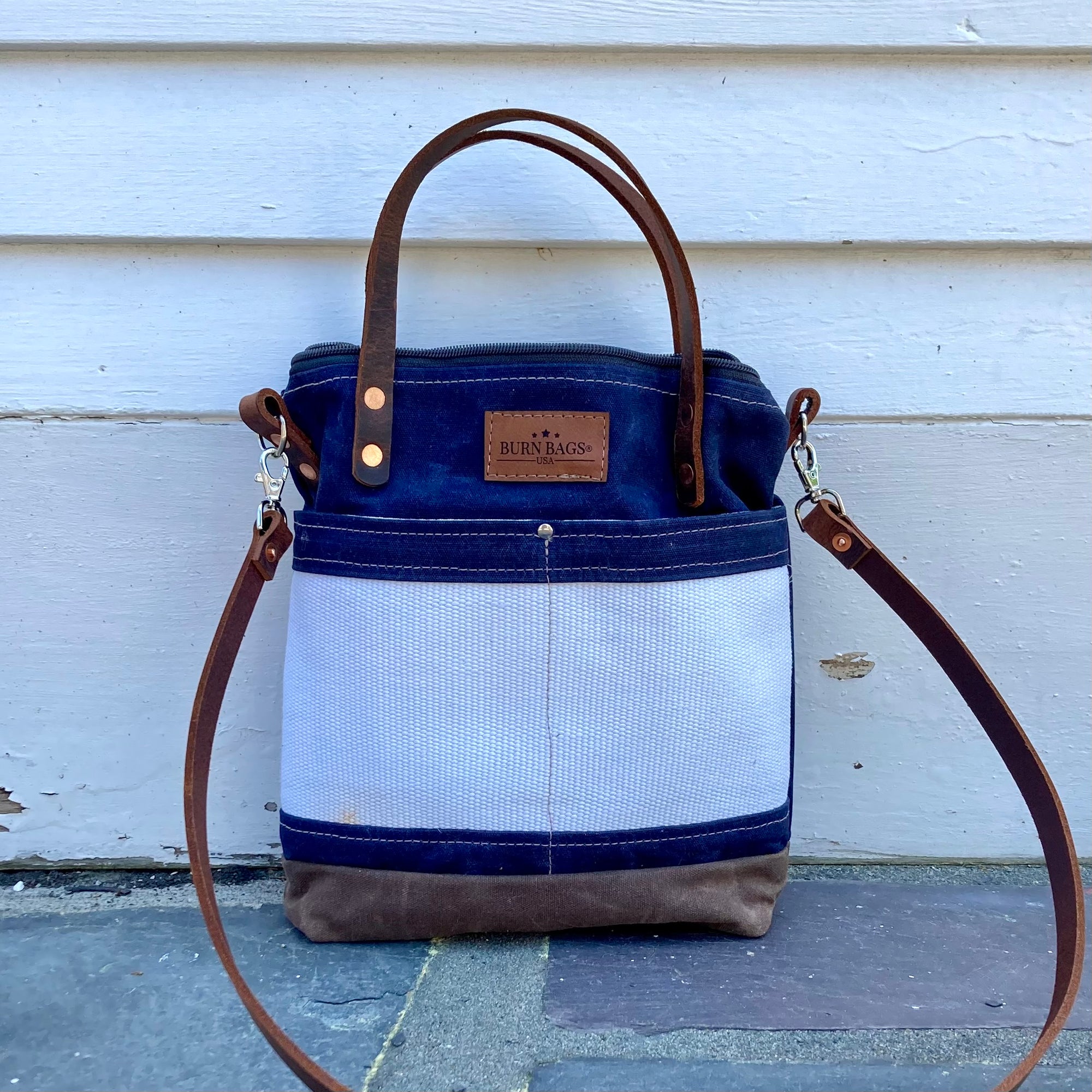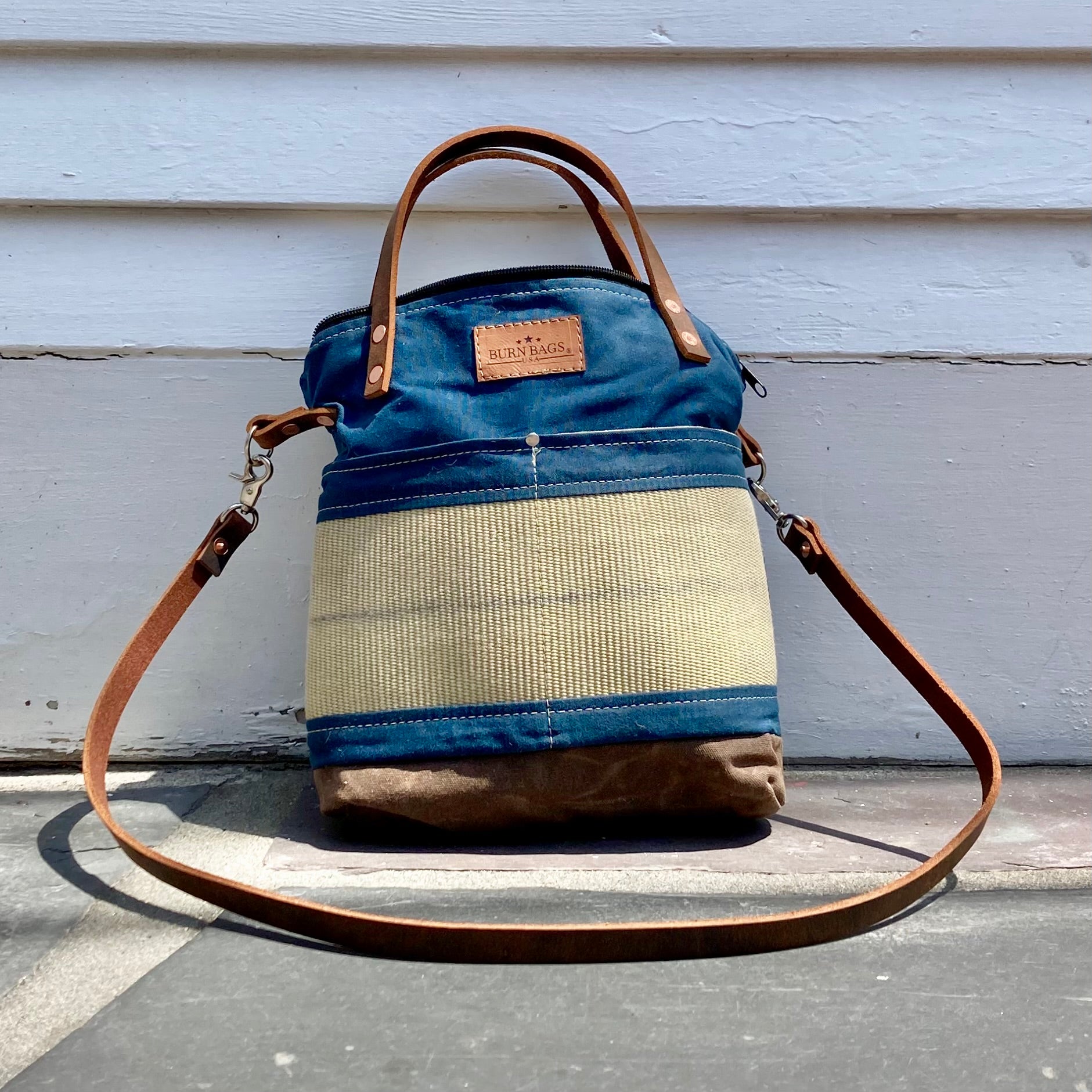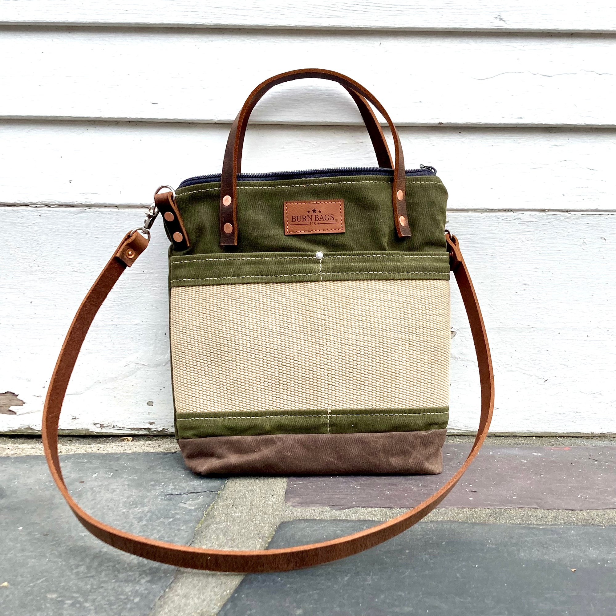 These perfect everyday basics bags are made of heavy duty waxed canvas with thick 1/2" wide leather hand straps and a detachable thick leather shoulder strap, with every detail thought out. The interior canvas includes a pocket, zipper closure at the top to keep your goods secured, copper double grommets holding the straps to the bag and two big exterior pockets.