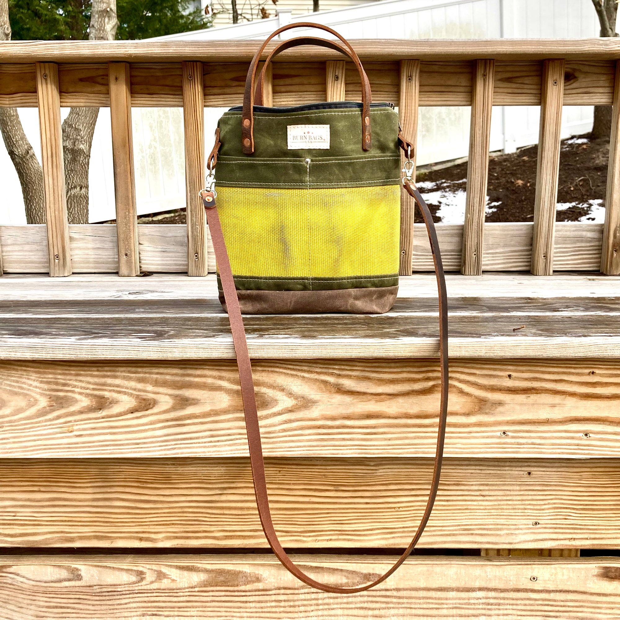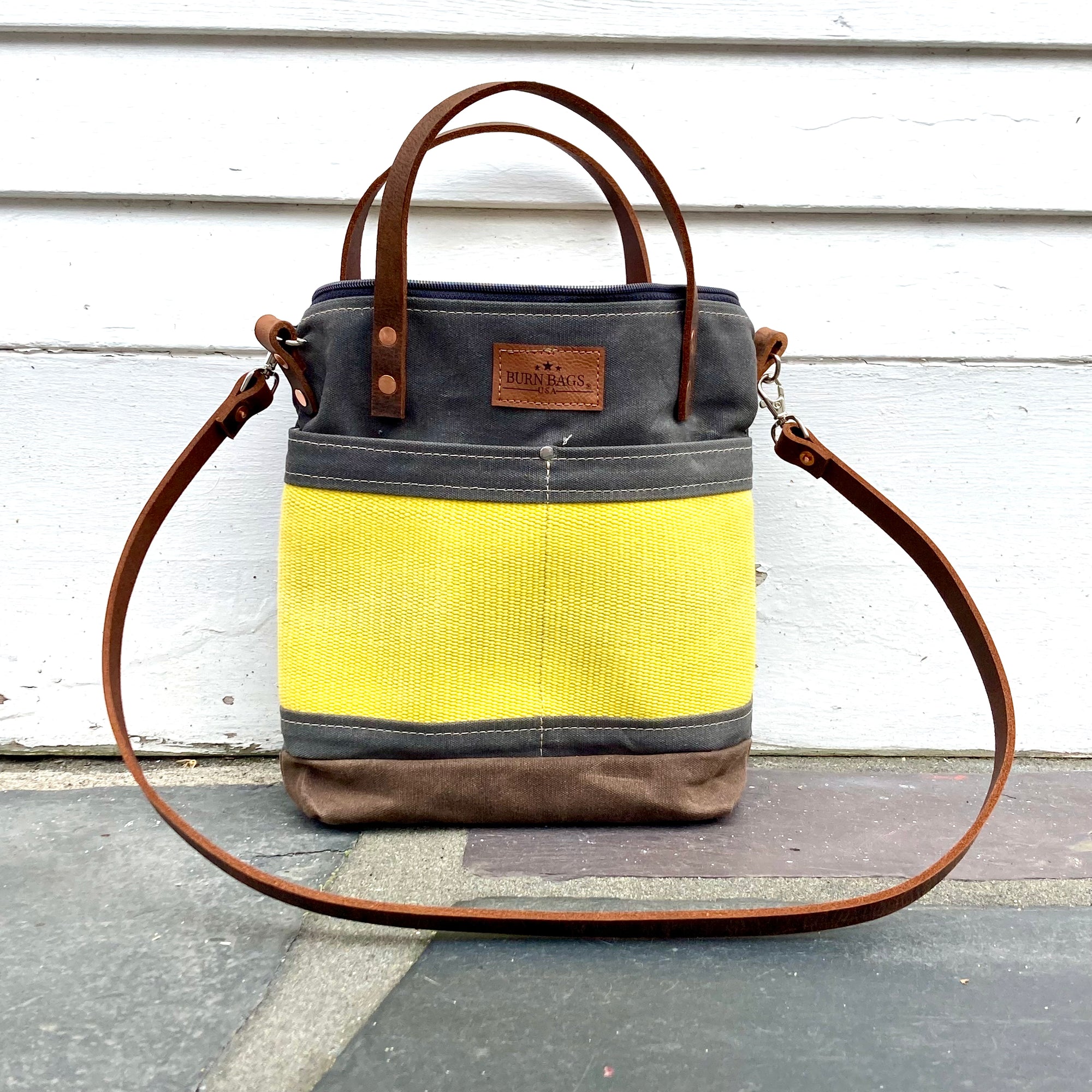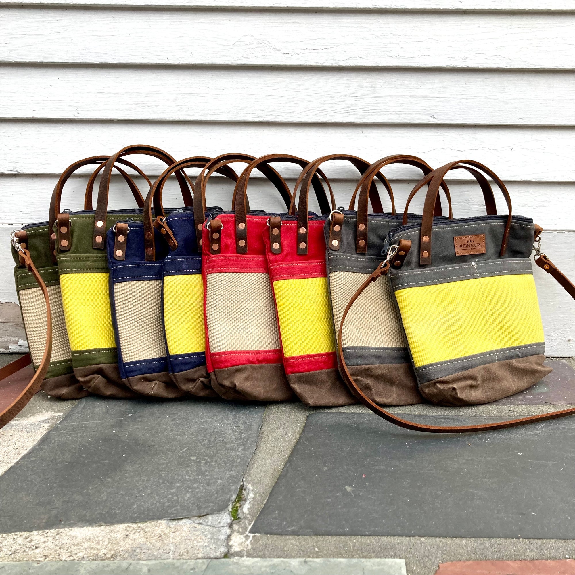 What's with the yellow or white stripe? That's decommissioned Provincetown Fire Department fire hose. Once a hose fails pressure testing, it typically gets thrown away. That's a real shame both because it's nearly indestructible so it will never degrade and also because it's coated with fire retardant, which is bad for the environment. Janelle and her assistants who make these bags carefully strip down the hose, remove the retardant with a solvent soak, and then repurpose the hose into these amazing, functional and beautiful bags.