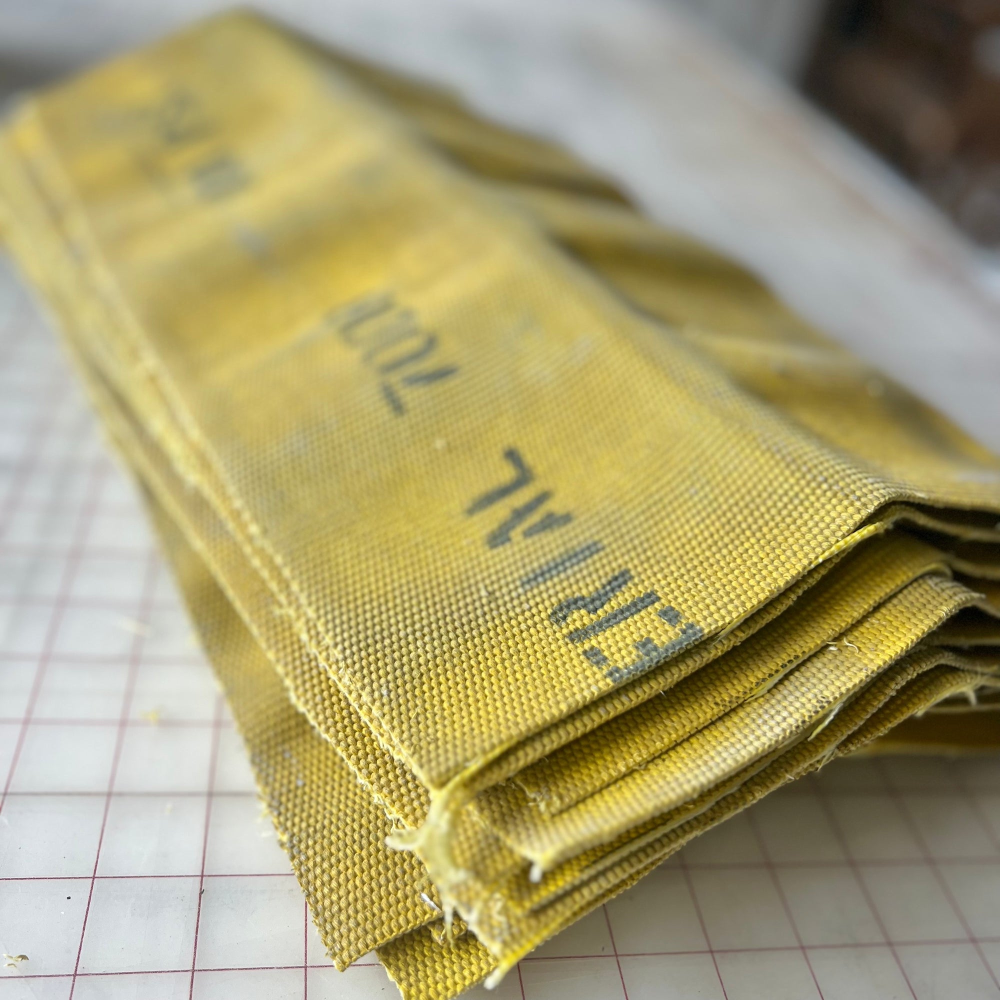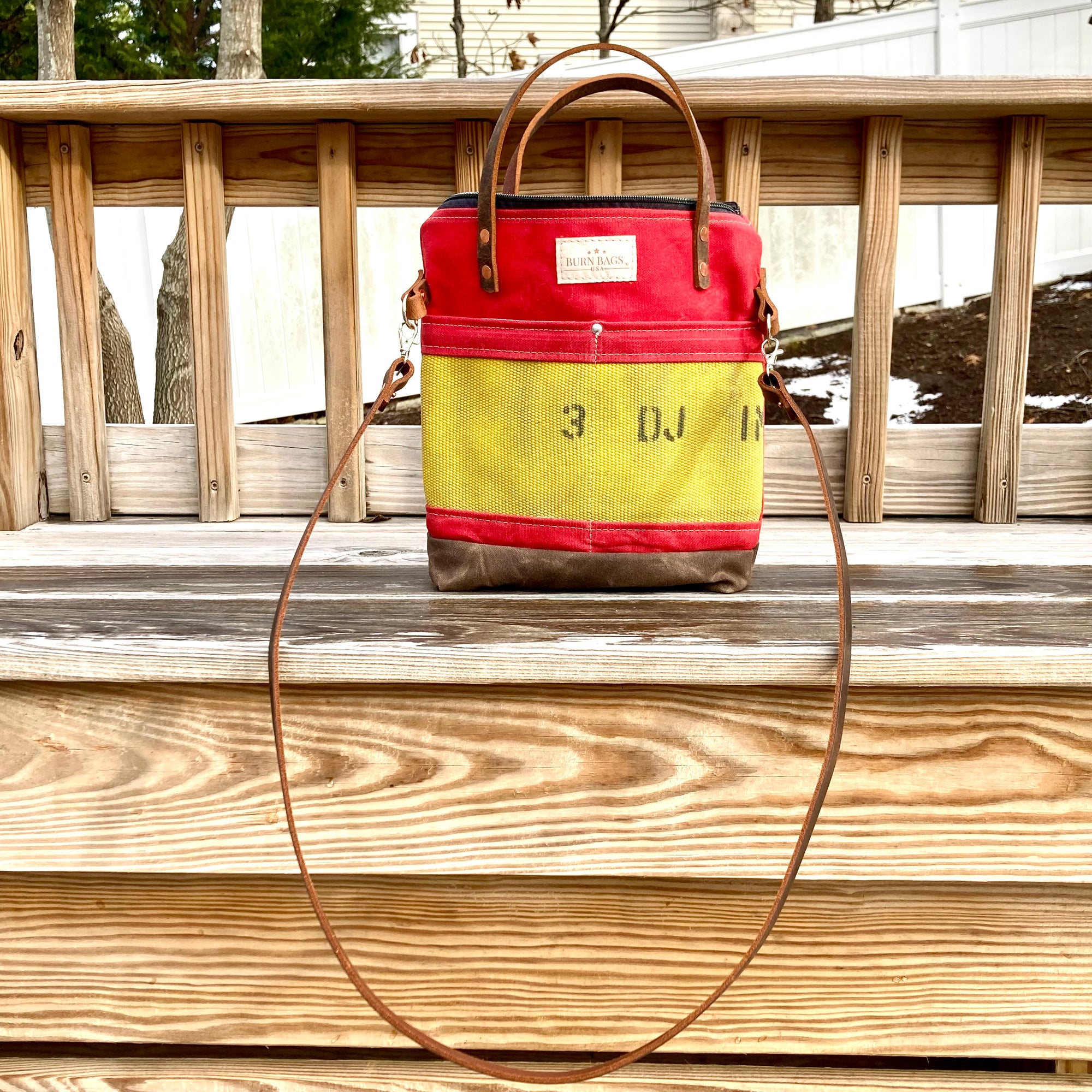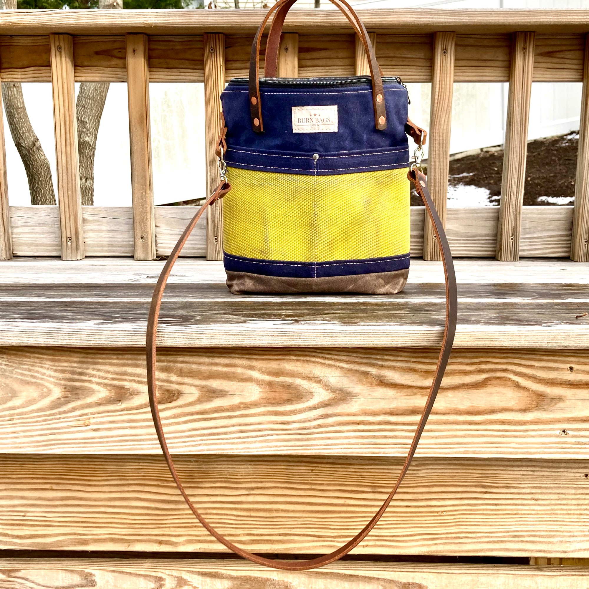 What's with the yellow or white stripe? That's decommissioned Provincetown Fire Department fire hose. Once a hose fails pressure testing, it typically gets thrown away. That's a real shame both because it's nearly indestructible so it will never degrade and also because it's coated with fire retardant, which is bad for the environment. Janelle and her assistants who make these bags carefully strip down the hose, remove the retardant with a solvent soak, and then repurpose the hose into these amazing, functional and beautiful bags.
