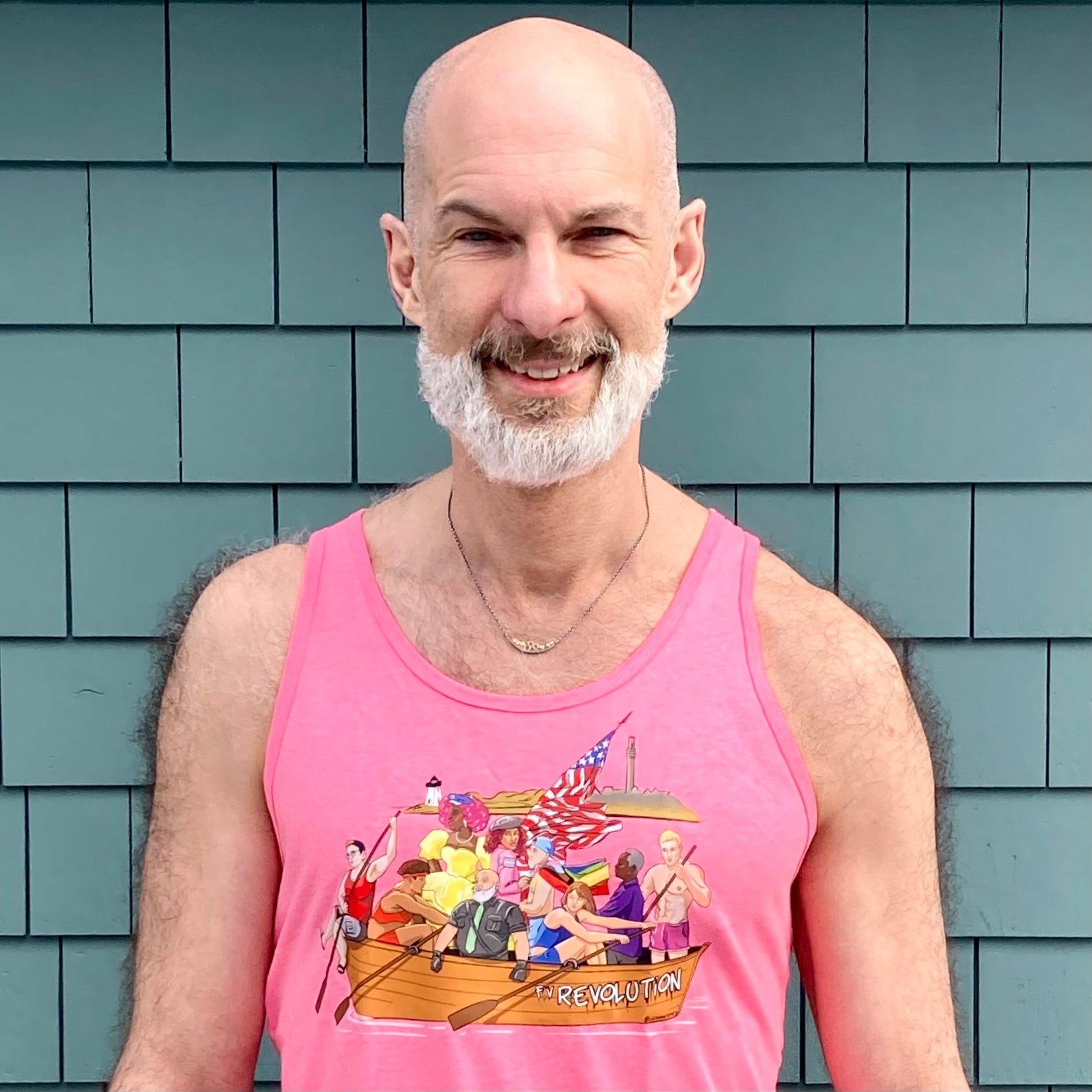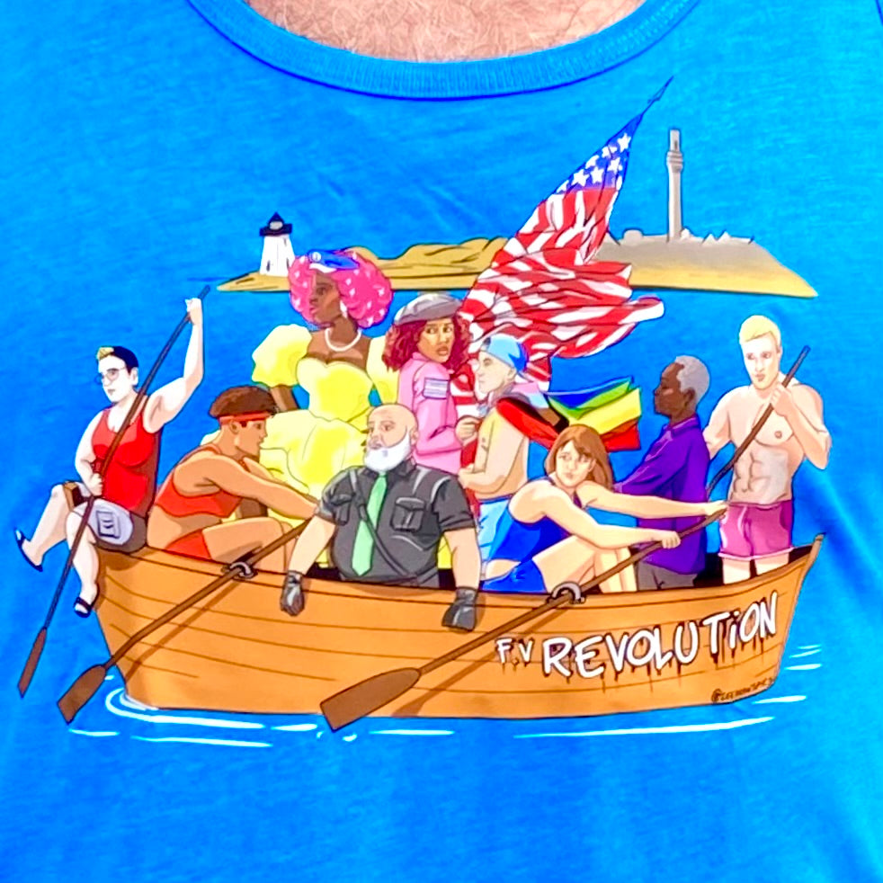 A reimagining of the classic painting of Washington crossing the Delaware by Emanuel Luetze, with a truly Provincetown twist. A Black drag queen leads a kaleidoscope of the LGBTQ community on a fishing vessel from the safety of Provincetown harbor to defend and protect our liberties wherever they are threatened.