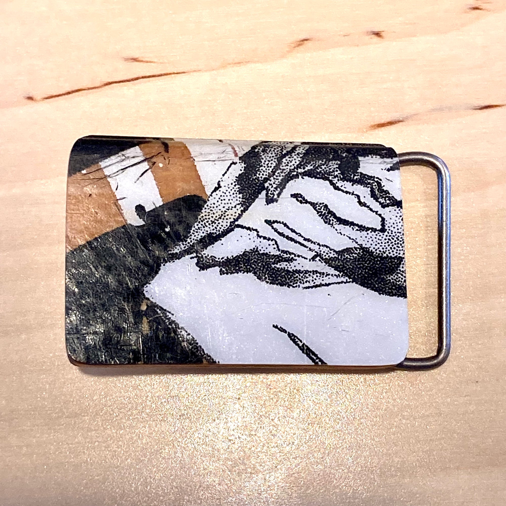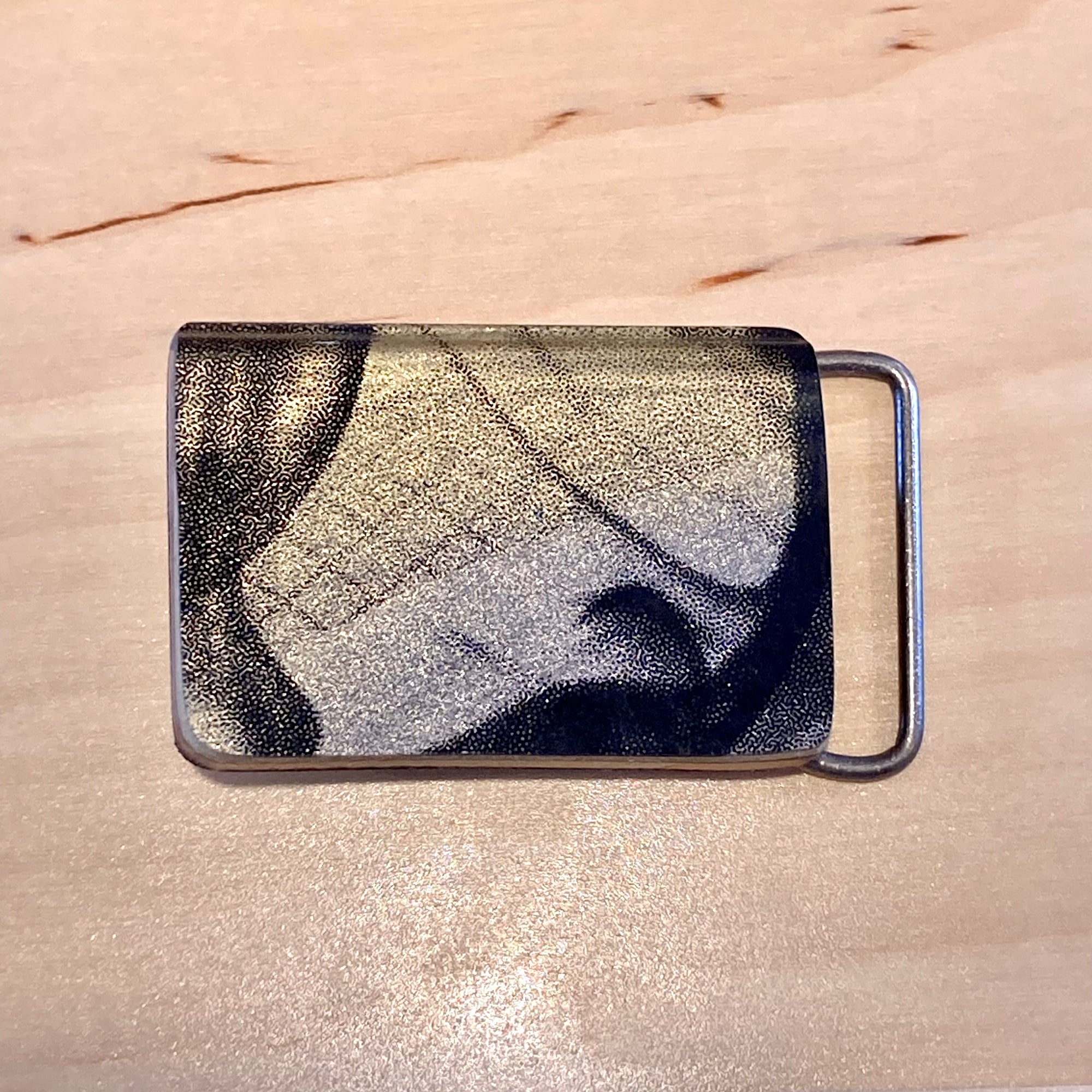 Buckles measure 2.5" long by 1.75" high by 1/4 to 1/2" thick (each one varies; some are flat, some have a curve to the face - all are cool) and weighs approximately 2 ounces.