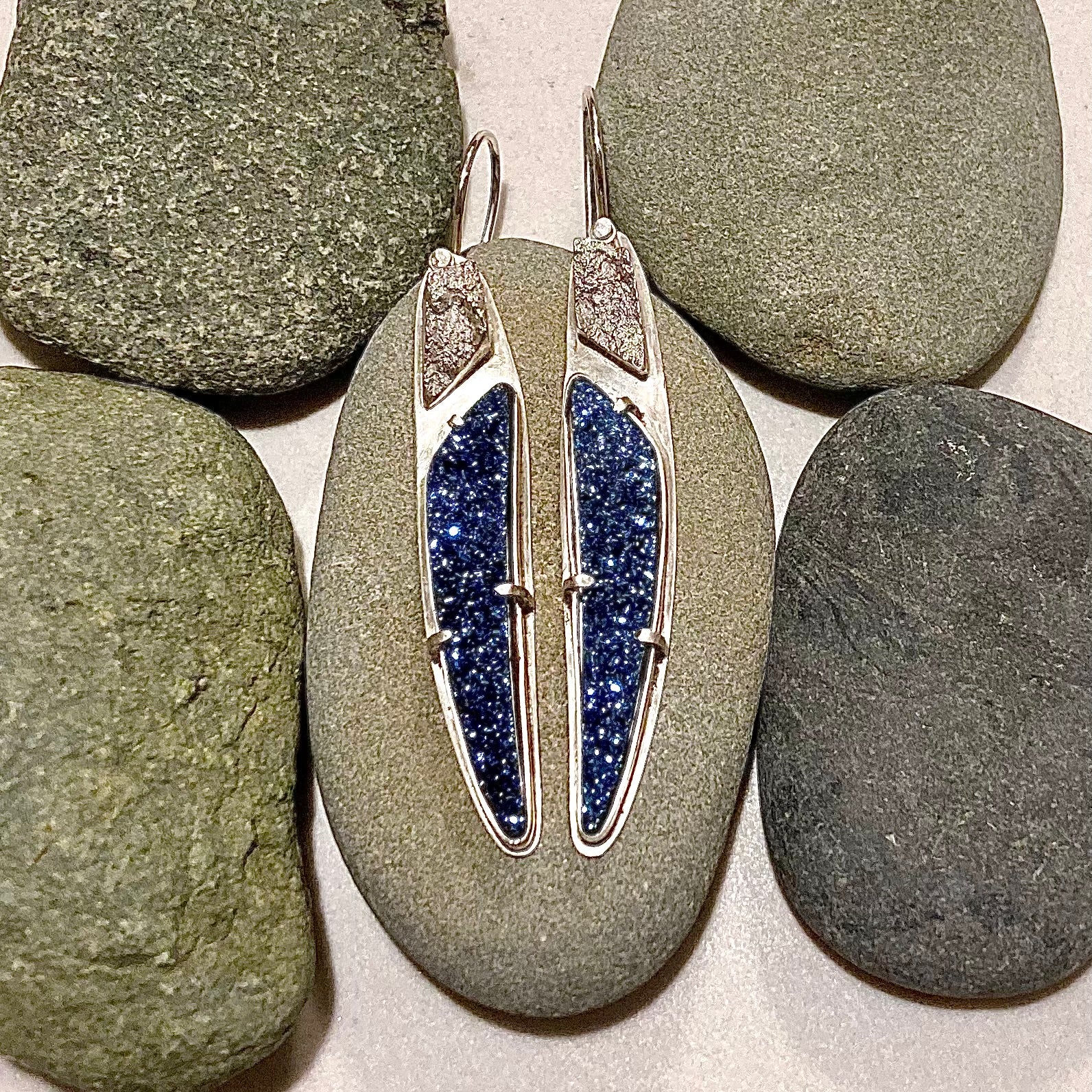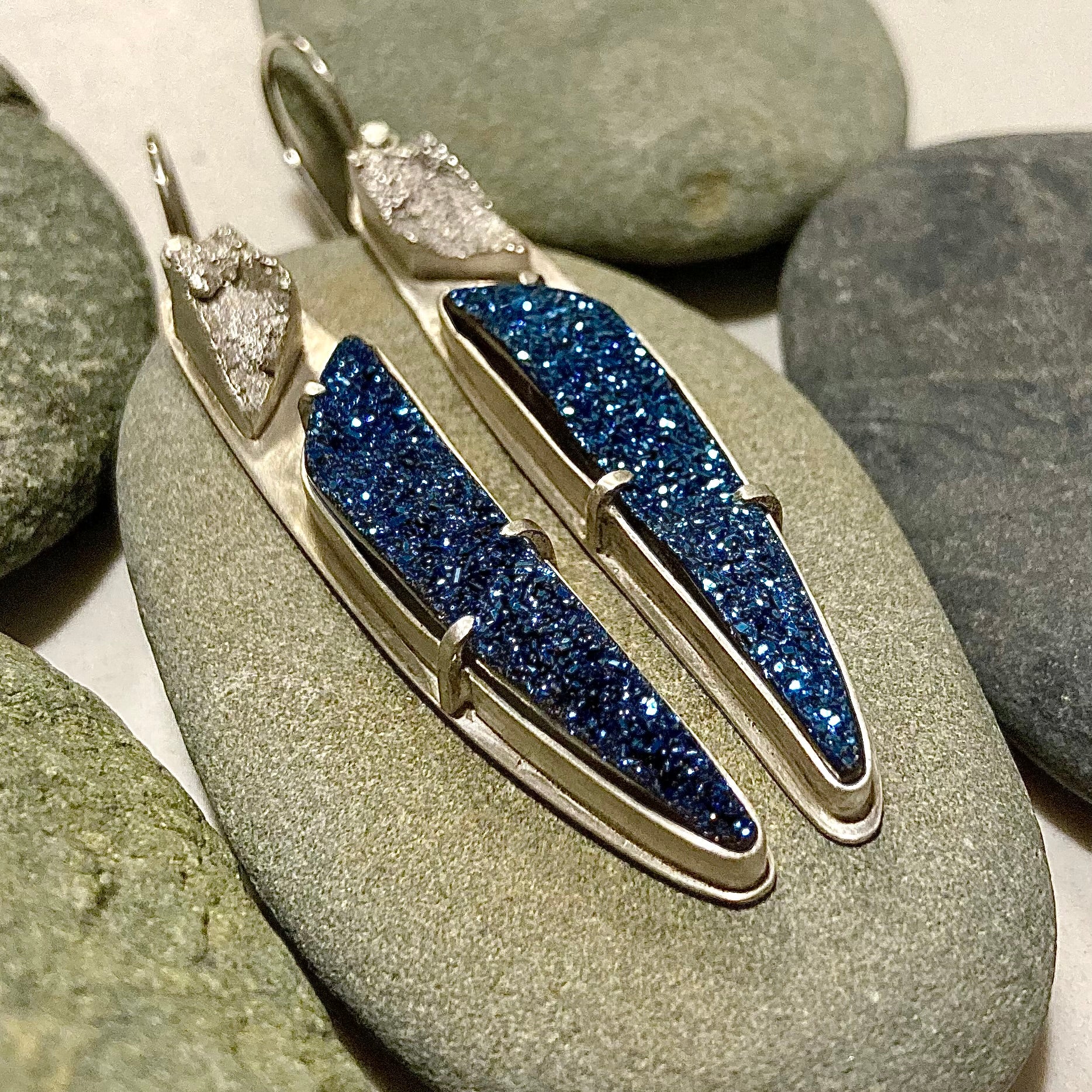 A chunk of broken sterling silver is set above each druzy, with the unique texture of this specially created silver the perfect contrast to the druzy resting below. Broken sterling is sterling silver that is first heated then rapidly cooled and hammered, shattering the metal like glass to create unique textures not normally ever encountered with sterling silver. The maker is a trained metalsmith who has studied blacksmithing. This classic metalworking technique is rarely encountered in jewelry making.