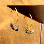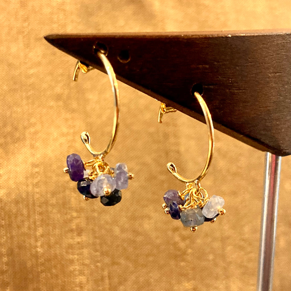 A gathering of rubies in different shades is suspended from an 18K gold open hoop earring to catch the light and the eye as they gracefully move with you.