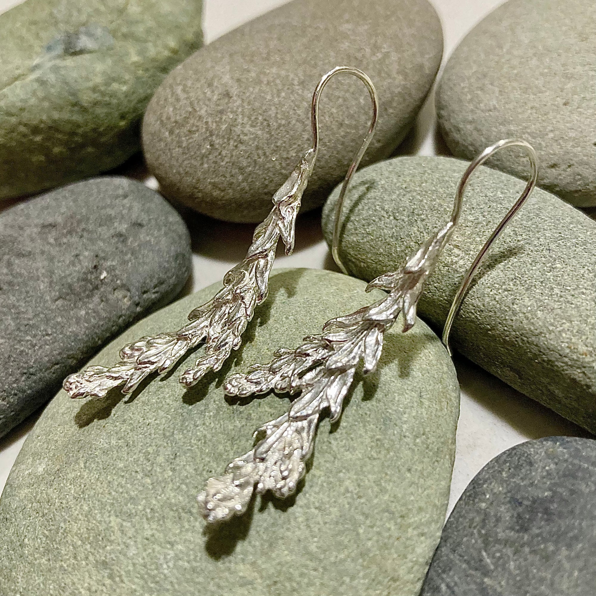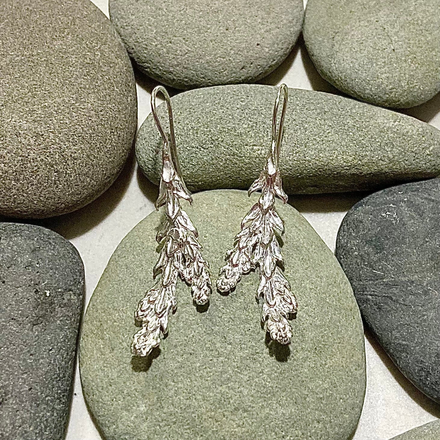 Two highly detailed cedar needles that gently curve to accentuate the jawline are cast in sterling silver and suspended from French hook ear wires with silicone backings.