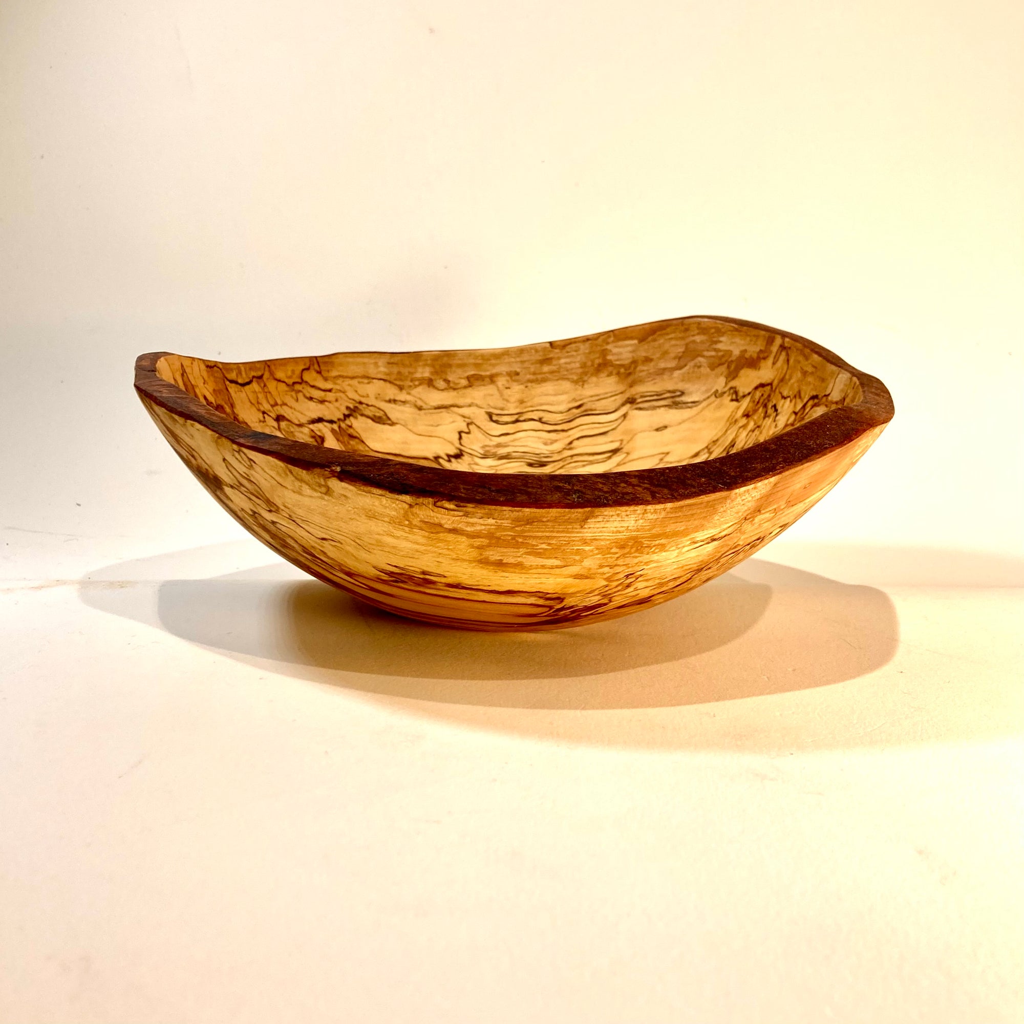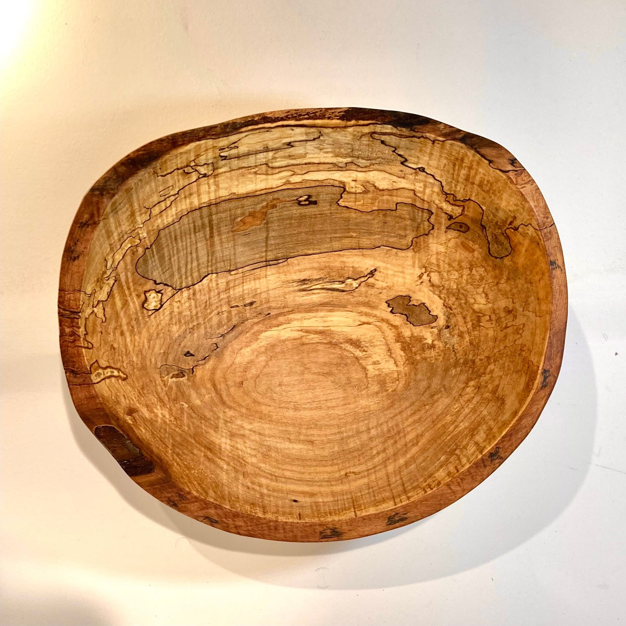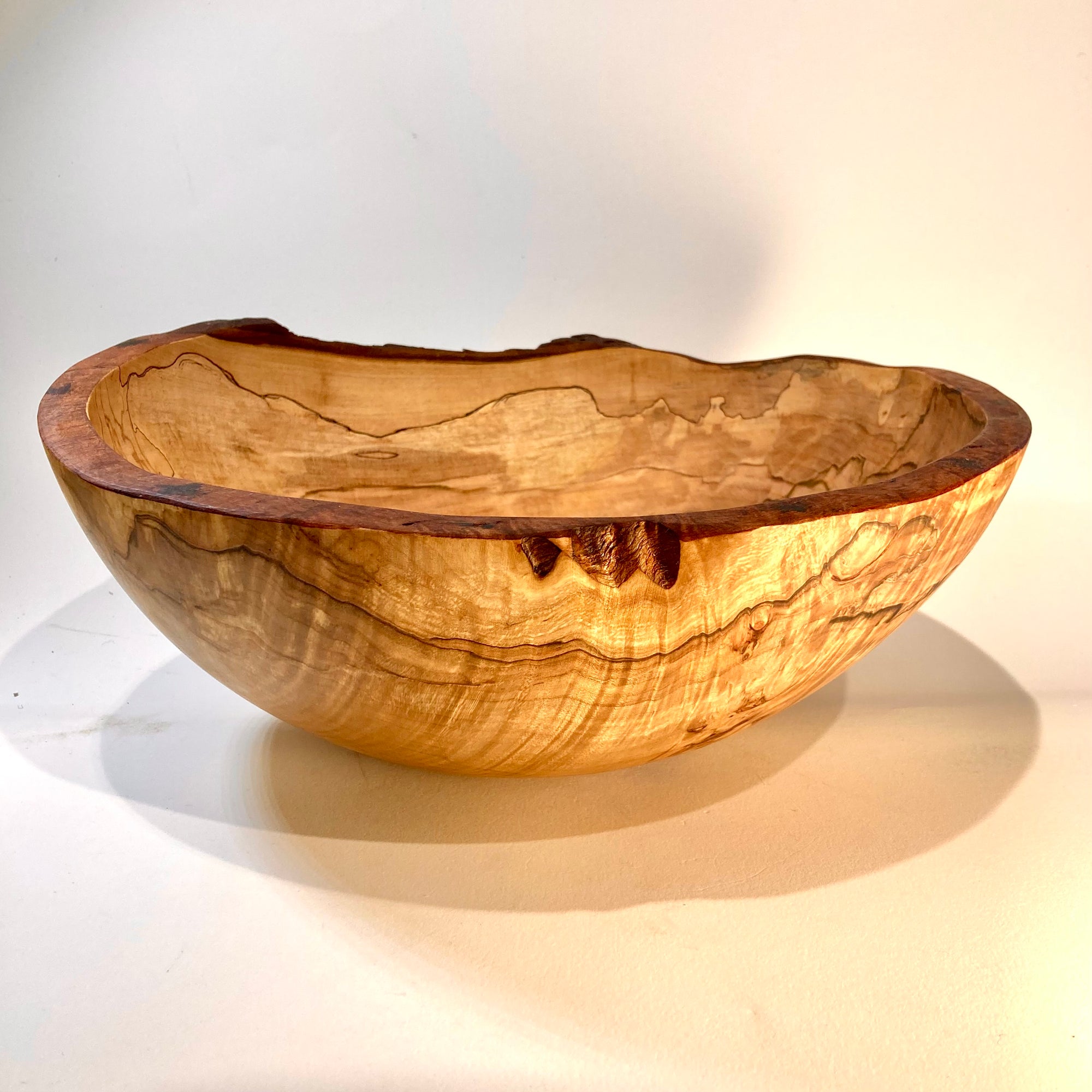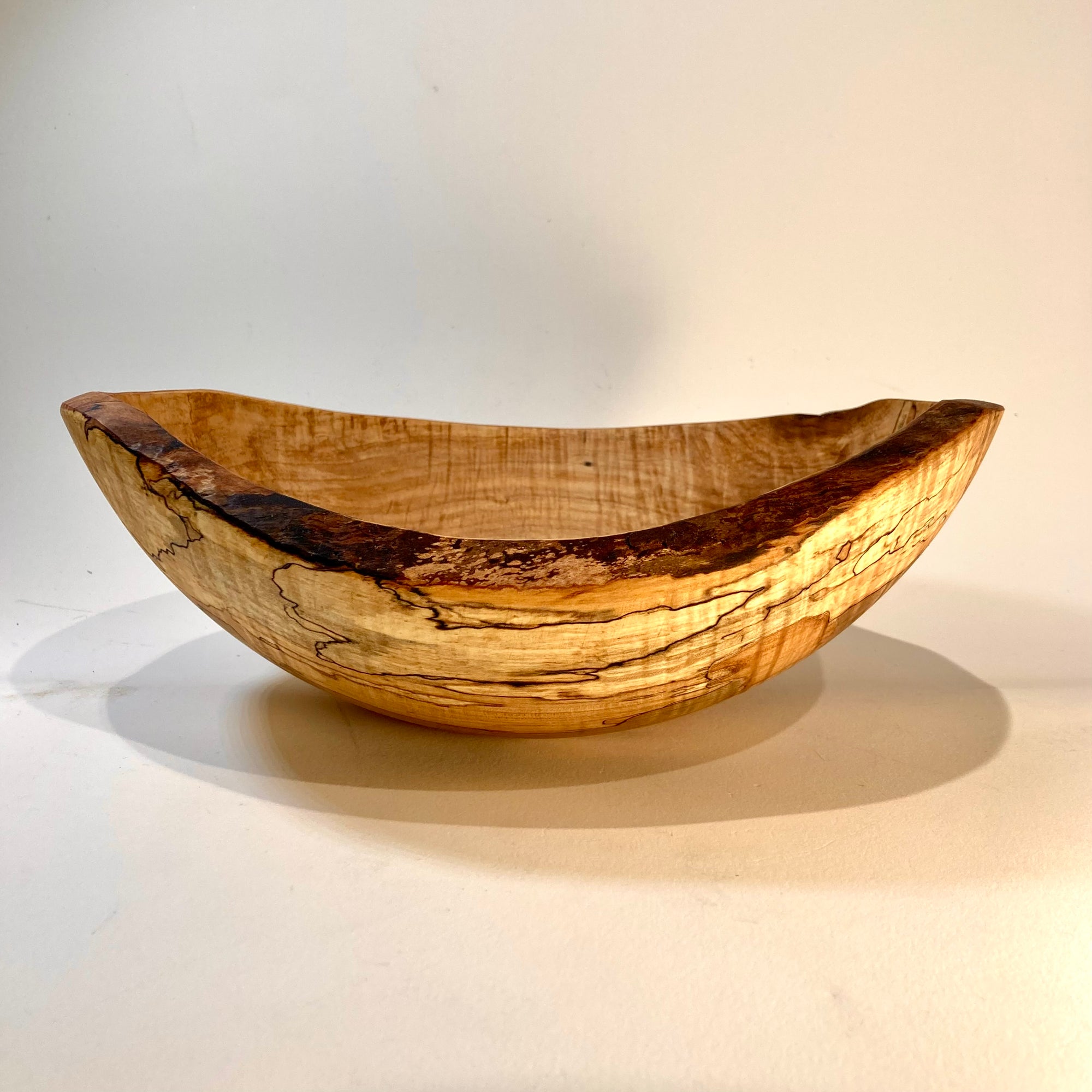 When maple trees are felled by storms or age they begin decaying, creating "spalting" or complex patterns of darkened lines and patterns within the grain. The maker collects these naturally beautiful pieces of wood where he lives in Western Massachusetts and turns them on a lathe of his own design, creating incredibly beautiful, functional bowls suitable for everyday use and centerpiece display.