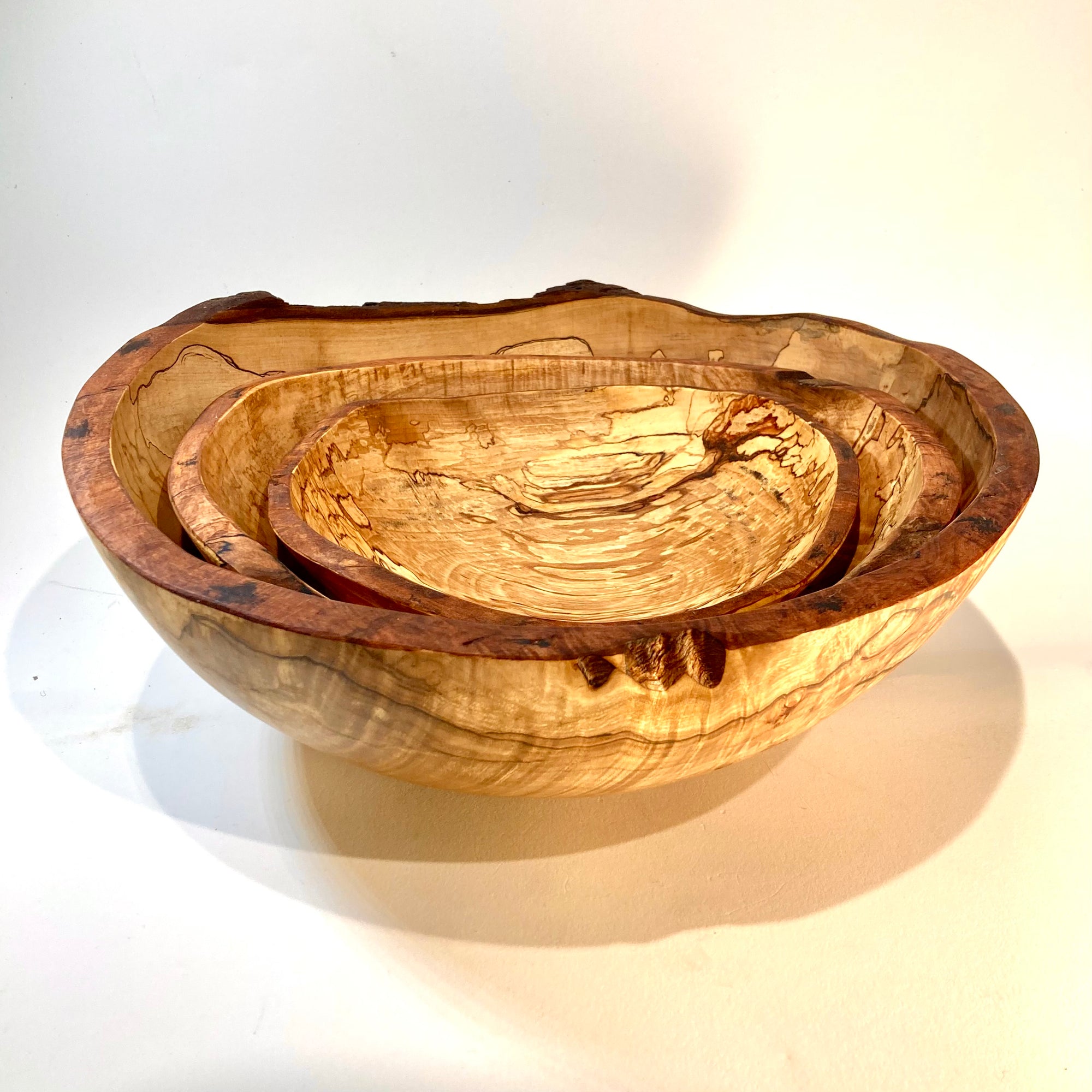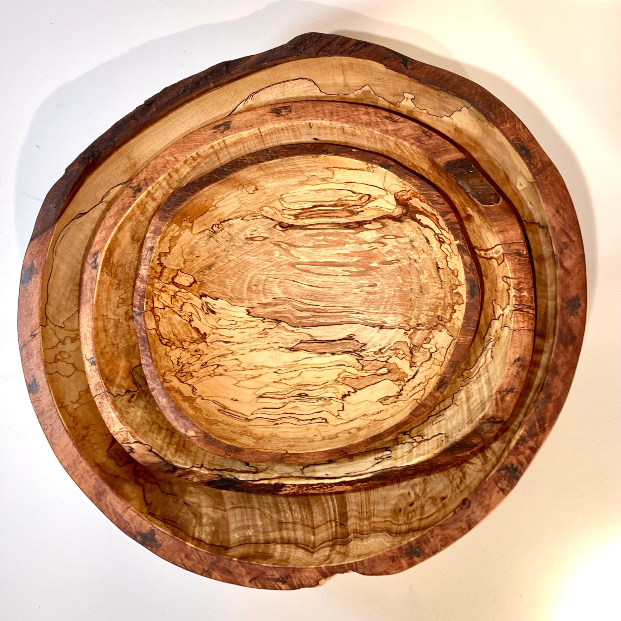 No two bowls will ever be alike; the alchemy of nature's patterns combined with the handwork of the maker creates one of a kind pieces, which nonetheless come in standardized sizes for nesting together as sets if desired.