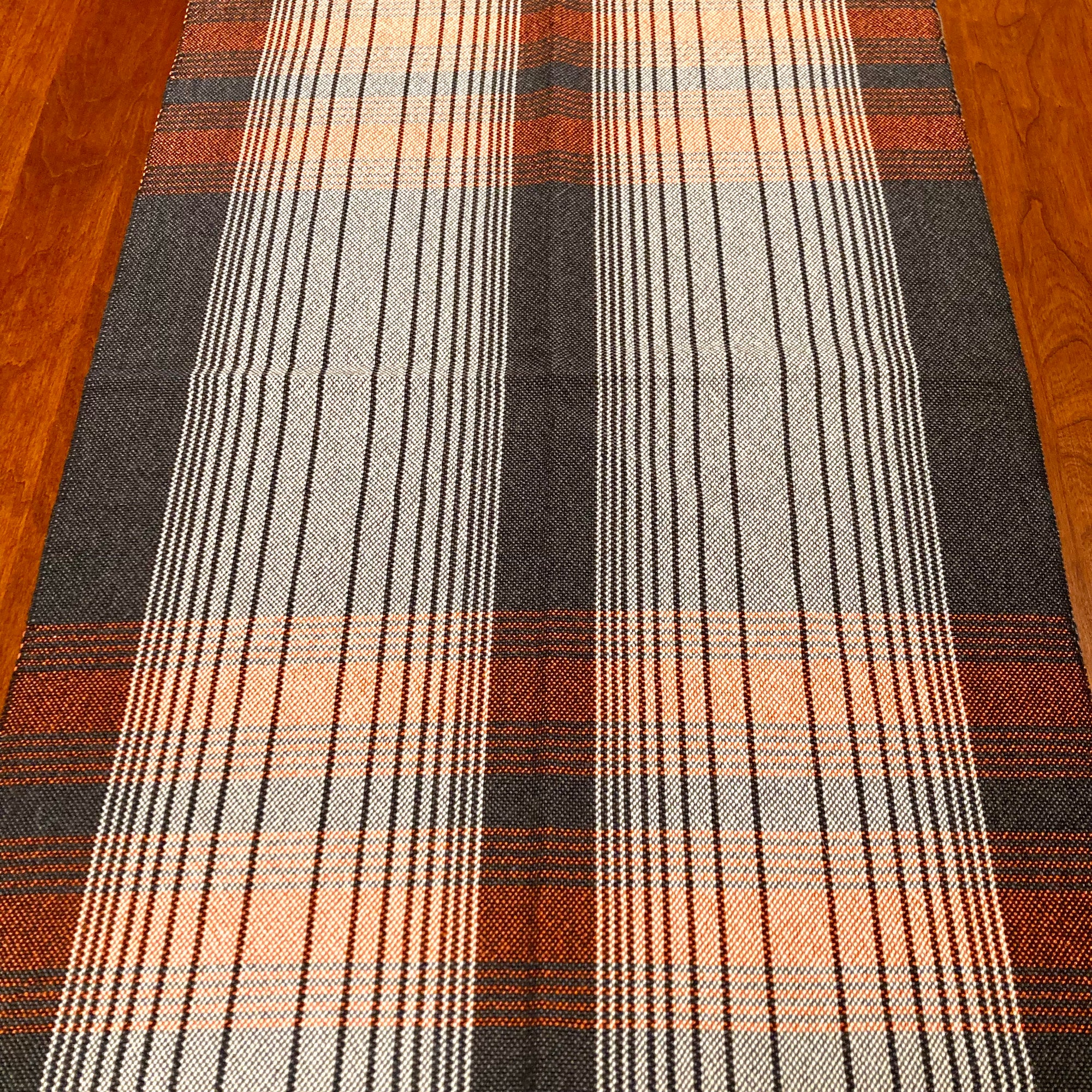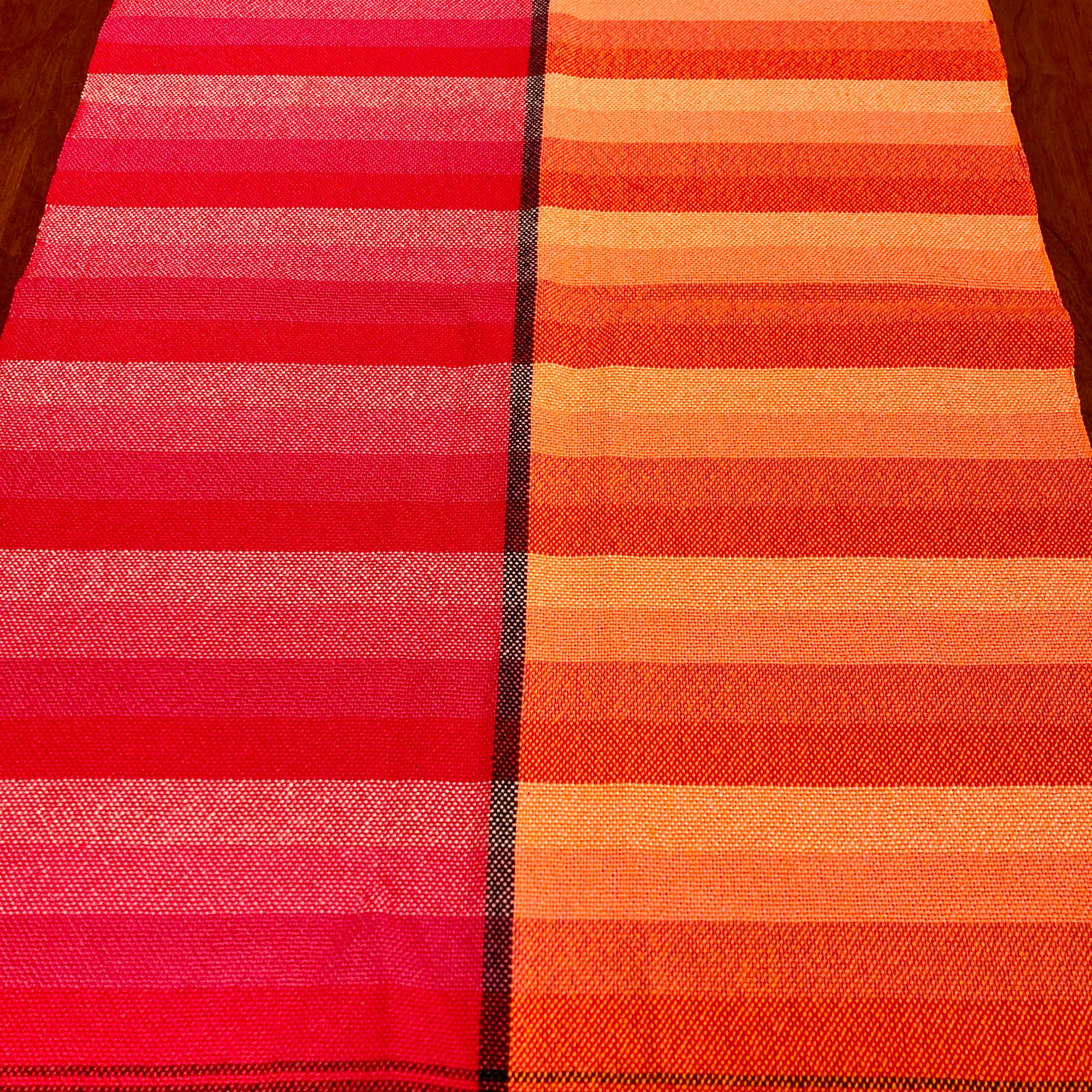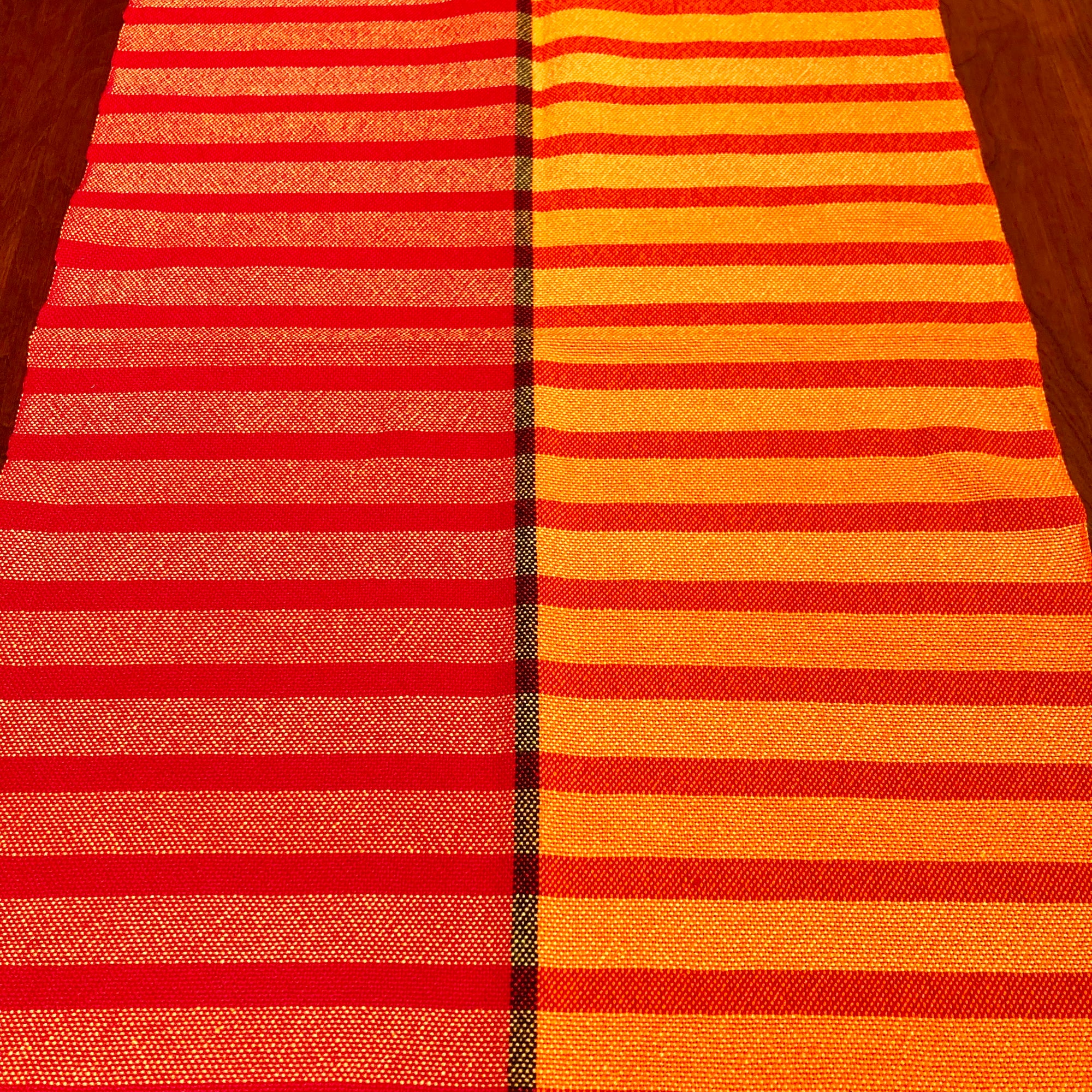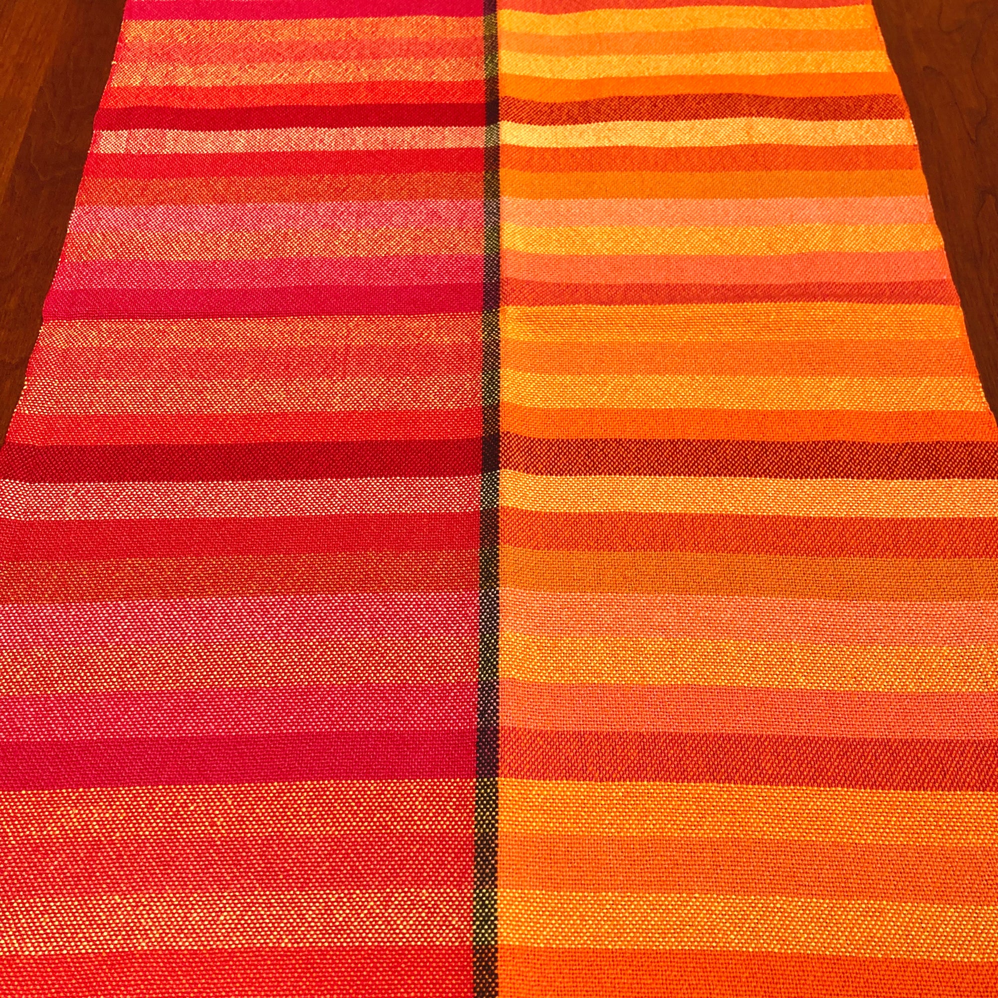 The yarns are loomed on a hand loom then hand finished with a loop for hanging and machine washed to test for color fastness; every detail has been thought out. No two are typically alike, although I try to match up coordinating and similar patterns and colors for those interested in purchasing pairs.