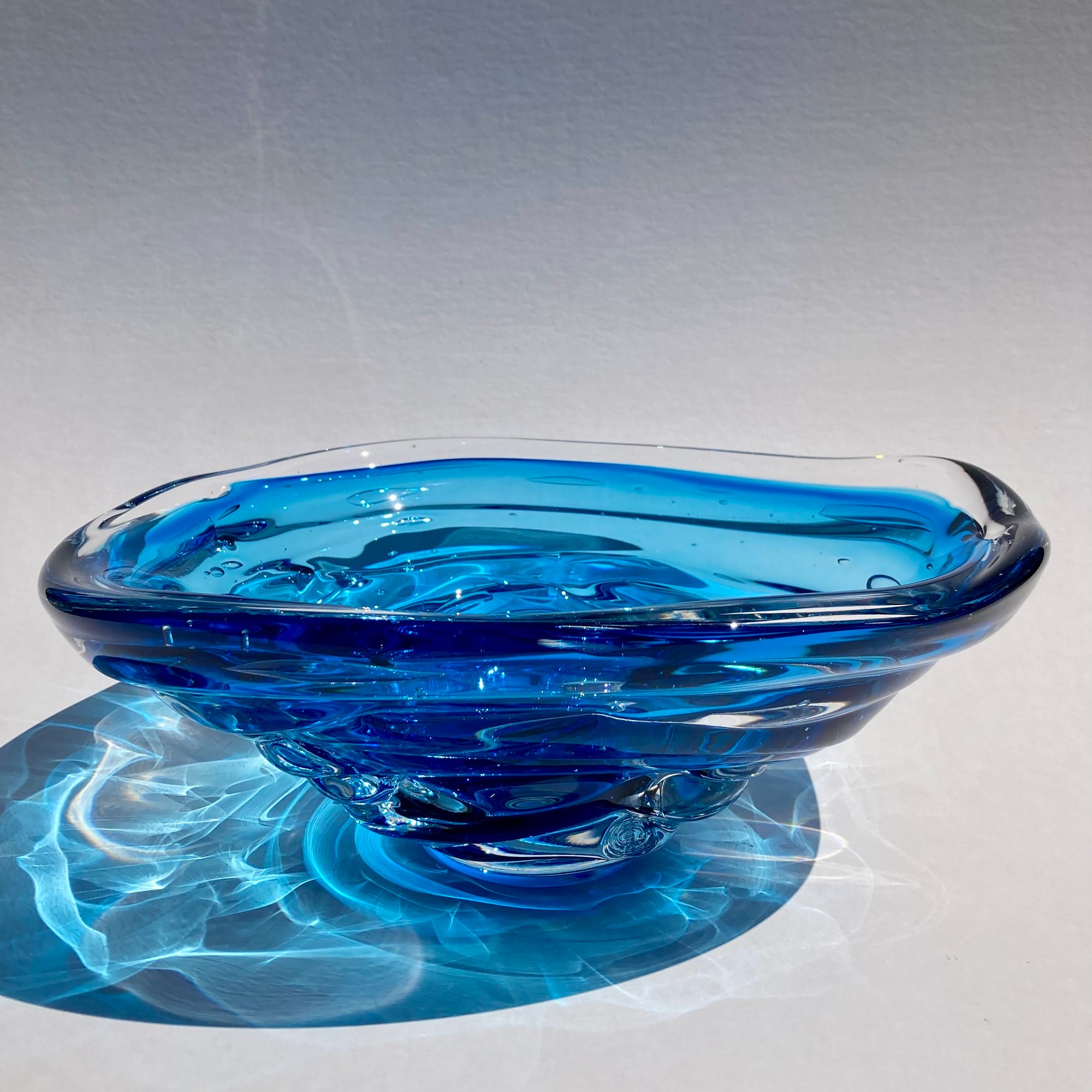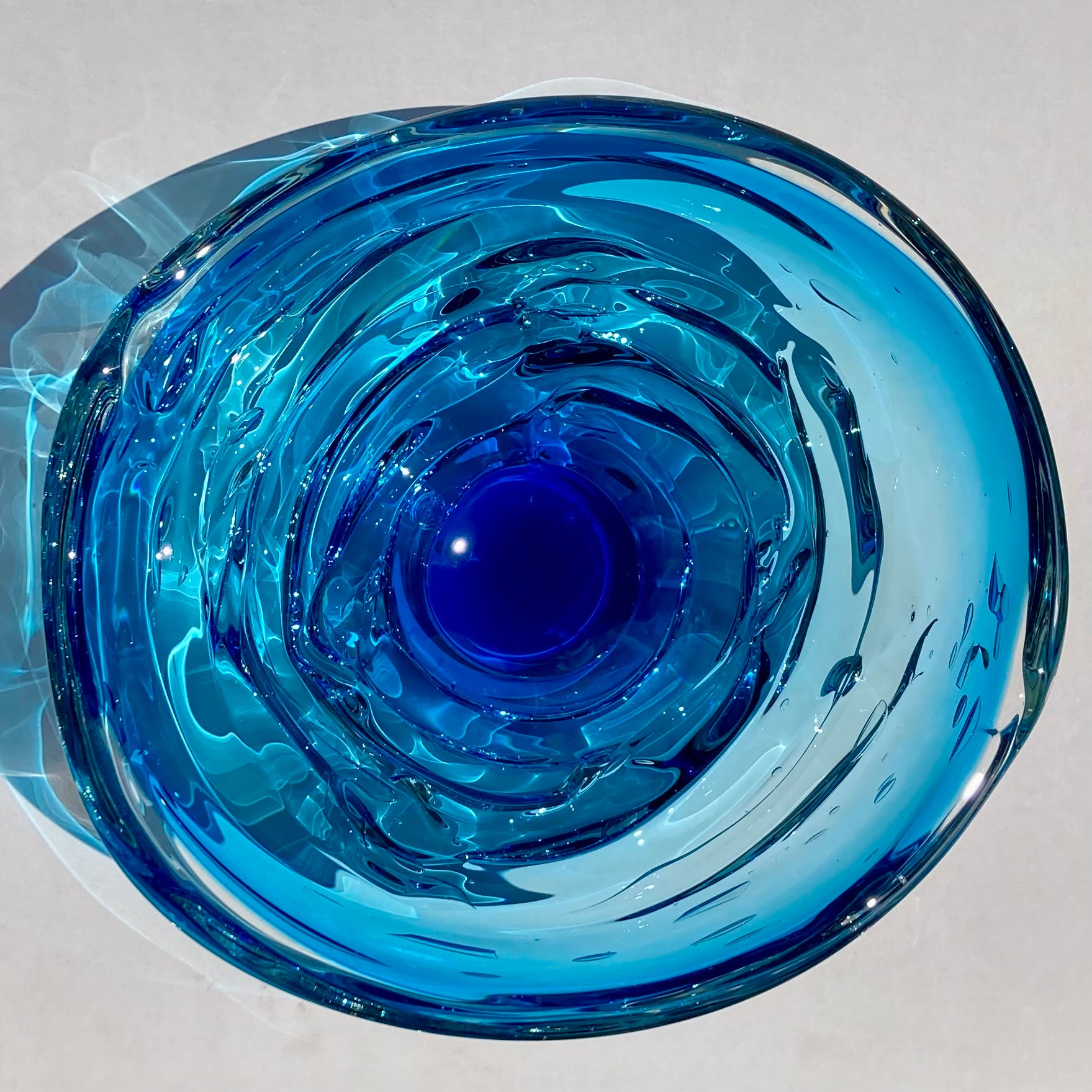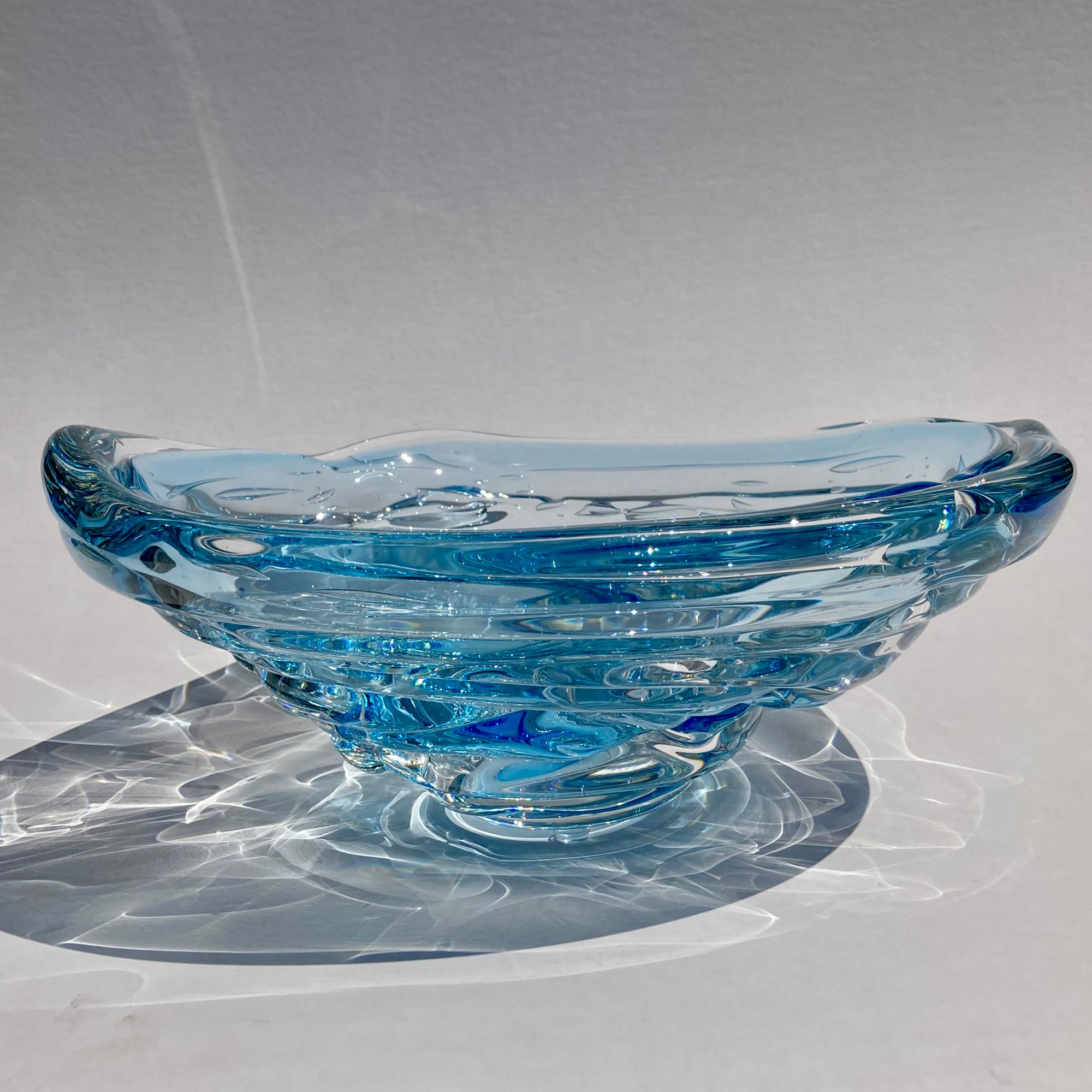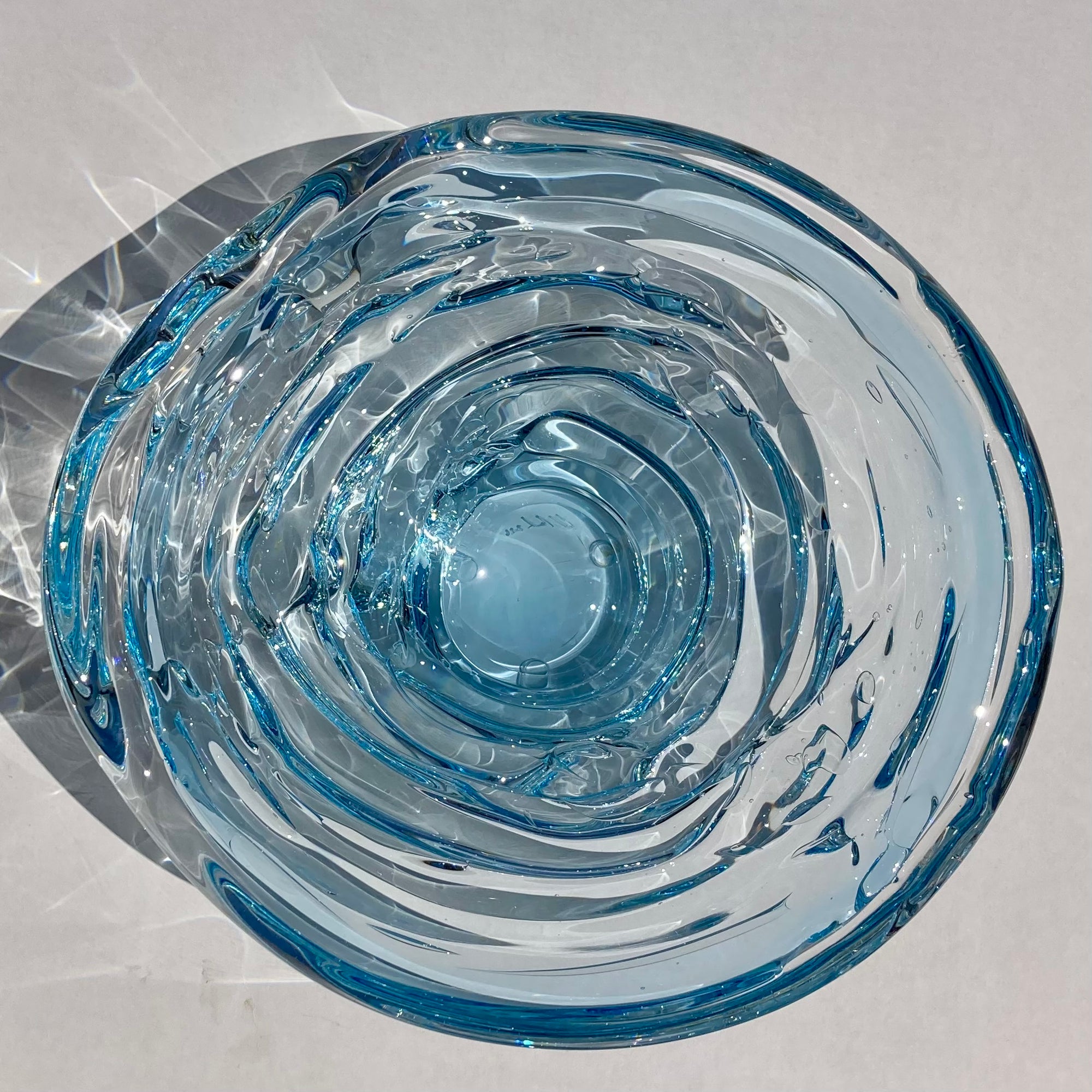 Inspired by the canyons and turbulent waters of the maker's home region in Alabama, these bowls beautifully capture the energy of flowing water. I have owned one of these bowls for 20 years. I enjoy the play of sunlight through the glass in the afternoons, creating reflections and shadows as if the glass has transmuted back to liquid once again. It is also an incredibly sensual piece; it begs to be touched, with it's organic, layered, rounded shape. Truly, these bowls engage the senses like few other works in glass can. Each piece is signed and stamped by the maker.