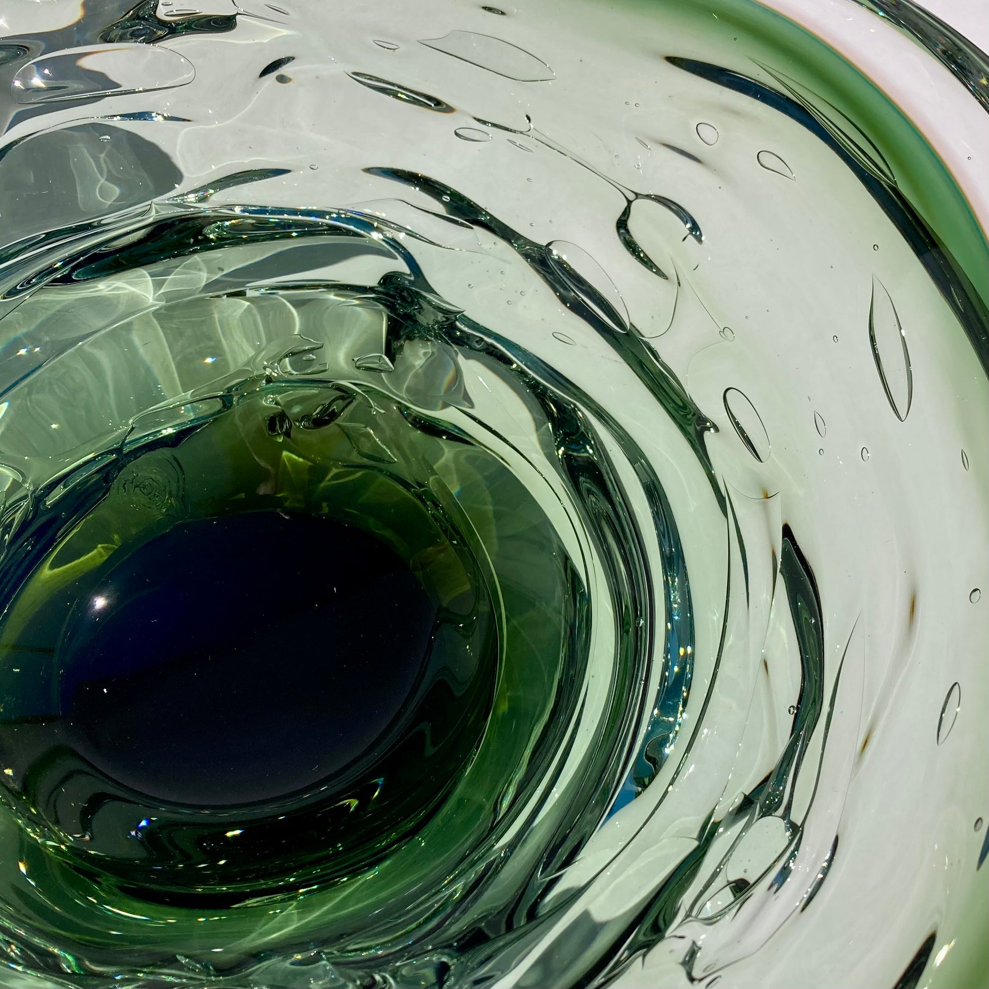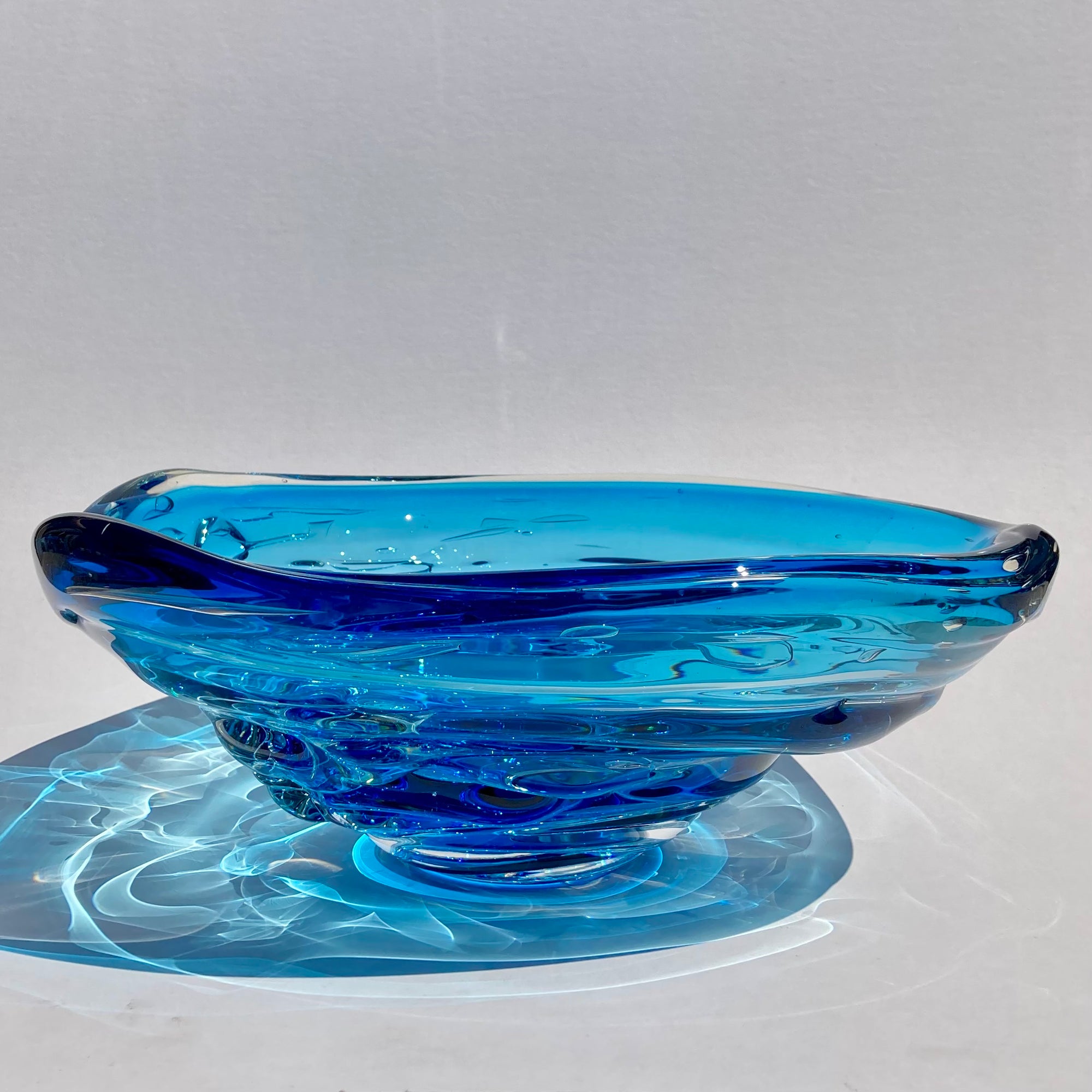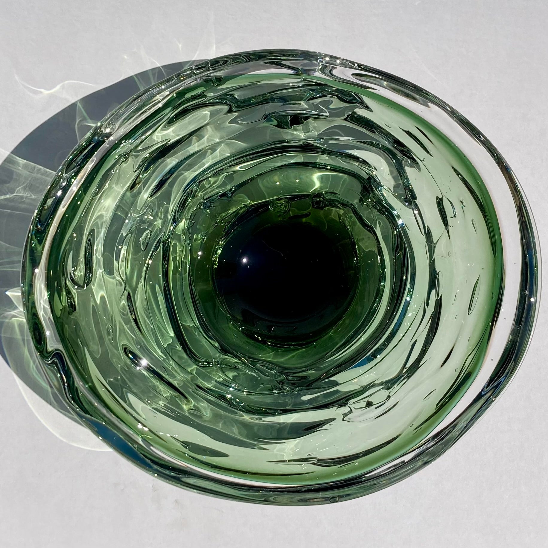 Inspired by the canyons and turbulent waters of the maker's home region in Alabama, these bowls beautifully capture the energy of flowing water. I have owned one of these bowls for 20 years. I enjoy the play of sunlight through the glass in the afternoons, creating reflections and shadows as if the glass has transmuted back to liquid once again. It is also an incredibly sensual piece; it begs to be touched, with it's organic, layered, rounded shape. Truly, these bowls engage the senses like few other works in glass can. Each piece is signed and stamped by the maker.
