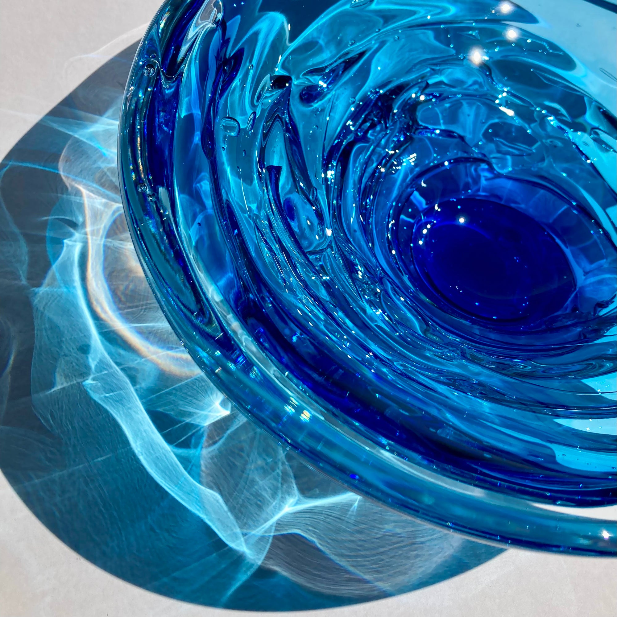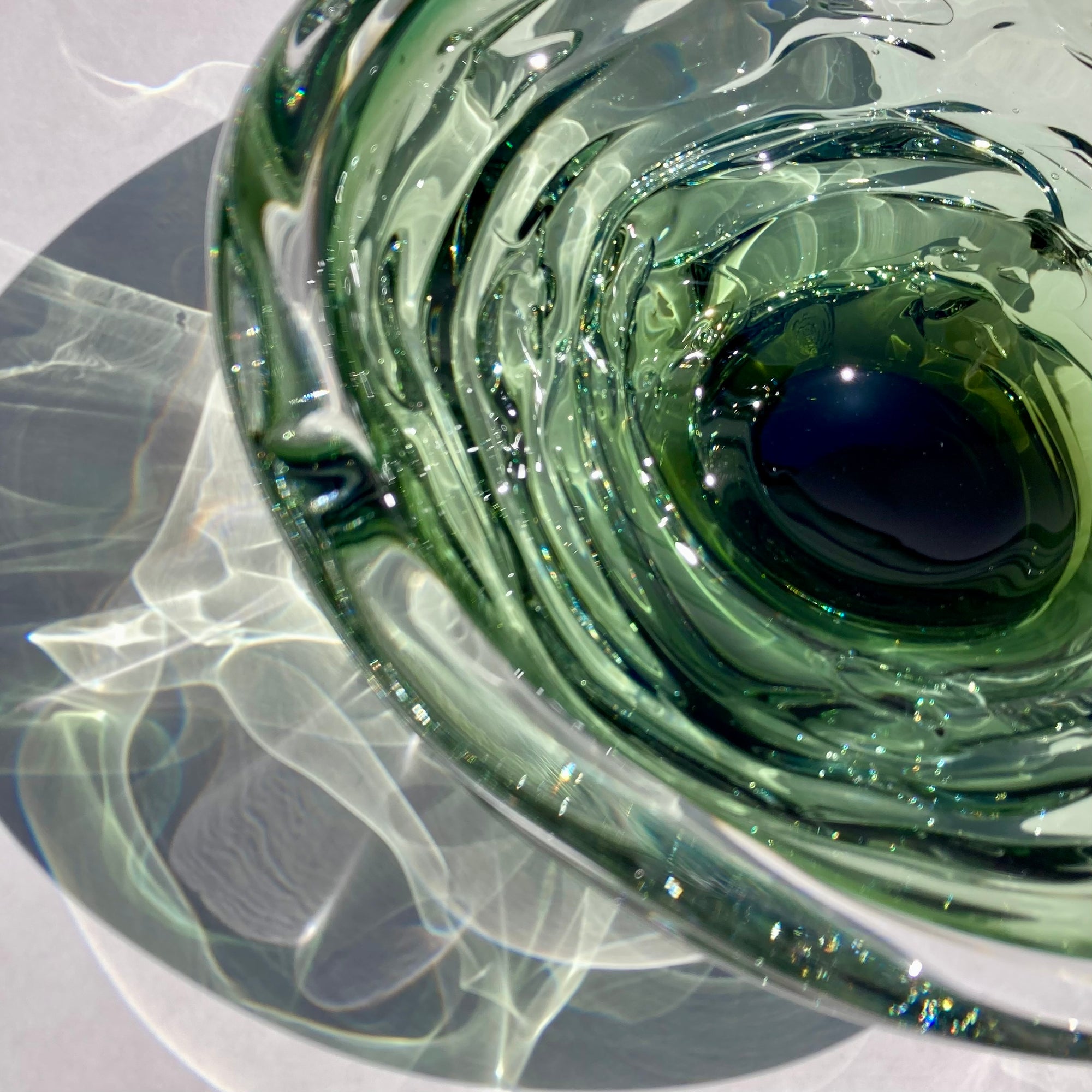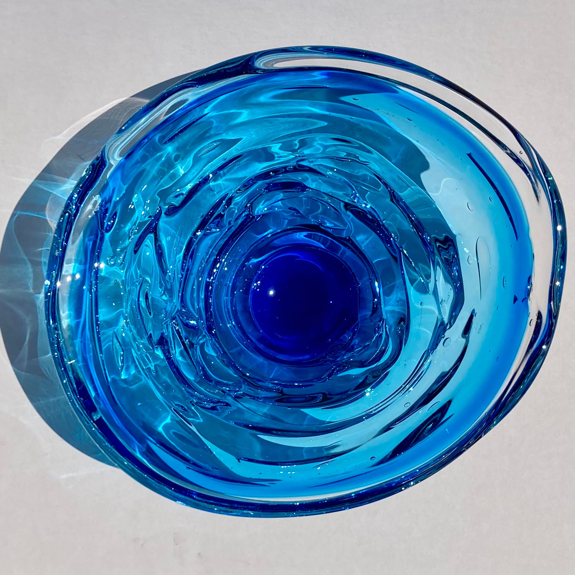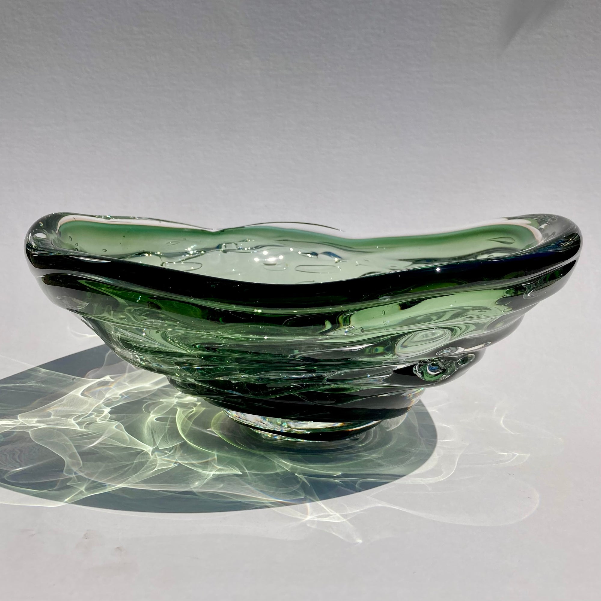 Inspired by the canyons and turbulent waters of the maker's home region in Alabama, these bowls beautifully capture the energy of flowing water. I have owned one of these bowls for 20 years. I enjoy the play of sunlight through the glass in the afternoons, creating reflections and shadows as if the glass has transmuted back to liquid once again. It is also an incredibly sensual piece; it begs to be touched, with it's organic, layered, rounded shape. Truly, these bowls engage the senses like few other works in glass can. Each piece is signed and stamped by the maker.