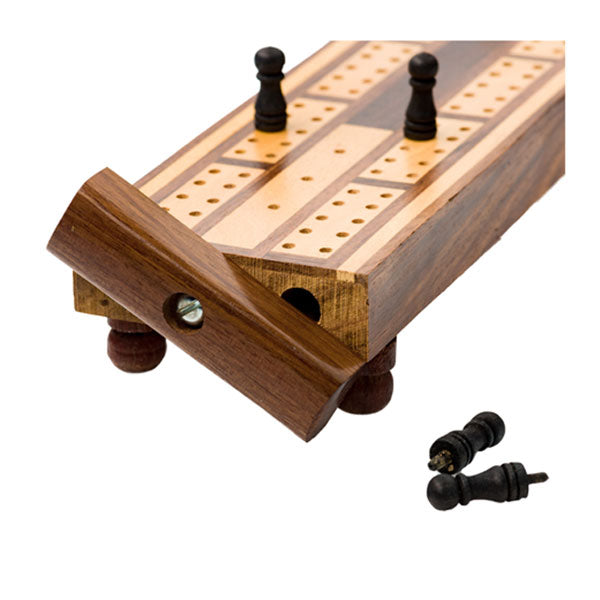 Hand carved in Northeastern India by Muslim woodcarvers of sustainably managed and harvested rosewood and haldu wood, this classic game is the perfect size for travel or for display on a countertop. Pieces store conveniently inside the board, secured behind a wood swivel closure.