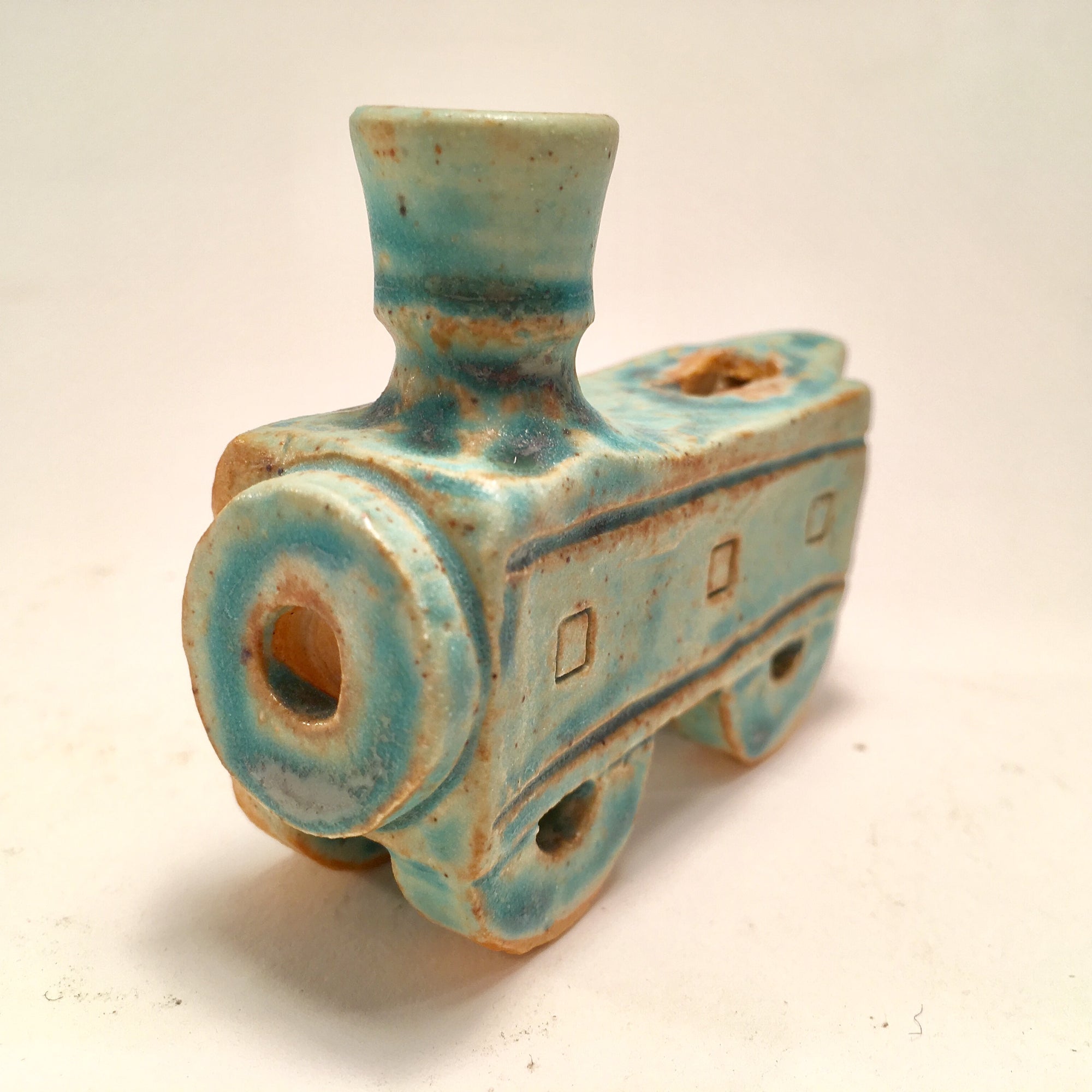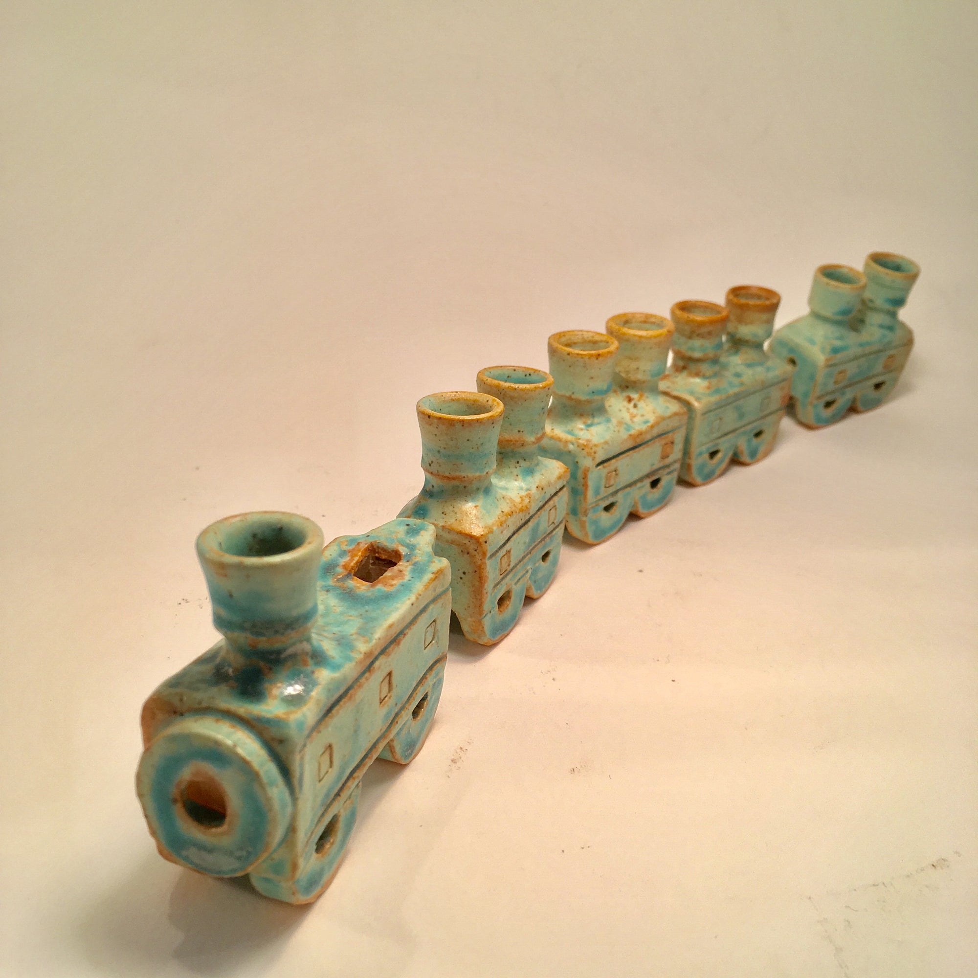 This ceramic train will toot it's way into your heart. Handmade ceramic with a green earthenware glaze, it is a totally functional Hanukkah menorah, holding the eight candles for the eight nights on the four cars, with the "shamash" or worker candle used to light the others atop the locomotive, at a slightly higher level than all the others to make the menorah completely acceptable for even the strictest, traditional home.