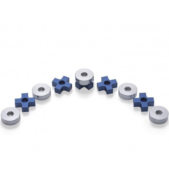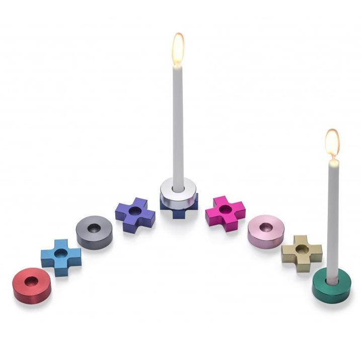 A classic game combines with a classic of Judaism to make these fun and functional Hanukkah menorahs. Ten brushed anodized aluminum Xs and Os can be set up however you like. The shamash "worker candle" goes in a brushed O that stacks securely on top of any of the other pieces, your choice, leaving you 9 total candle holders.