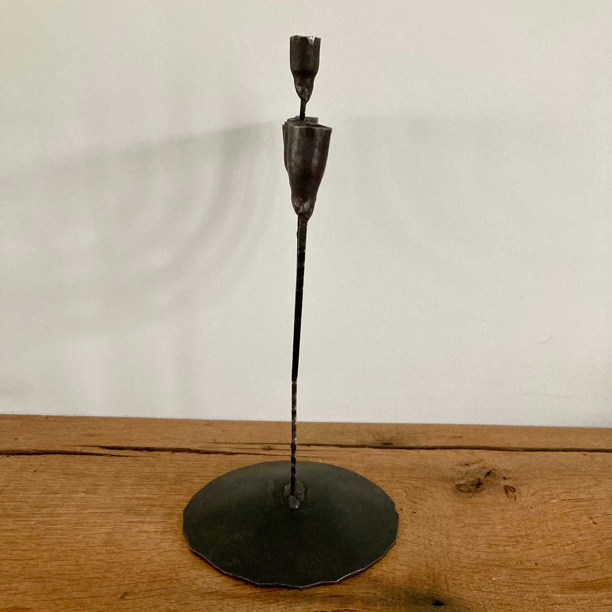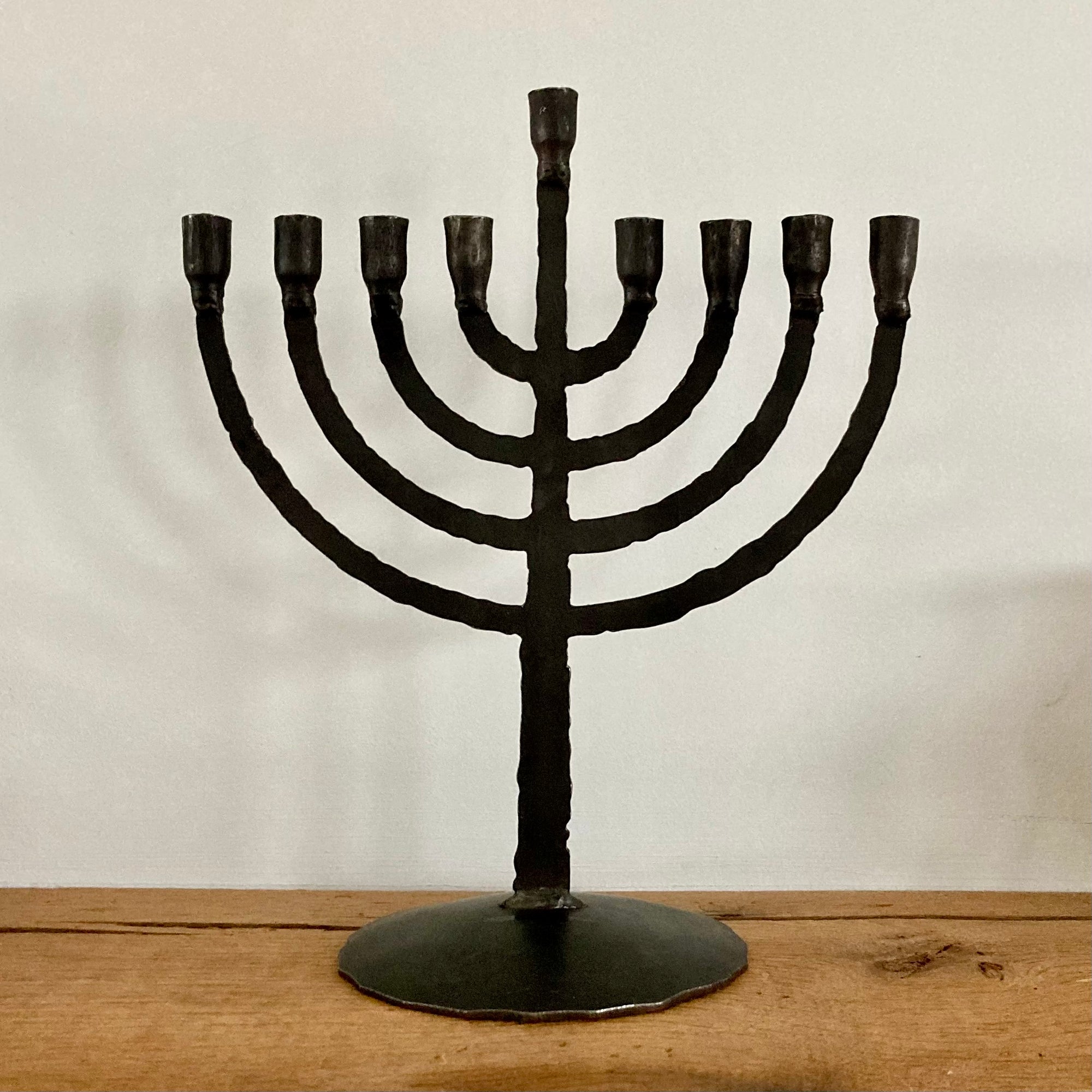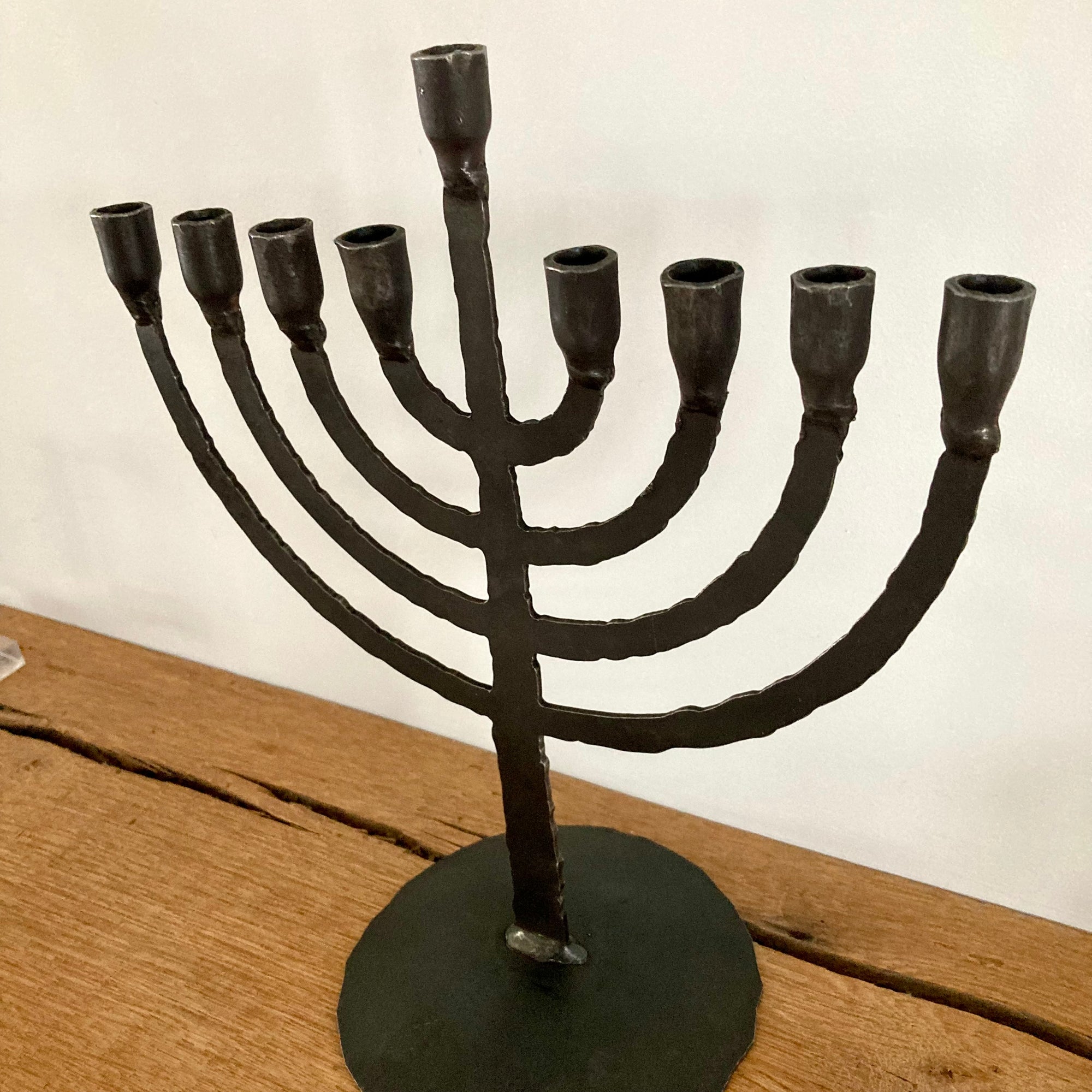 Heavy wrought iron is hand forged, hammered and shaped into this classically shaped Hanukkah menorah reminiscent of the original menorah in Jerusalem. Wrought iron gives the piece a more arts and crafts look, making this menorah a piece of functional art you should keep on display year round.