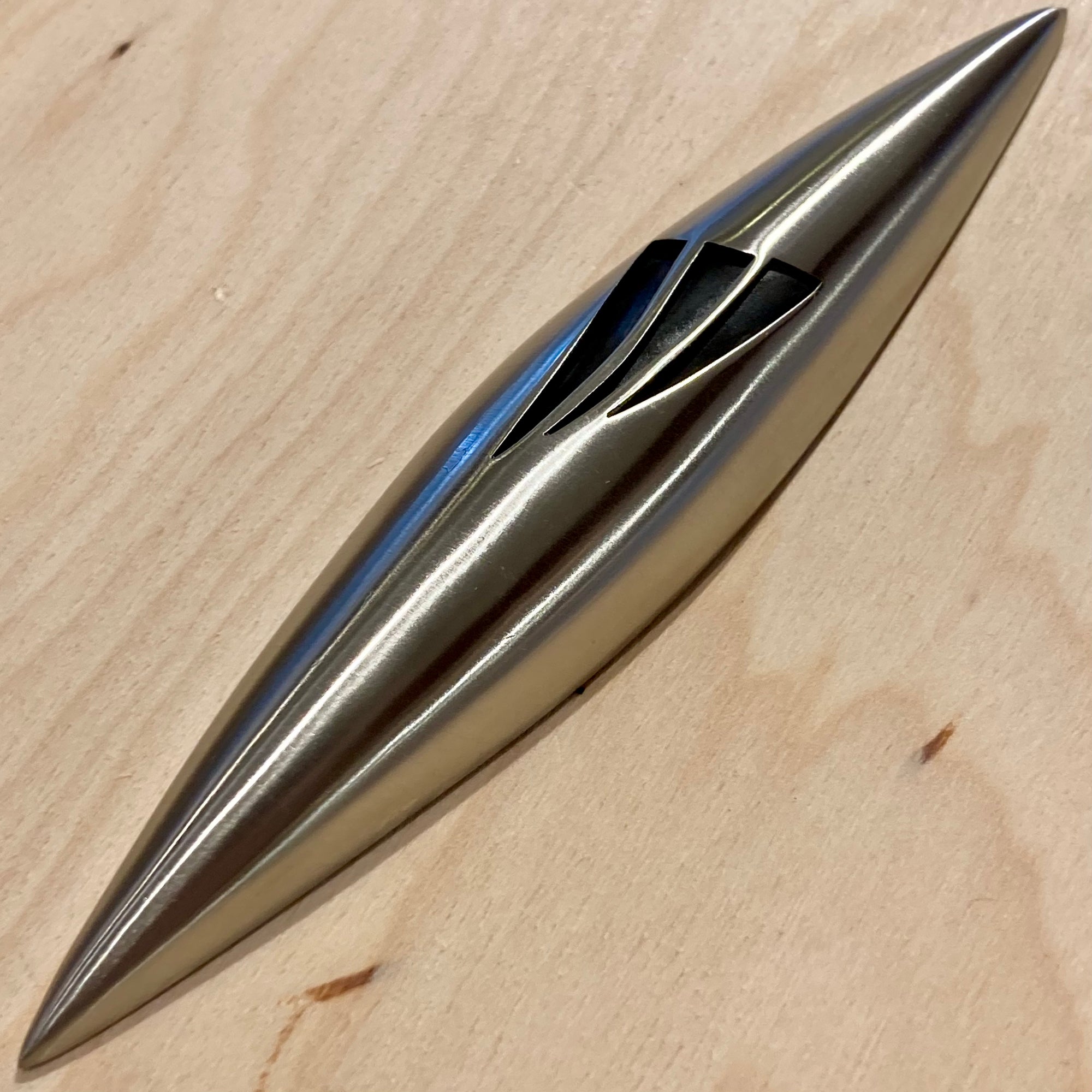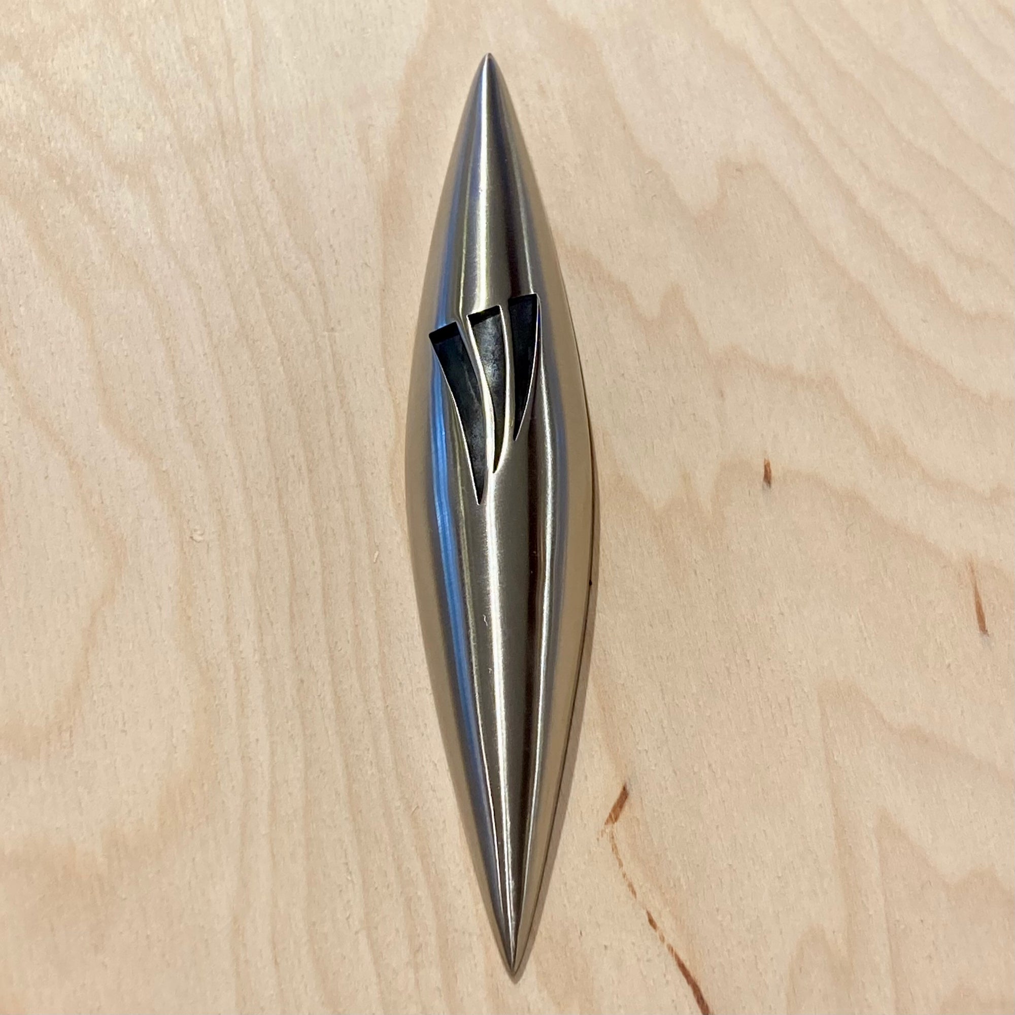 Hand shaped brushed metal has sweeping grooves cut into the face, evoking the Bauhaus modernist architecture of Tel Aviv where the artist lives and the swooping flames of a rocket launch into outer space, a major inspiration for the artist. This is the mezuzah we have in our own home.
