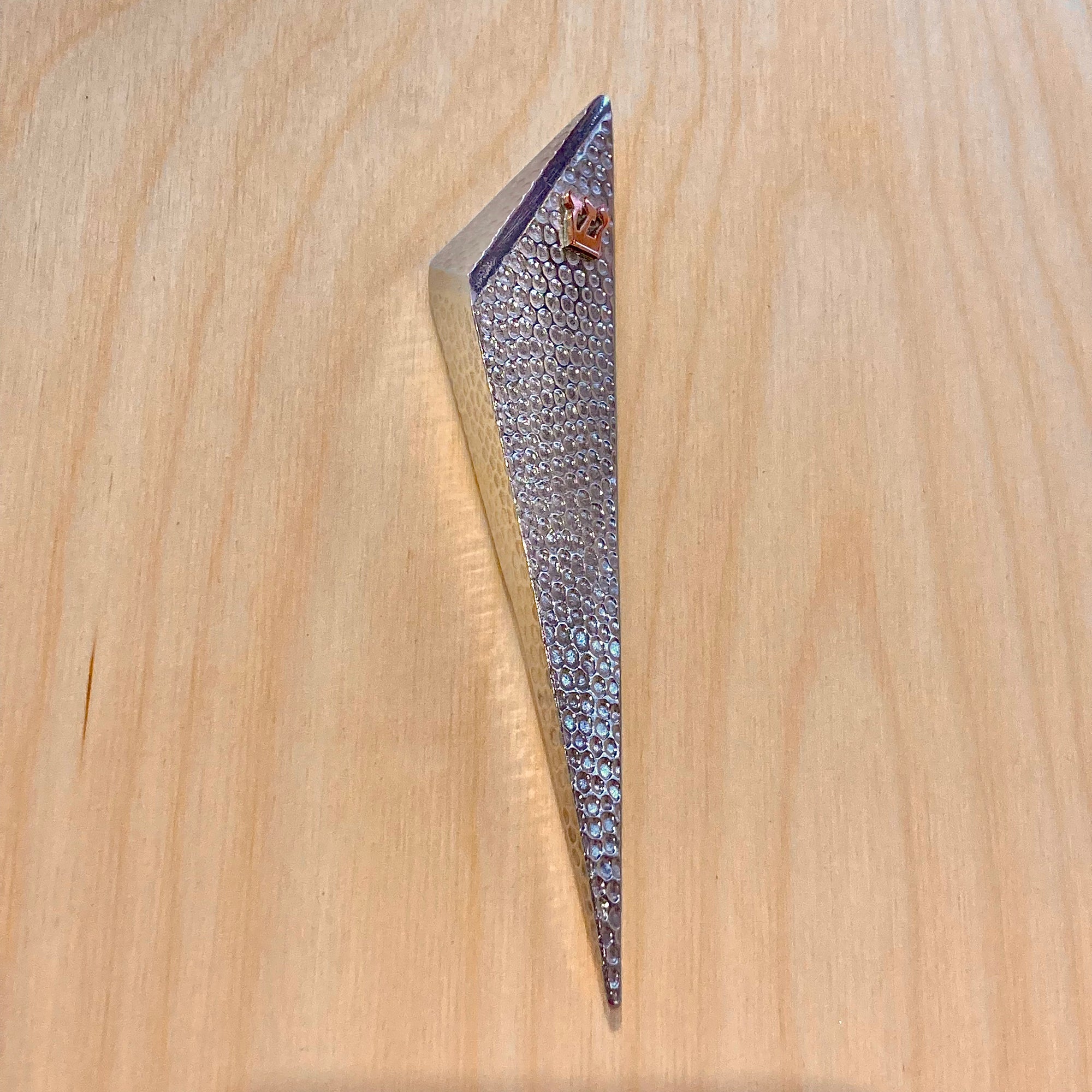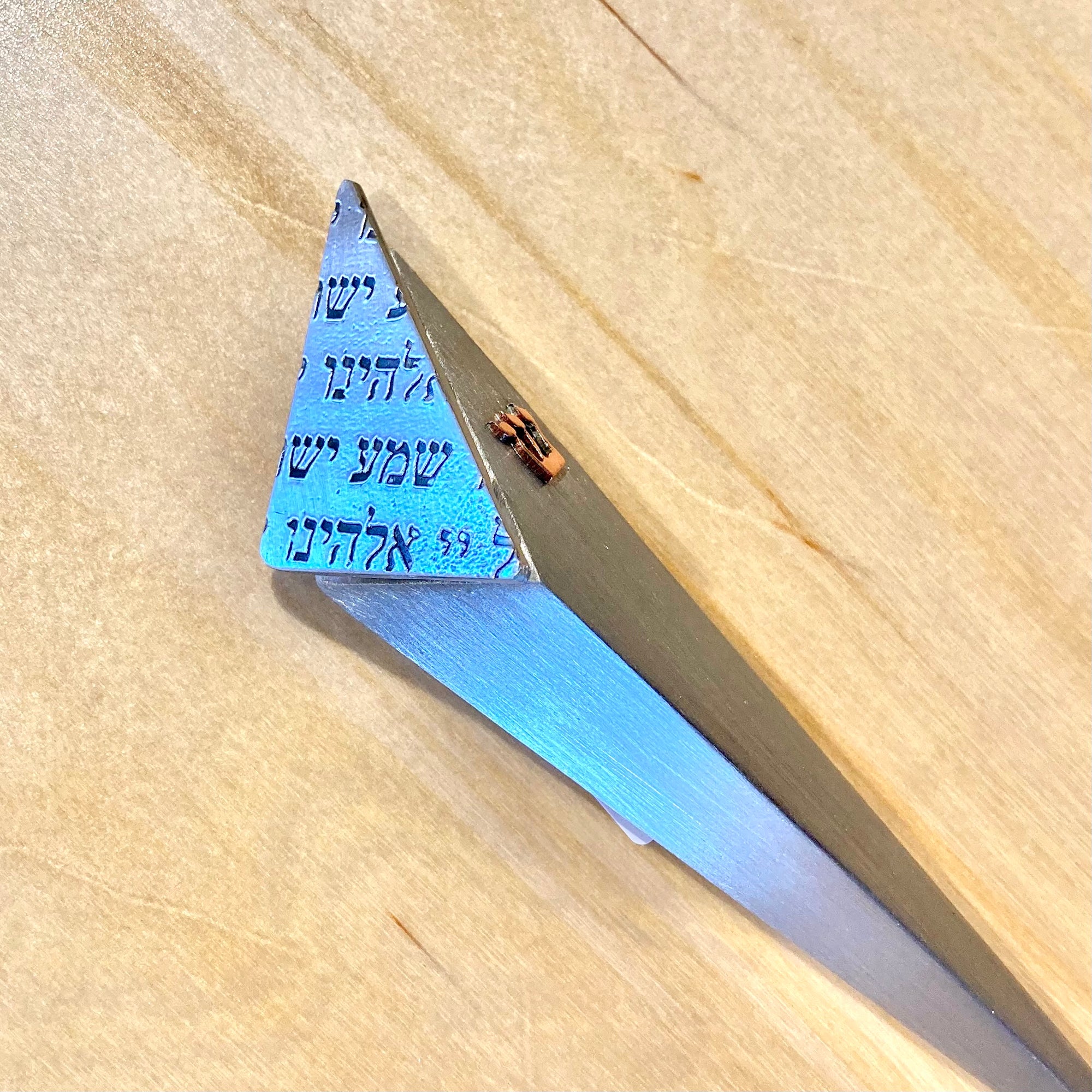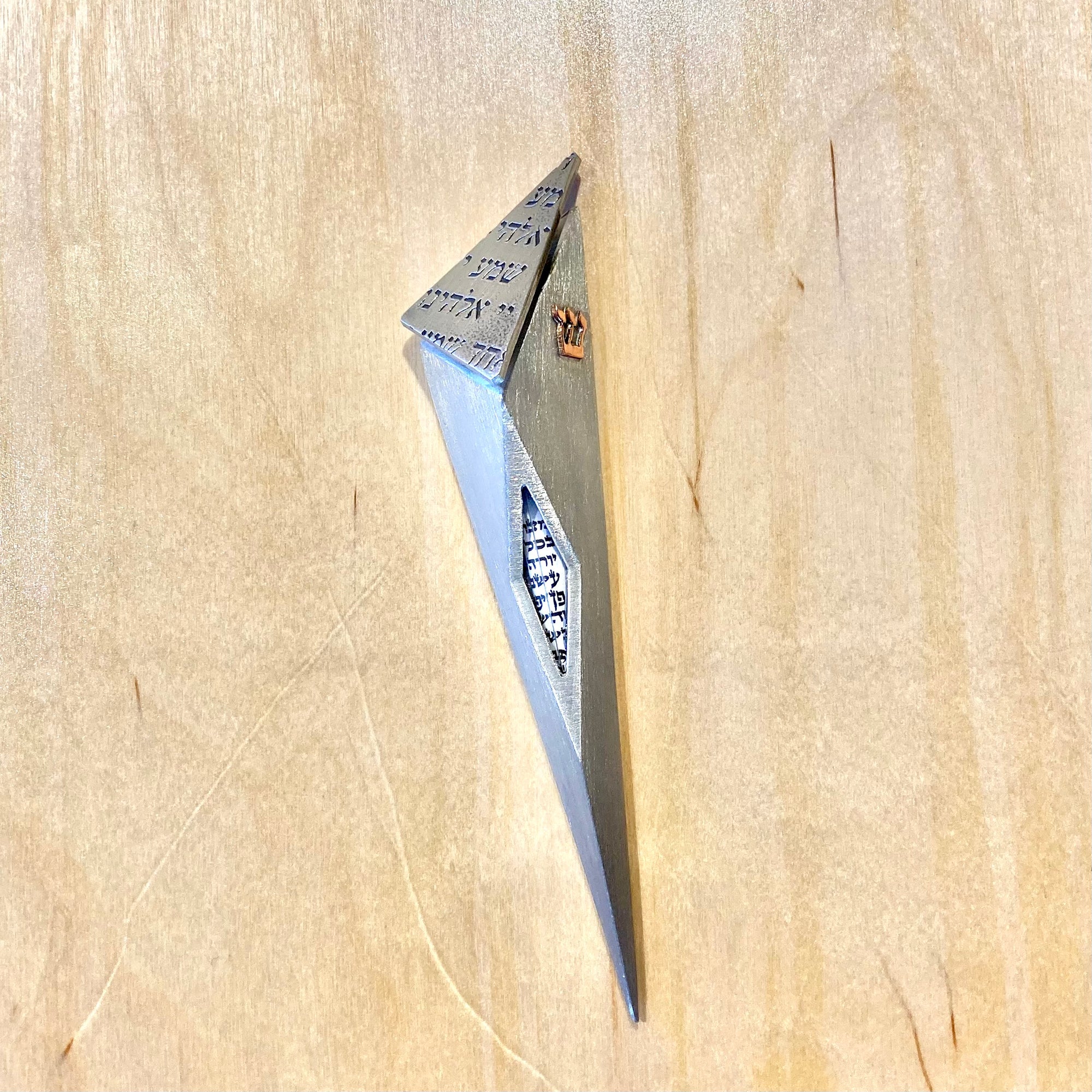 Brushed pewter is highly polished and sealed, so it is suitable for indoor or outdoor use, and accented with a brass "shin", the letter of the Hebrew alphabet that denotes the name of God. Available with simple brushing or swirl pattern, with a window or without, with engraved phrasing from "Shma" on top or without. "Shma" is the classic prayer of "Hear o Israel, the Lord is God the Lord is one" which is the prayer written on the parchment traditionally placed in a mezuzah.