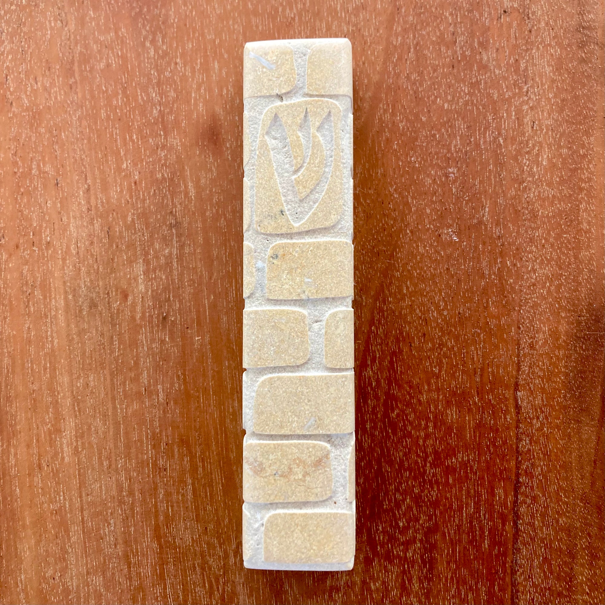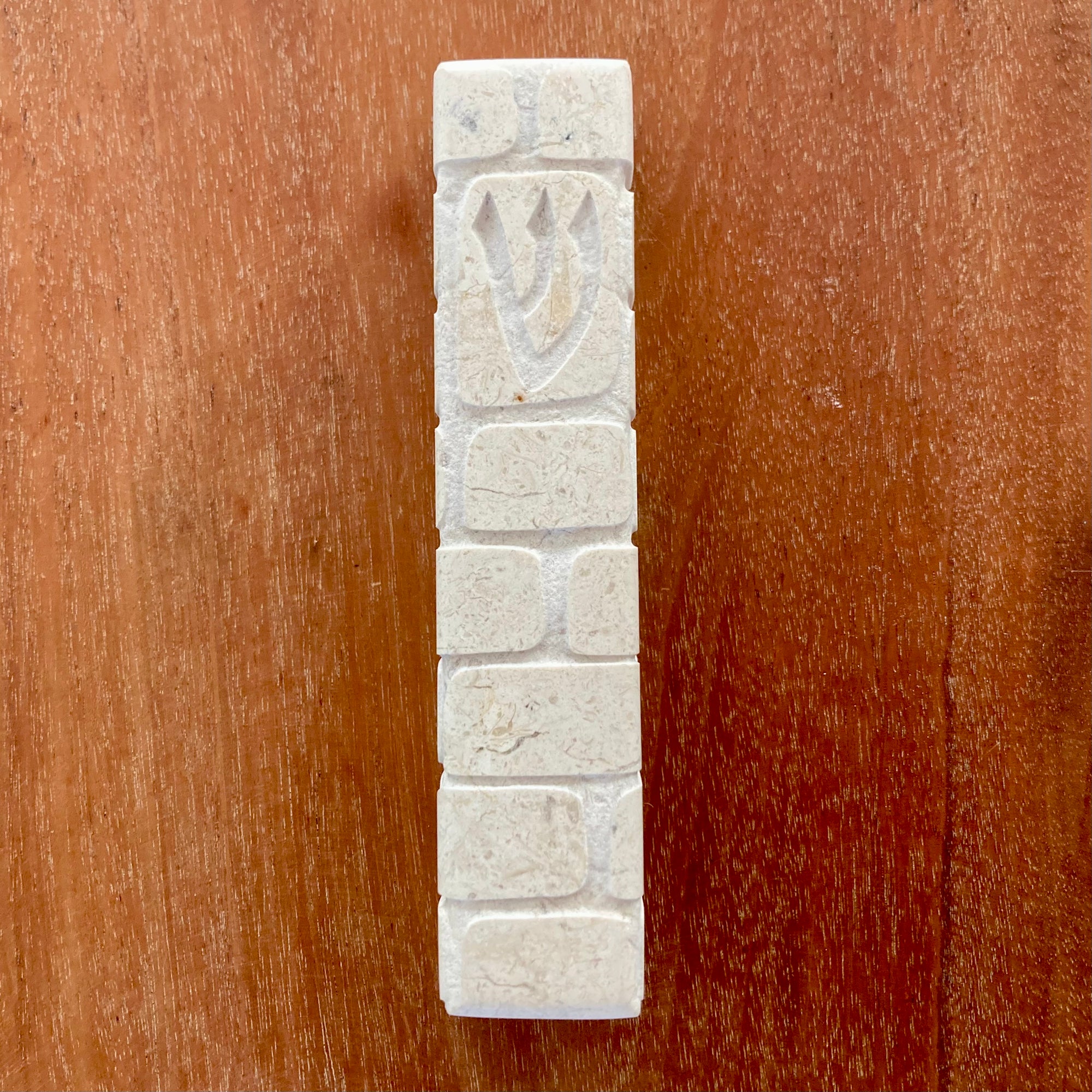A polished rectangle of Jerusalem stone in two different classic colors is incised to look like the walls of the Old City and has a "shin" incised on the face.