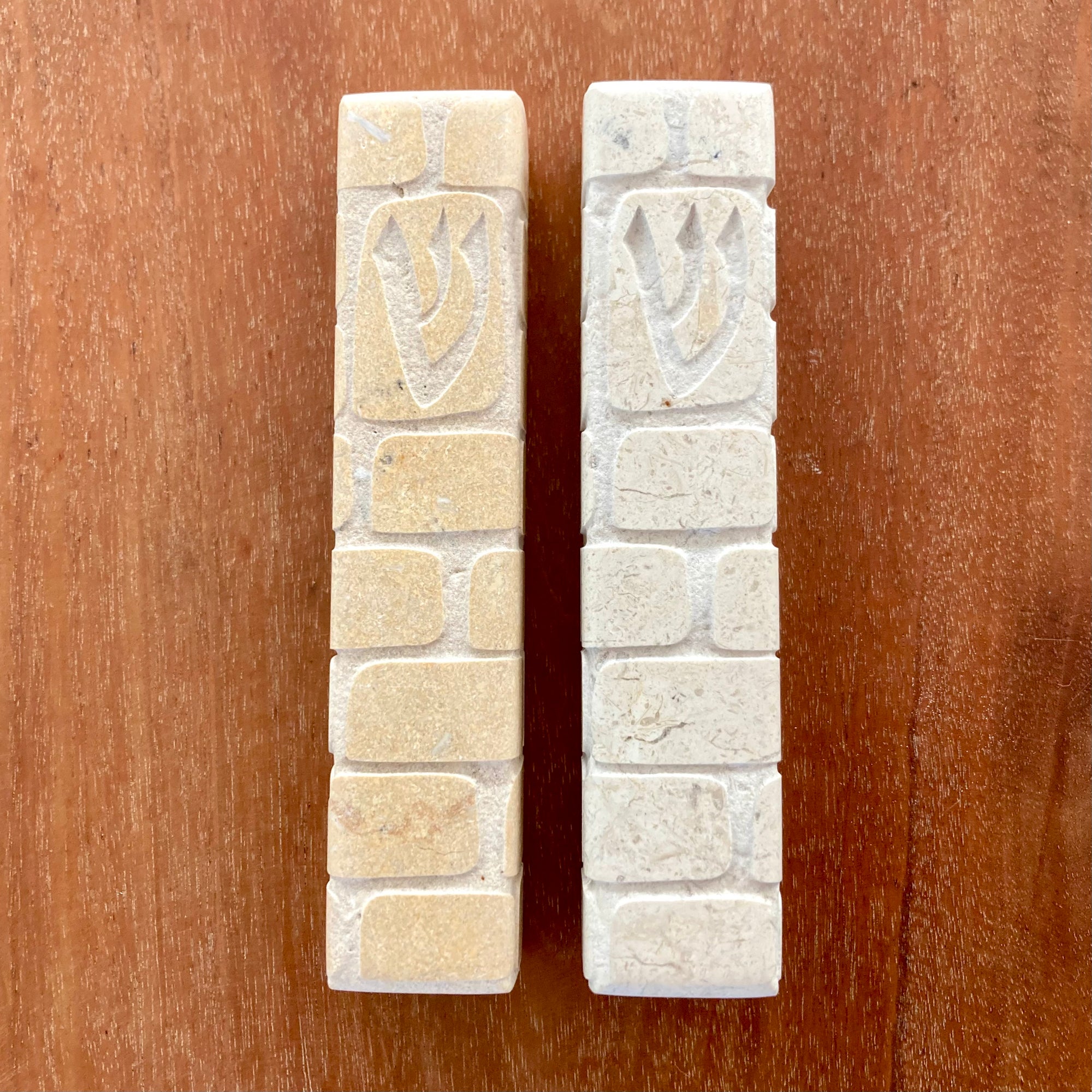 Purchased in the Jewish Quarter of the Old City of Jerusalem, these classic mezuzah cases are made entirely of Jerusalem stone, a particular type of sandstone found in the Judean hills. Virtually every building in Jerusalem and many buildings across all of Israel are clad in this stone.