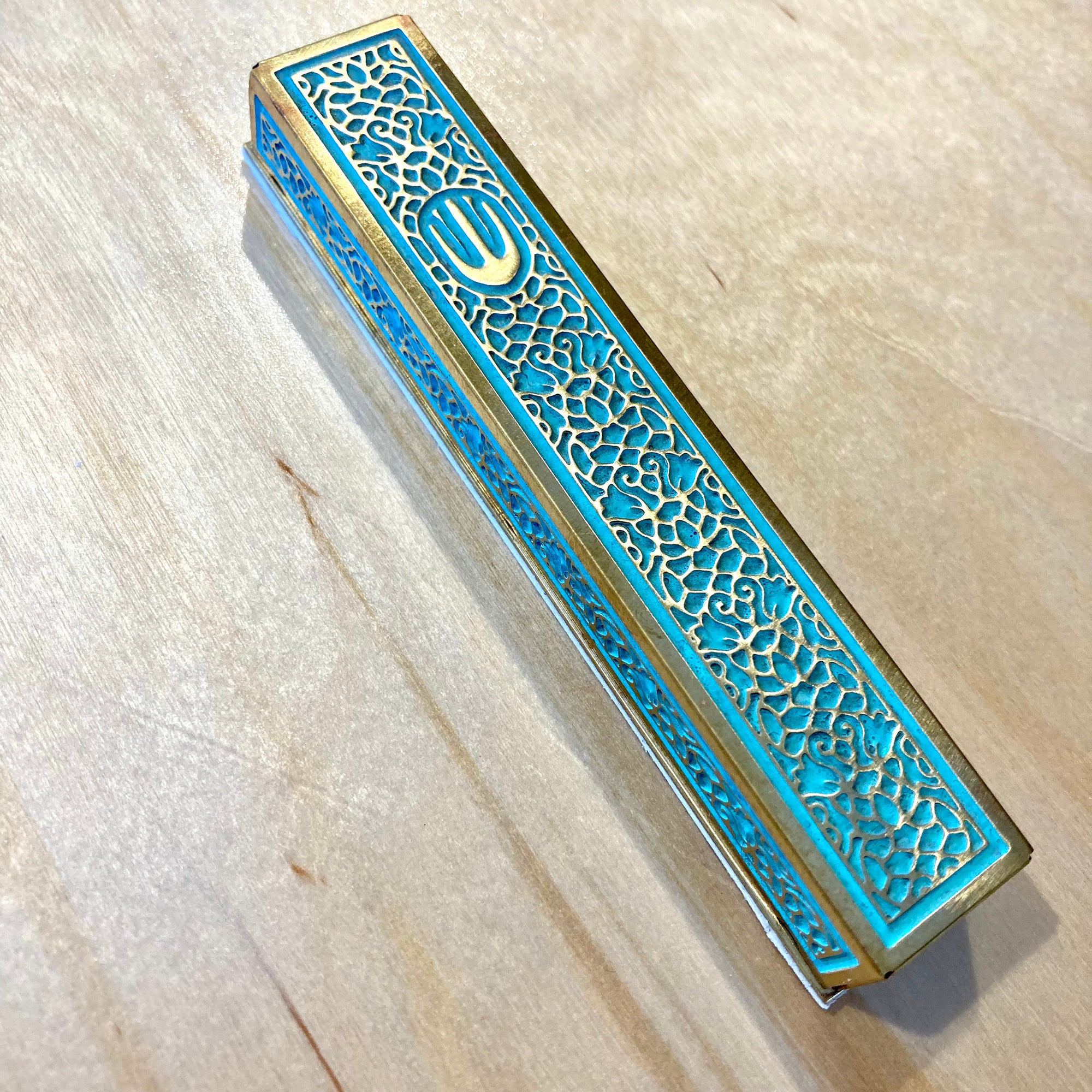 Available in blue or turquoise, in either open style (for indoor use only) or closed style (indoor or outdoor). The letter Shin on the closed options symbolizes both the Shma and the first letter of one of God's name in Hebrew.