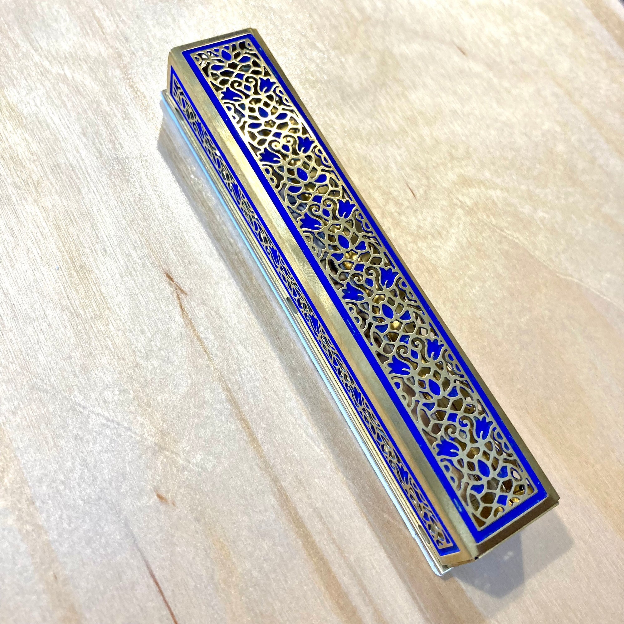 Elegant, traditional Middle Eastern patterns are incised into polished brass, with delicate flowers, leaves and trim highlighted in enamel on this mezuzah.