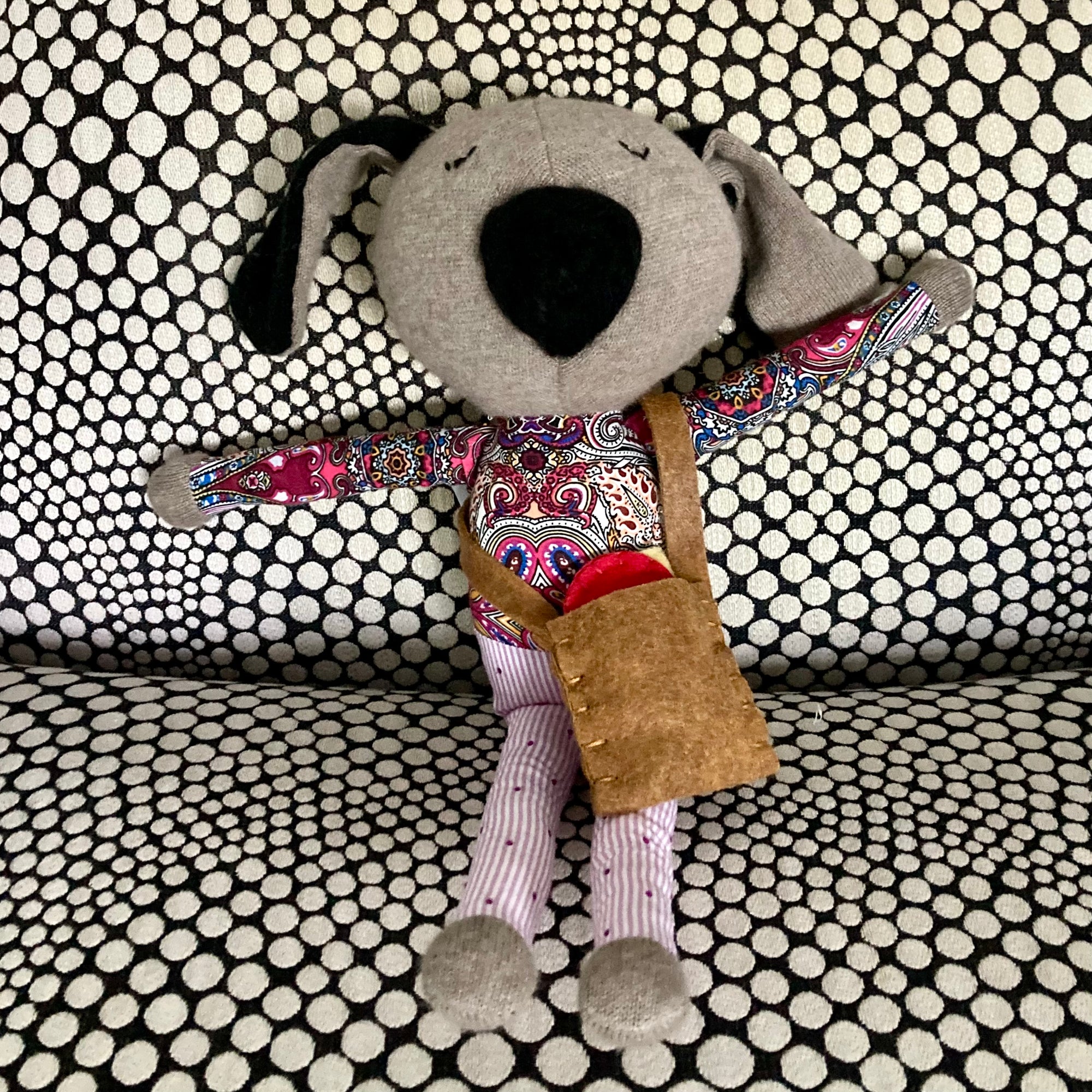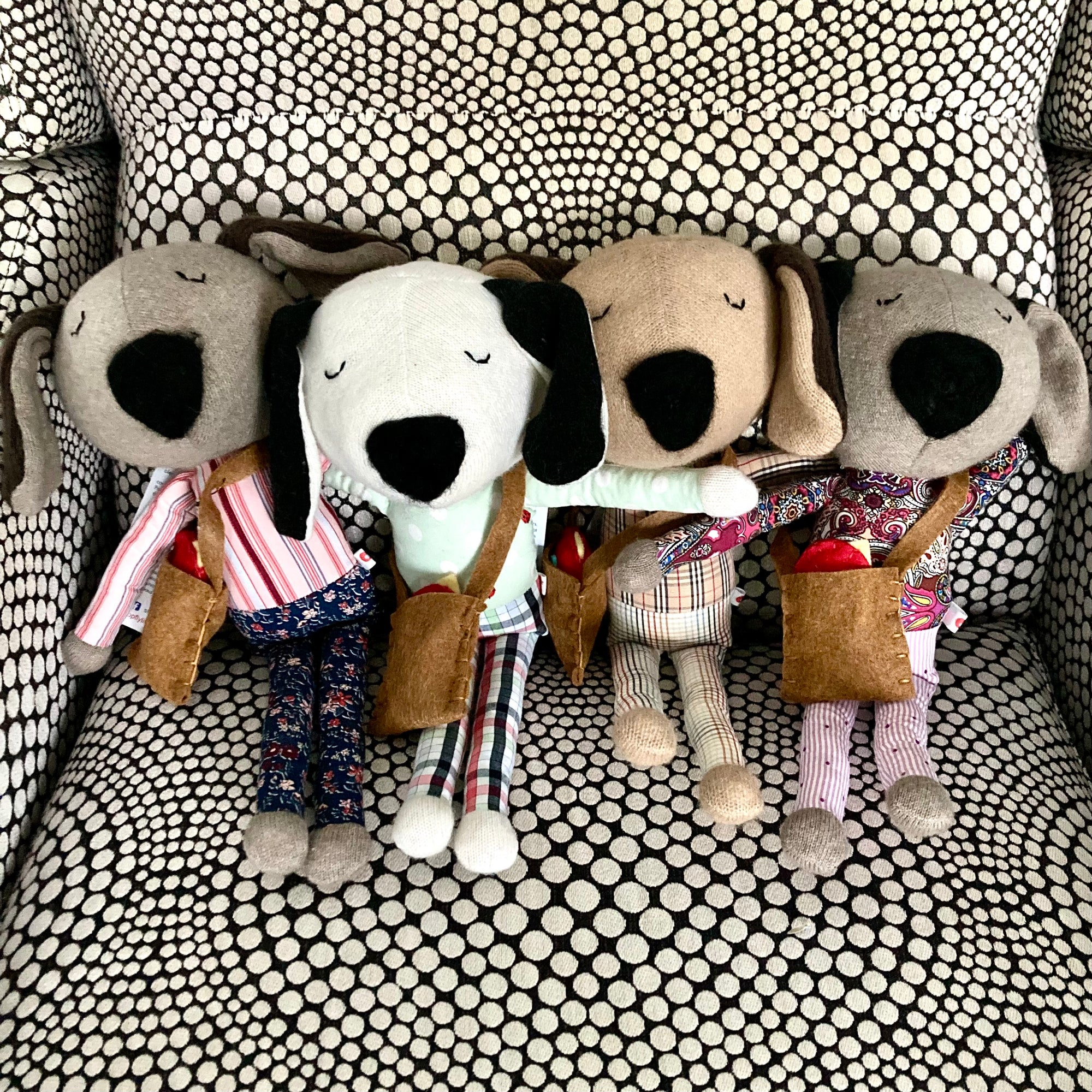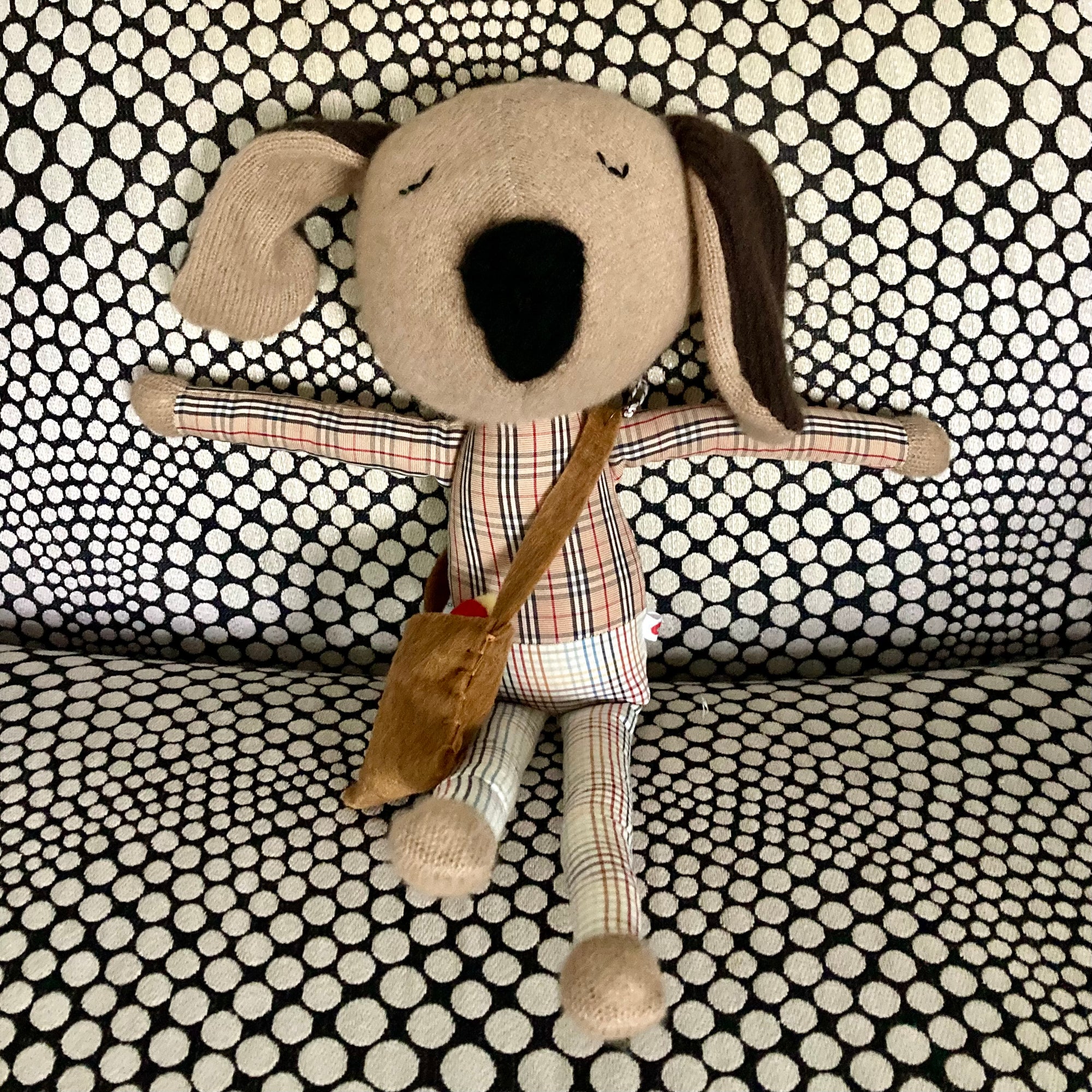These adorable puppies are covered with gently used, cleaned and upcycled clothing; the bodies are covered in highly patterned cotton shirting fabric, and the head is oh-so-soft cashmere sweaters with super soft floppy ears.